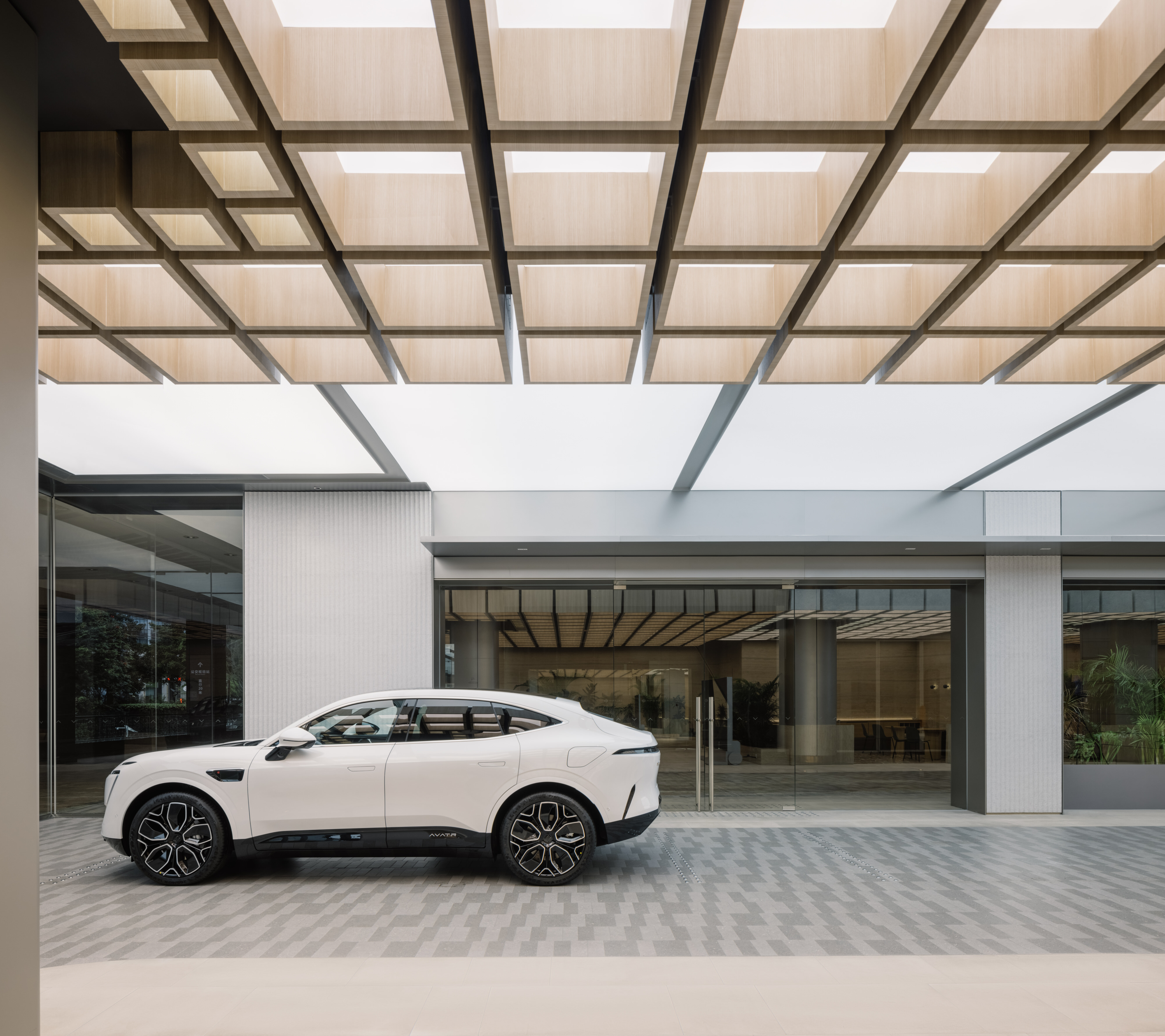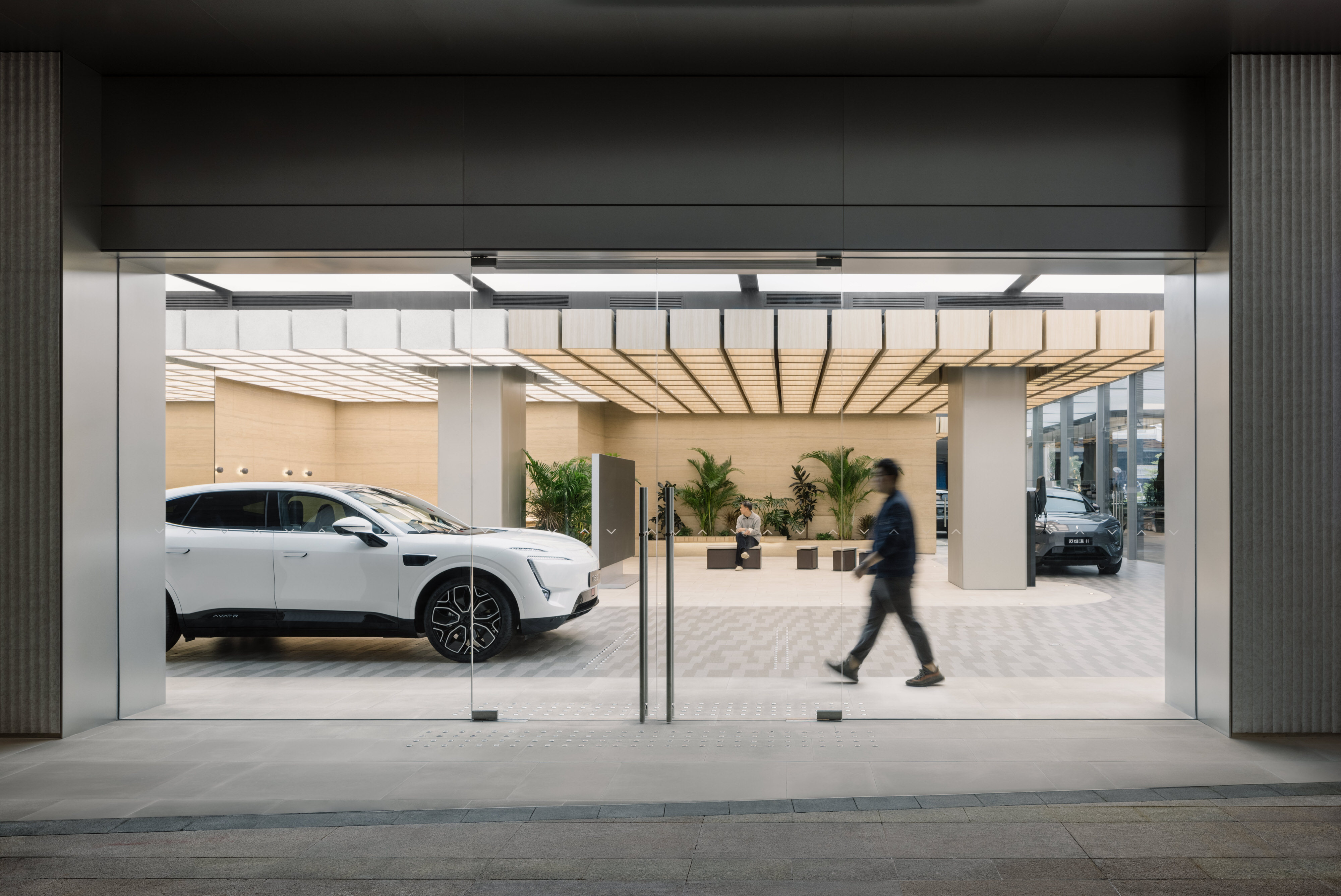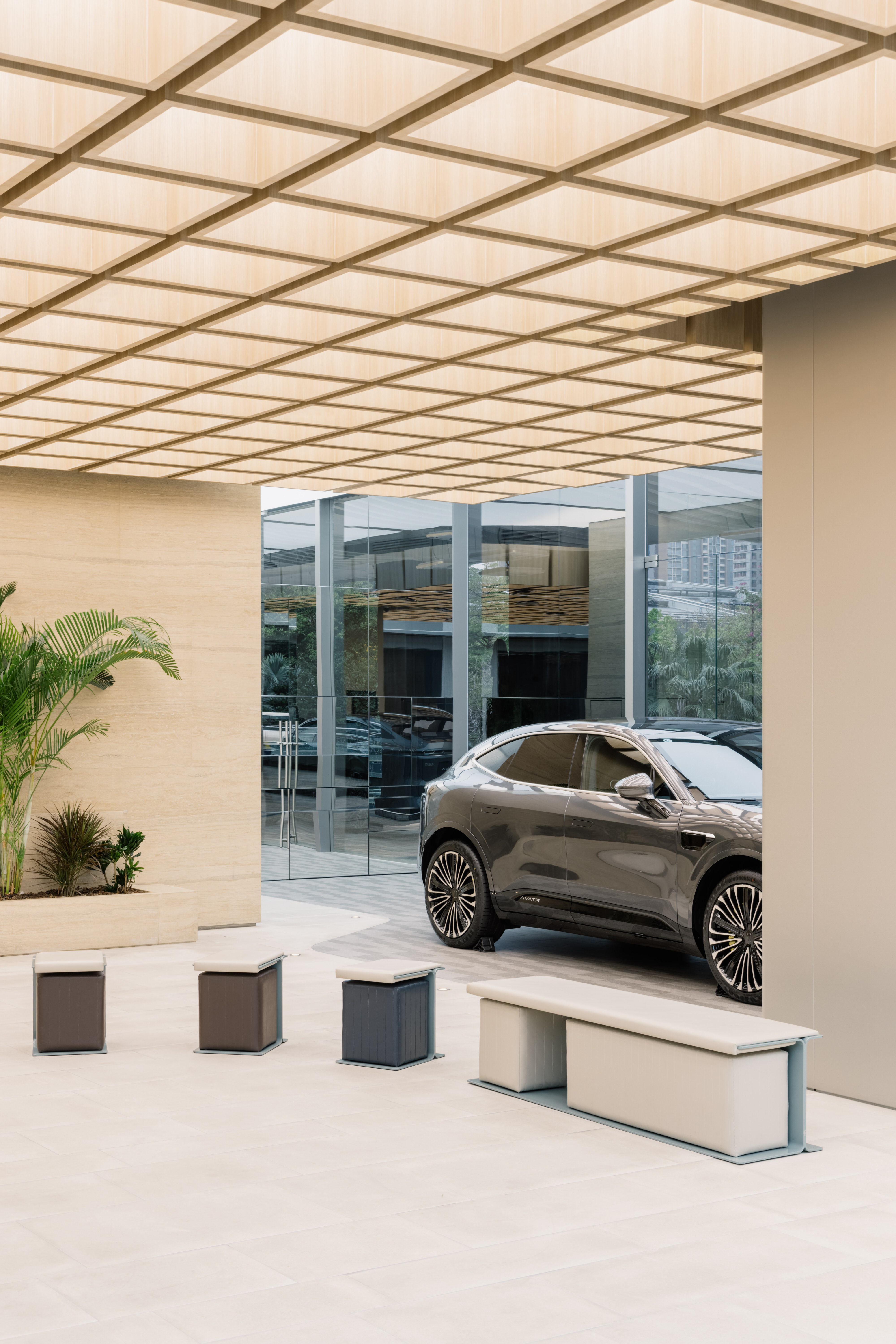 Every Avatr experience consists of the same elements — a blend of city and nature. Curves and off-grid palette set a naturalistic undertone. Wooden canopy modules hover over the mini plaza, where wavy travertine walls and plants breathe a park vibe. Round corners and smooth floor lines soften the cars’ machinery essence.