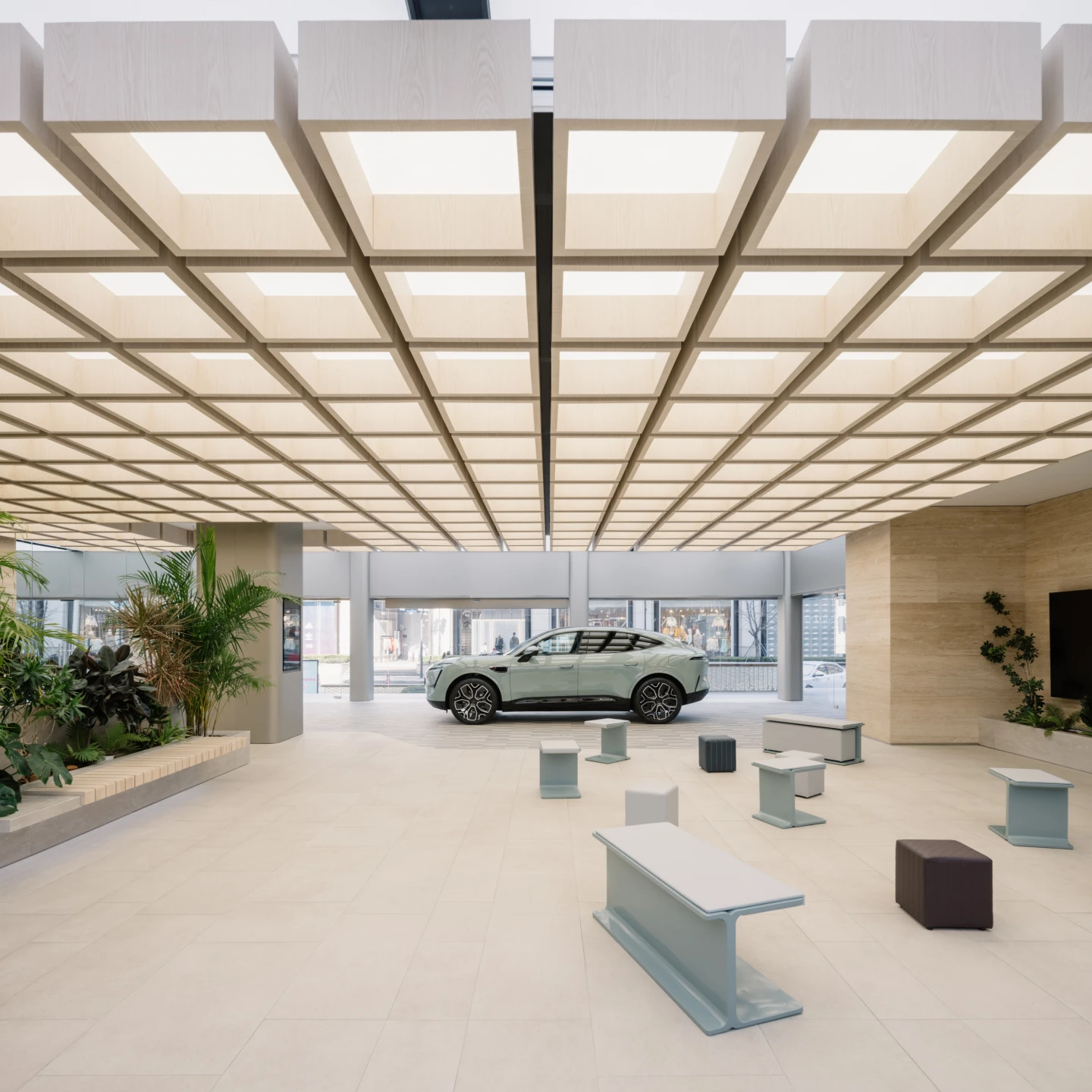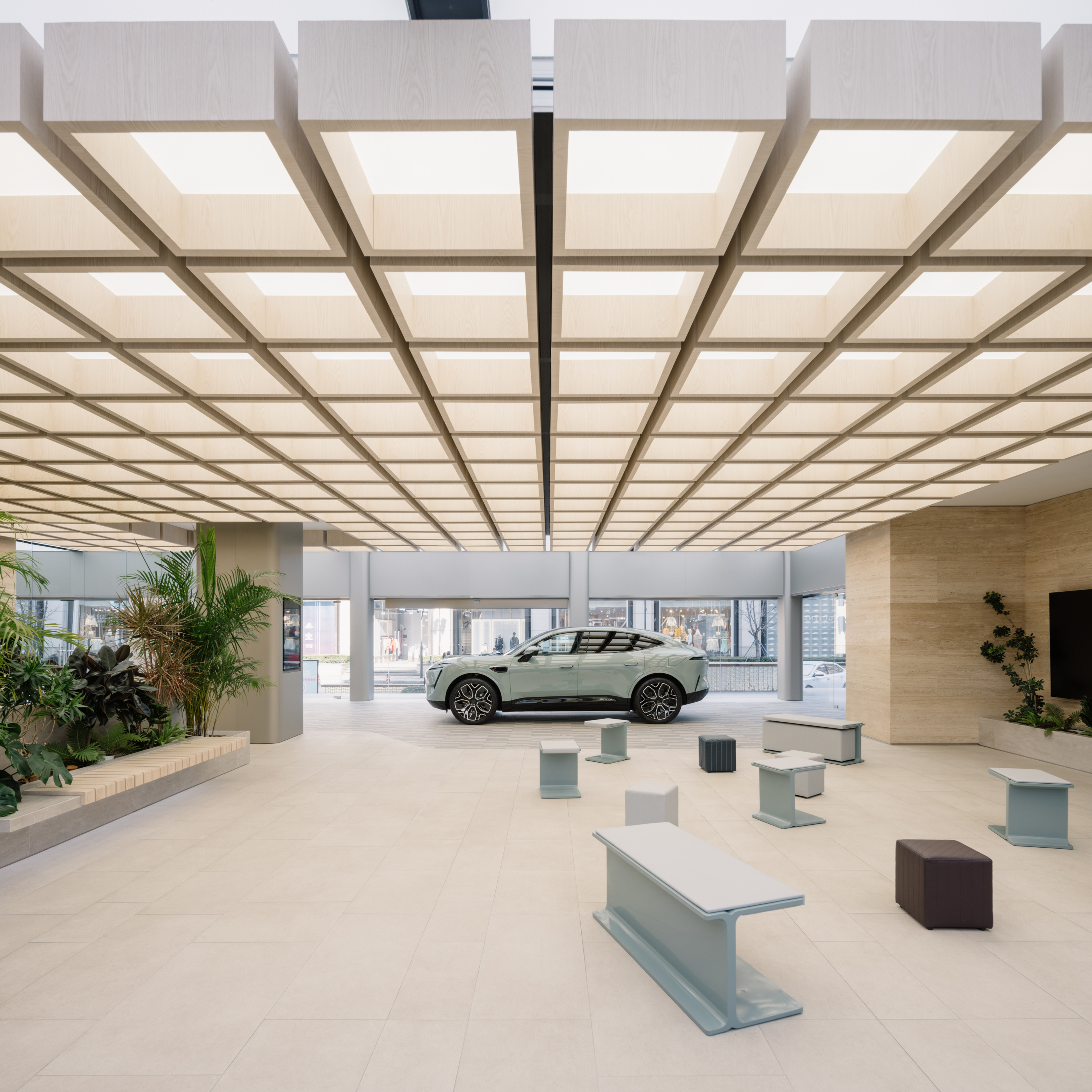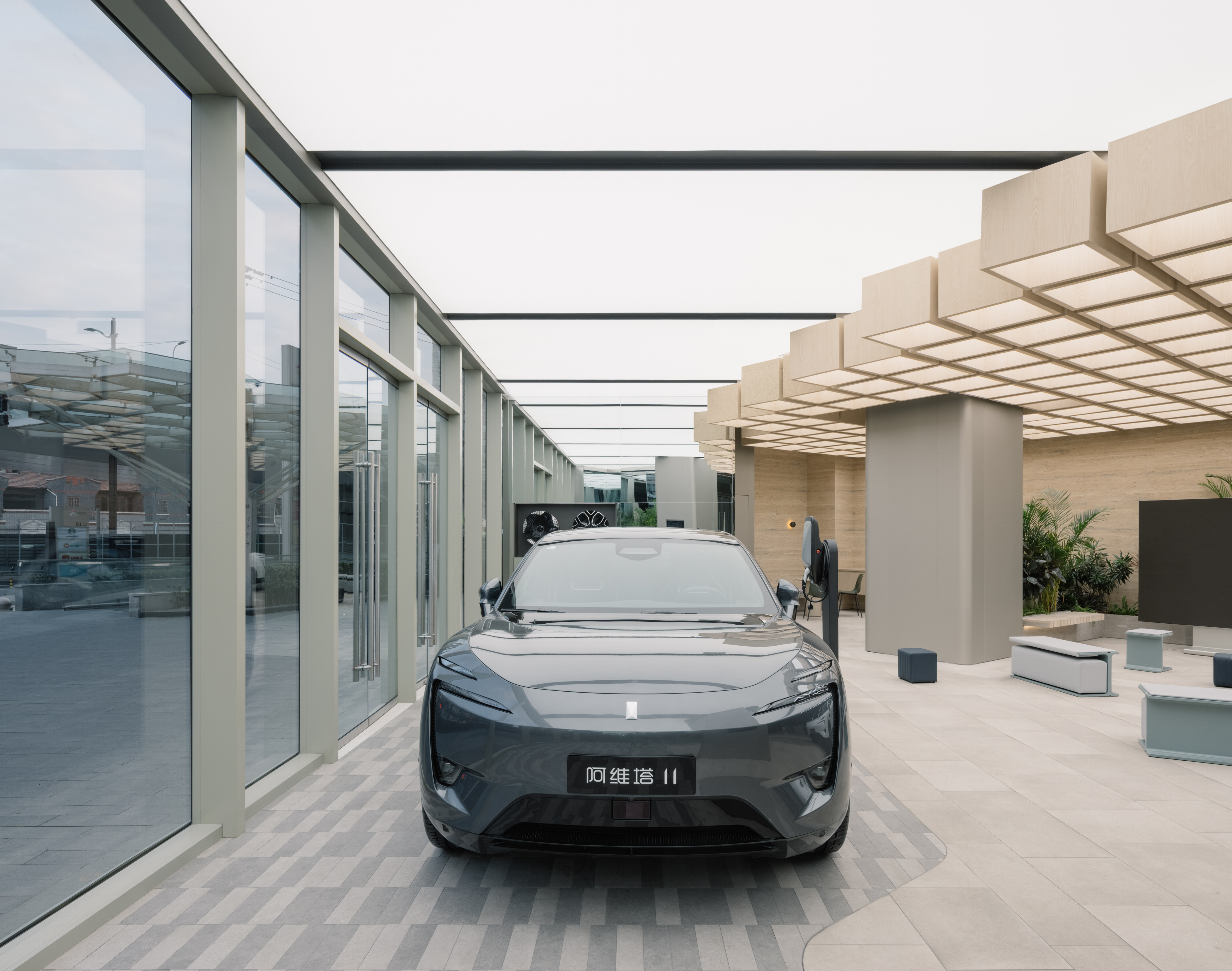 Every Avatr experience consists of the same elements — a blend of city and nature. Curves and off-grid palette set a naturalistic undertone. Wooden canopy modules hover over the mini plaza, where wavy travertine walls and plants breathe a park vibe. Round corners and smooth floor lines soften the cars’ machinery essence.