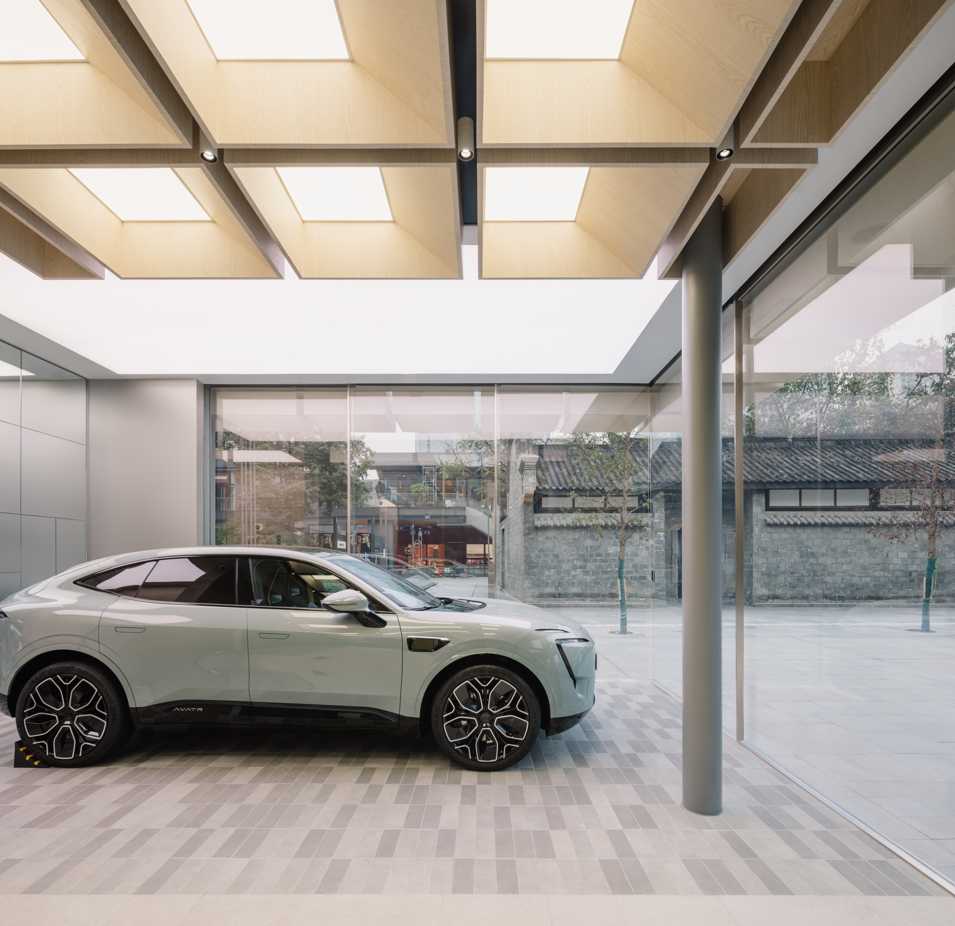 But it isn’t just about the look. The boulevards, also set hidden guidelines from which designer can methodically derive the entire spatial program for varying site conditions. Cars are parked here for display and as one of the first contact points. A mini plaza shaped by the street draws people in to dive into details and join Avatr community events.