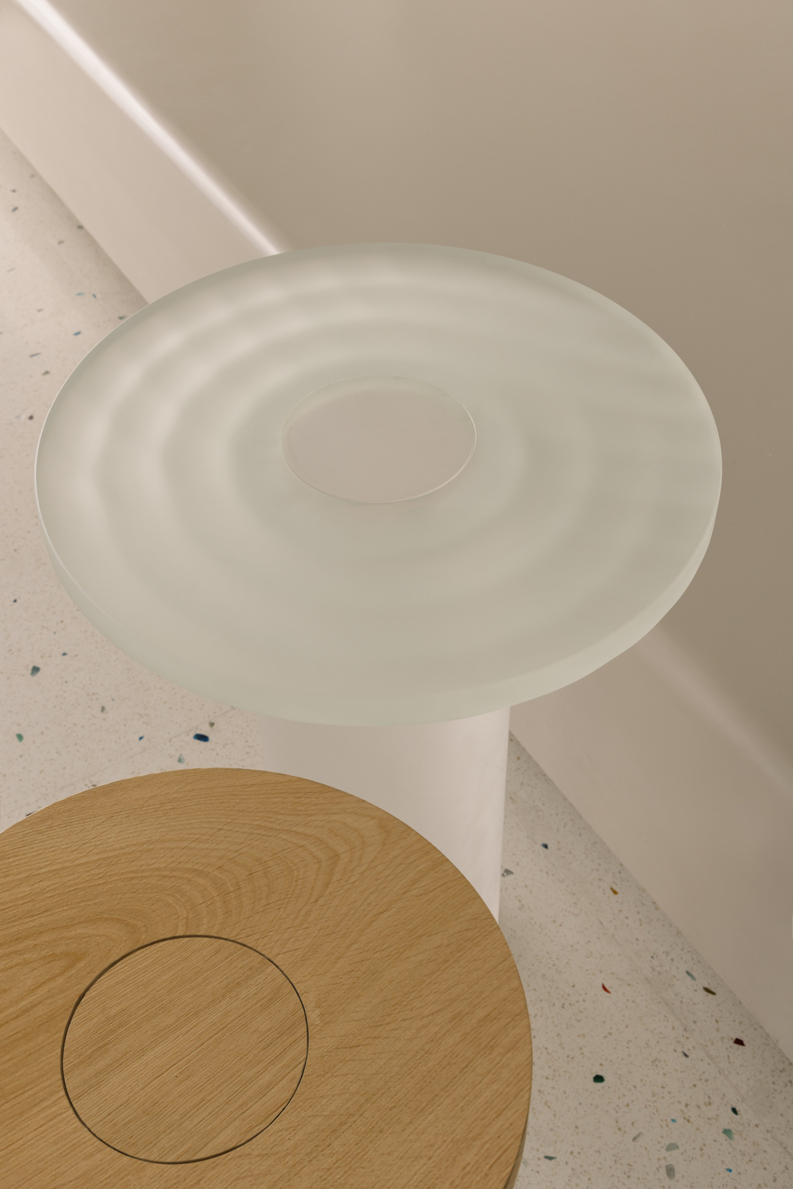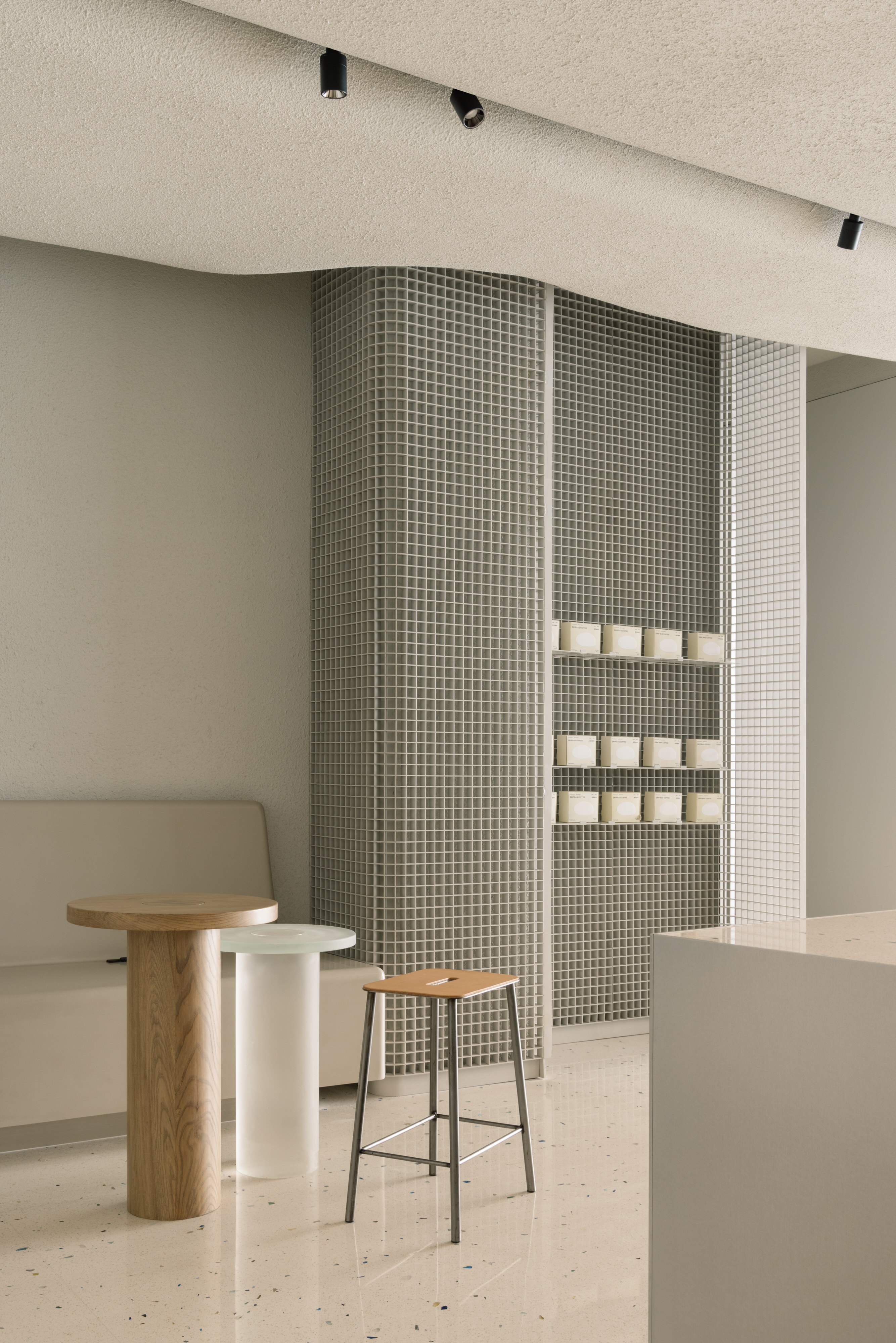 These bespoke tables, alternated by sizes and heights, are finished in acrylic with warm oak and the brand's pale green and. Stools in tan leather and raw steel from FRAMA are selected for their "super-normal" expression.The simplistic forms of the furniture, along with the pastel colours help put together an out-of-the-world experience, a quest for coffee by the nonchalant but lighthearted within their own realms.