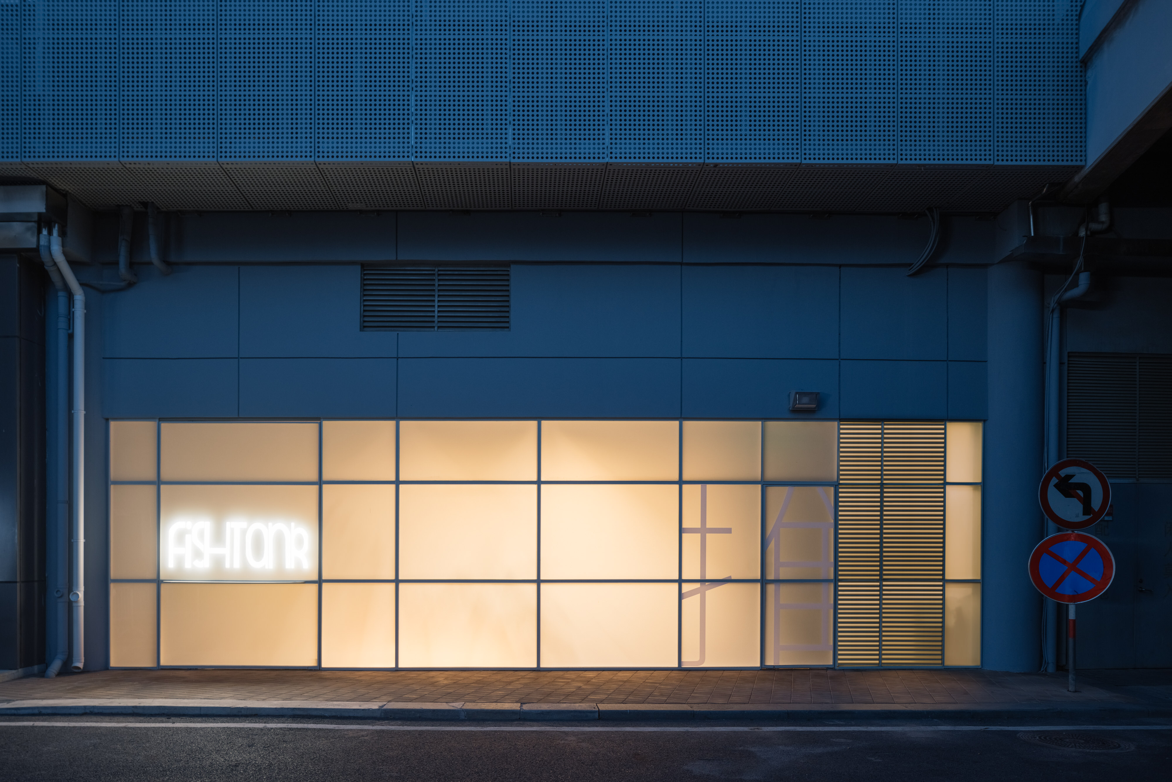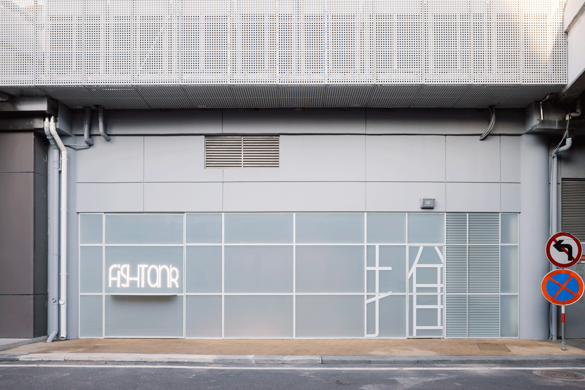 Fishtank is not your typical cafe location. Tucked inside an arena in Nanjing, the site was previously a storage room. It sits between two overhanging bridges, faces a four-lane ring road, and looks across an under-podium parking zone. The facade was essentially the arena's exterior, painted cold grey, with black recess lines and punctures for service vents.