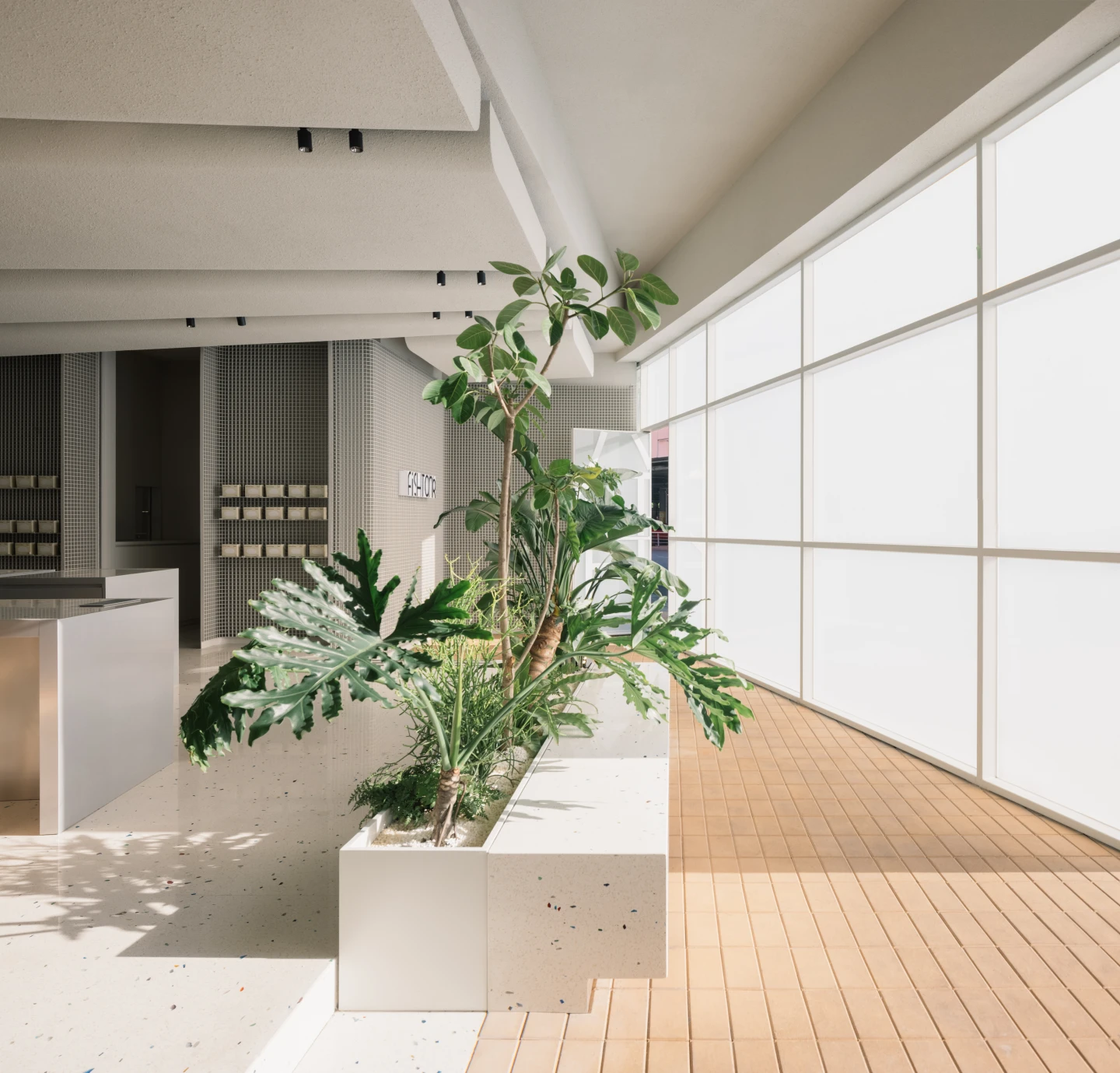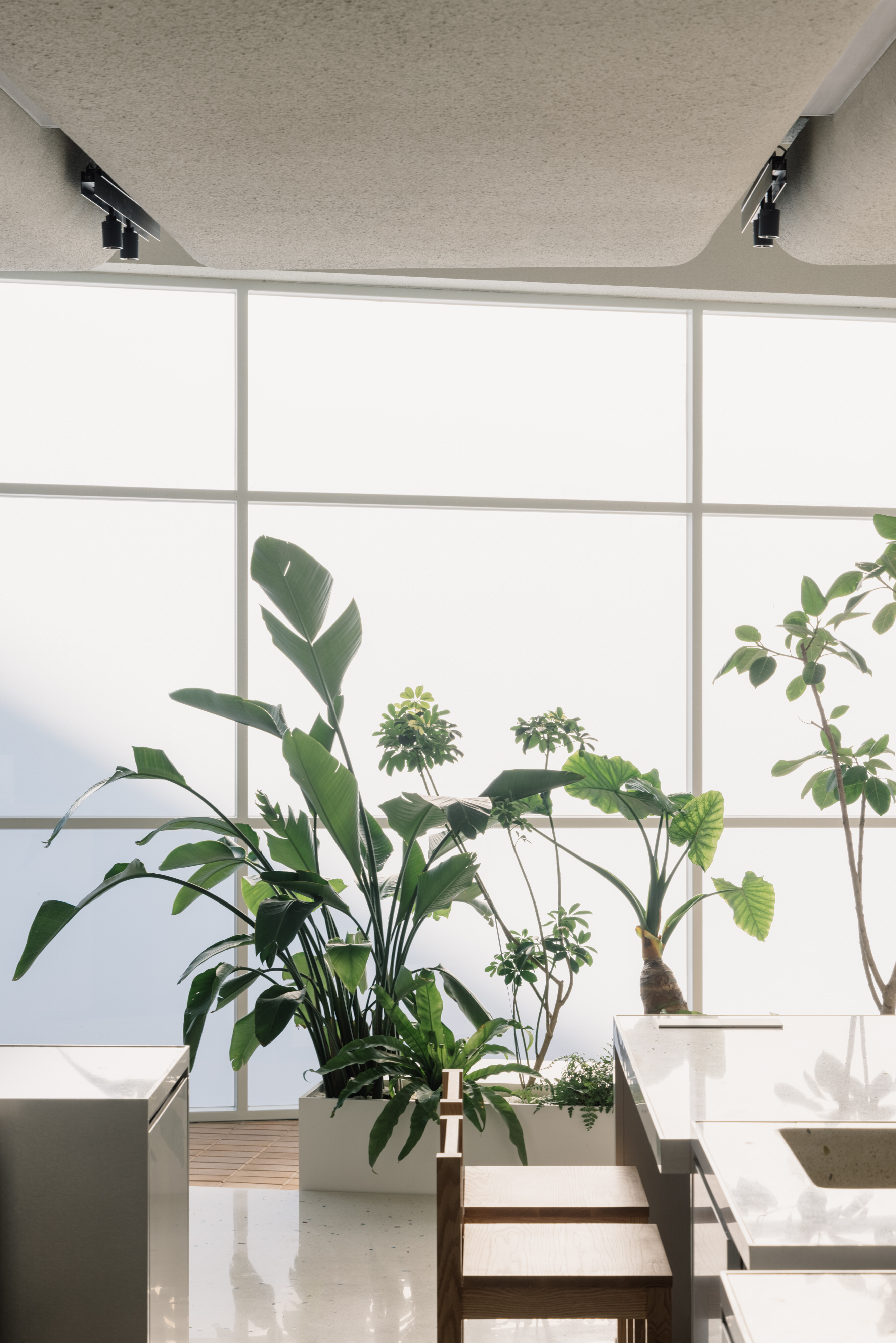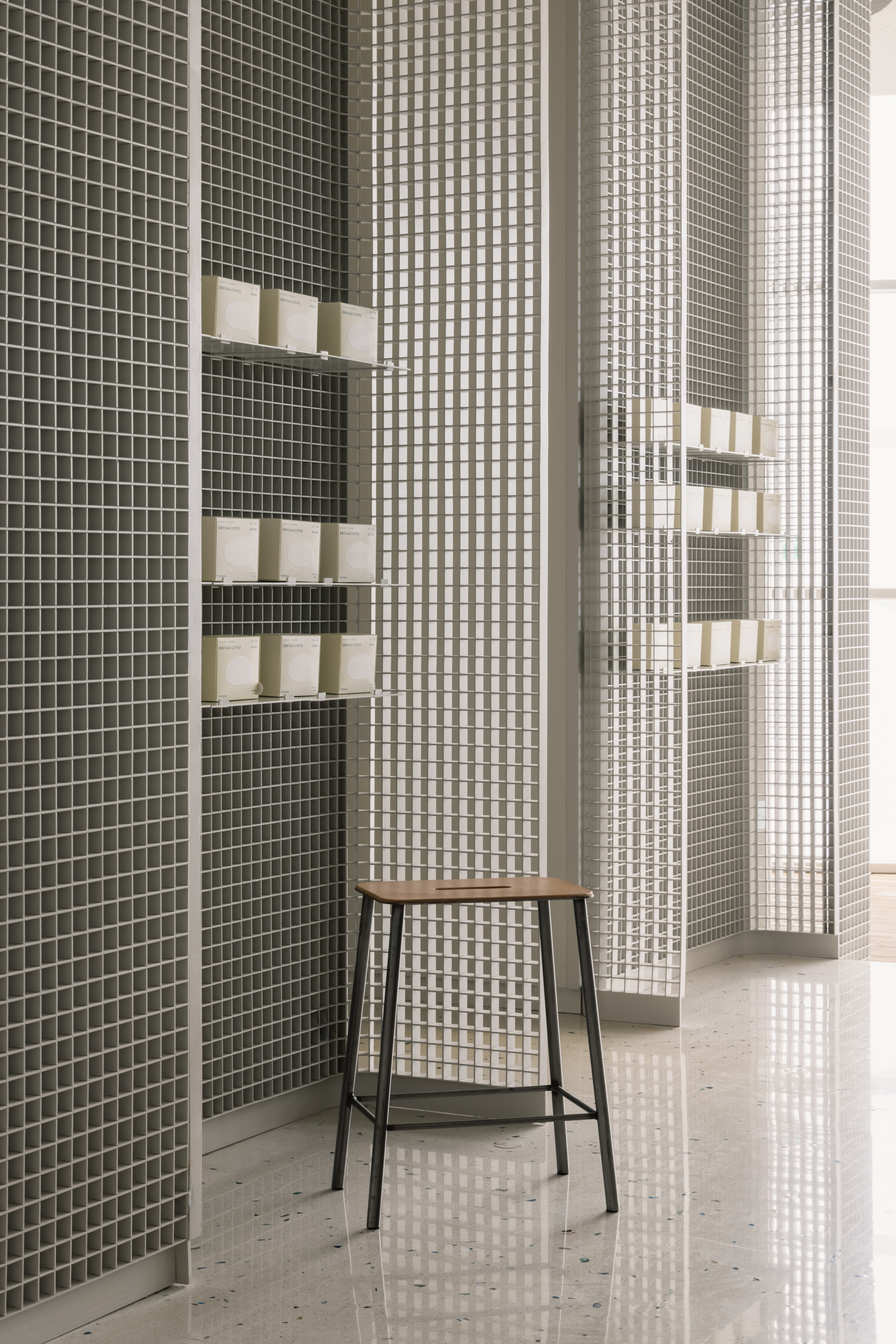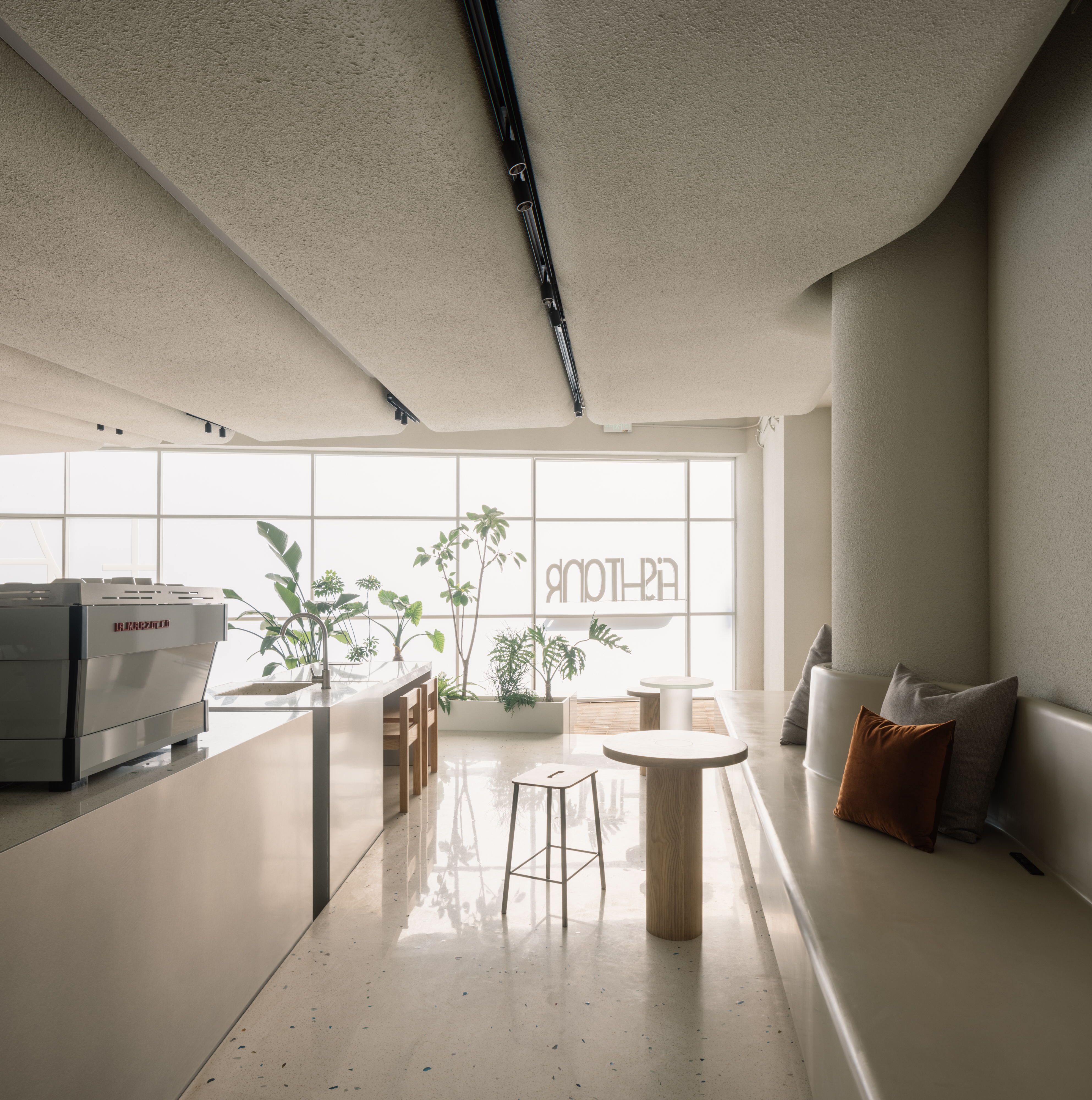 A plant box of various greeneries freshens the shop, welcoming patrons with a touch of life. The interior contrasts against the chaotic concrete city on the outside with a colour-speckled soft white terrazzo floor that calms down and brightens up most of the footprint.