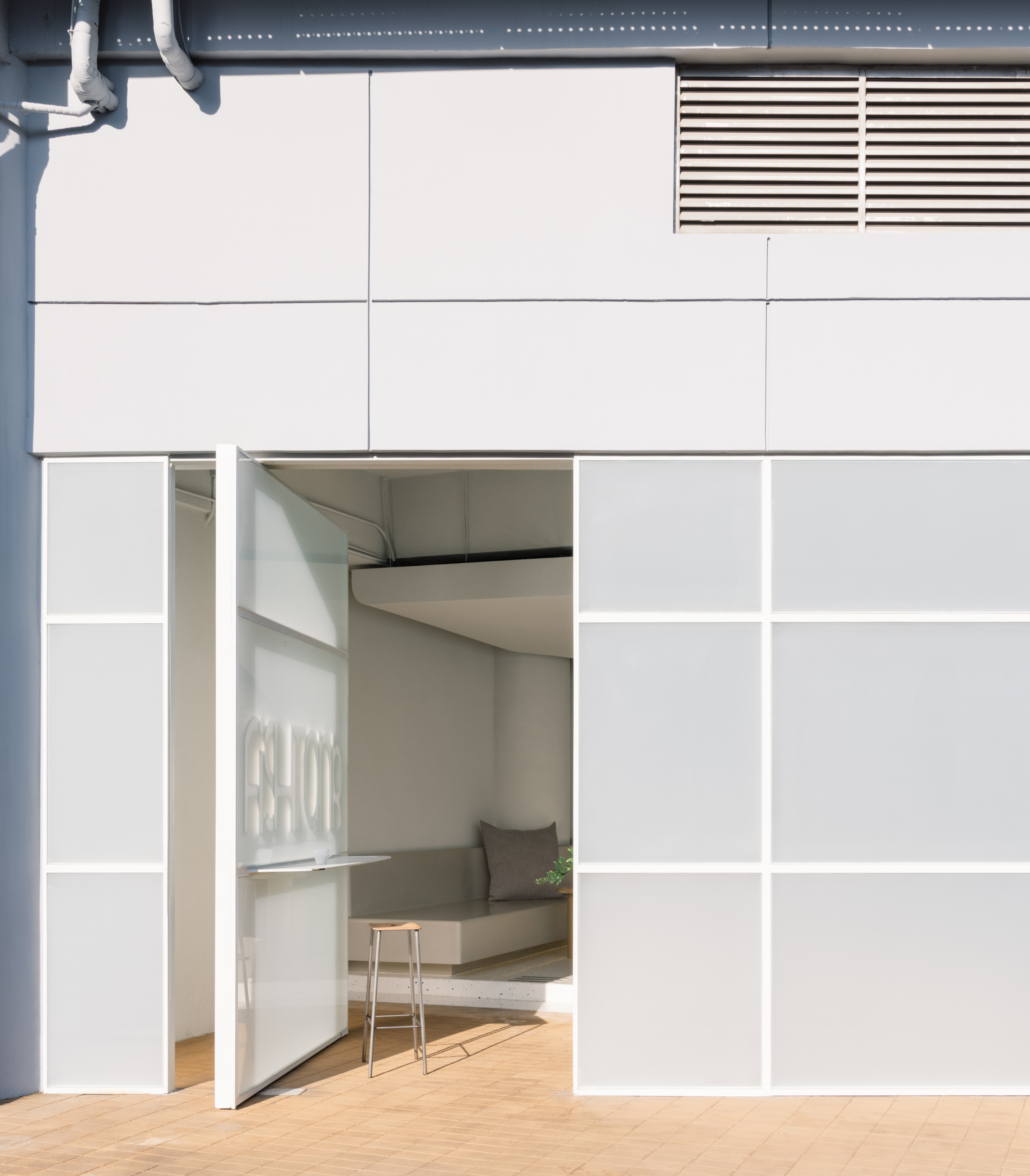 The outer and inner worlds isolate one another by a glass facade. It lightly brightens up the spot and hints at the grid lines of the pre-existed panels. What once was a vent becomes the "exit door”, leading one from the outside world into the one inside.