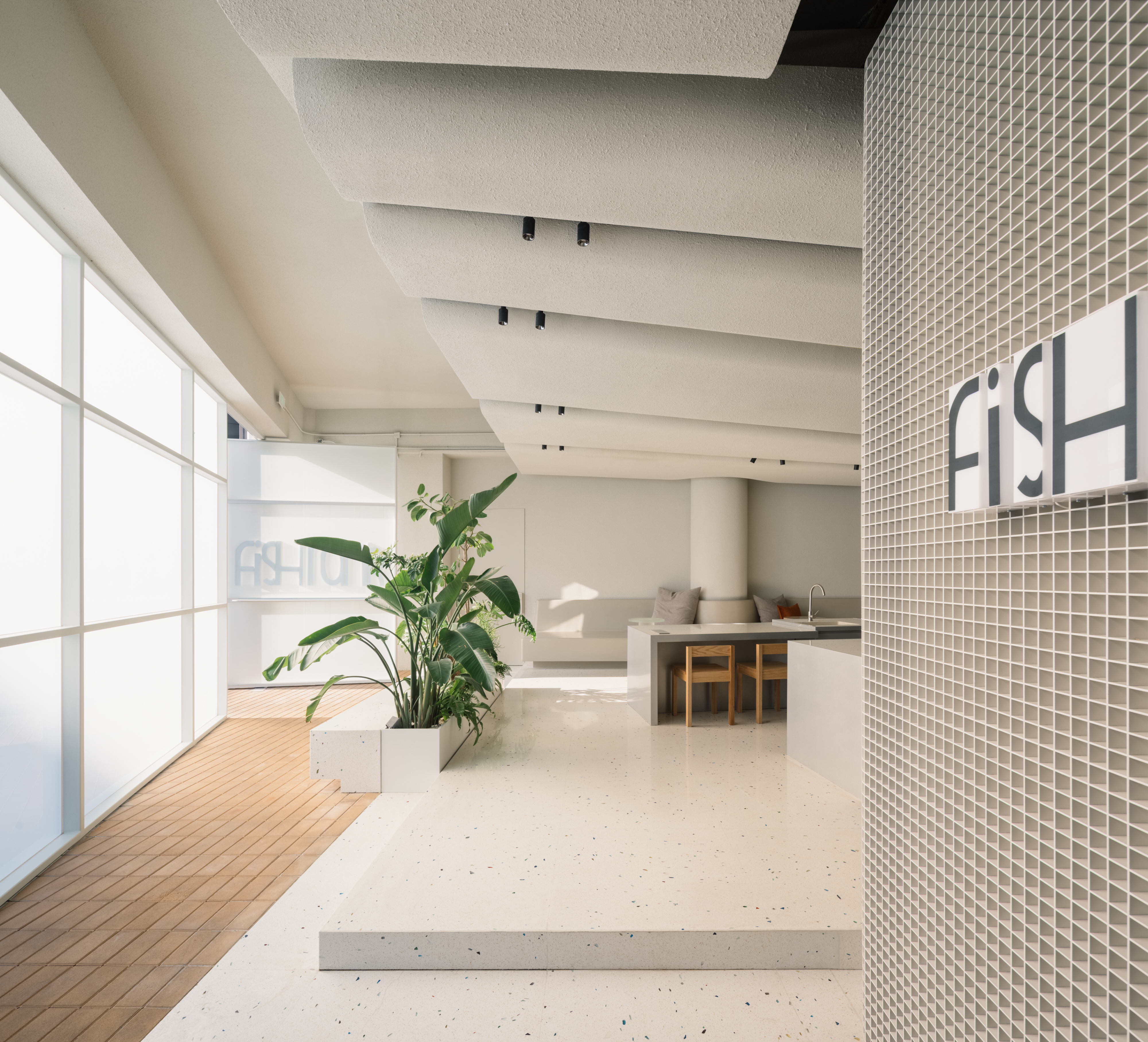 The slanted ceiling is finished with textured plaster in warm grey like pumice waves floating in the ocean, with rounded edges folding "soft seams" for light fixtures to probe through.