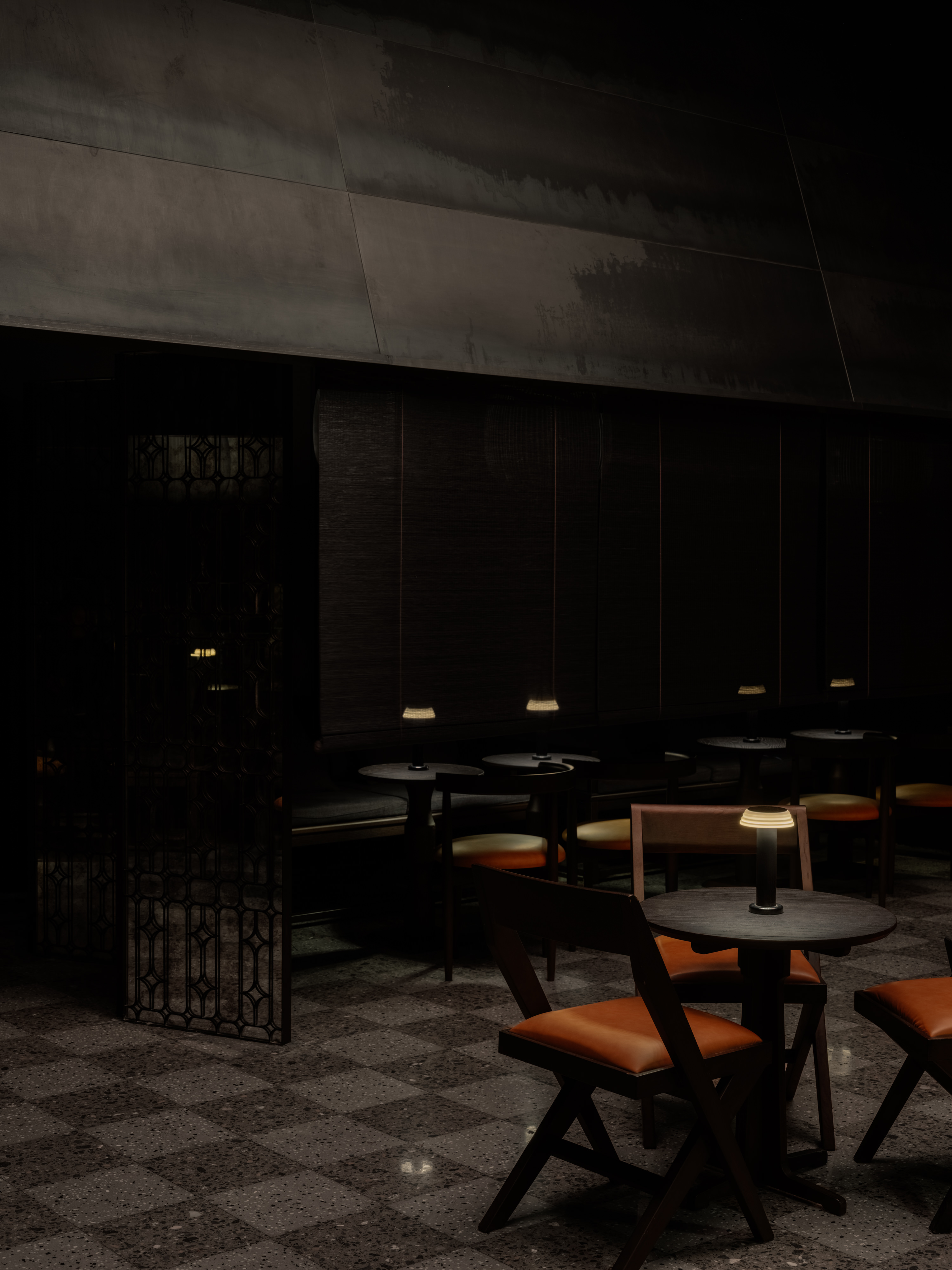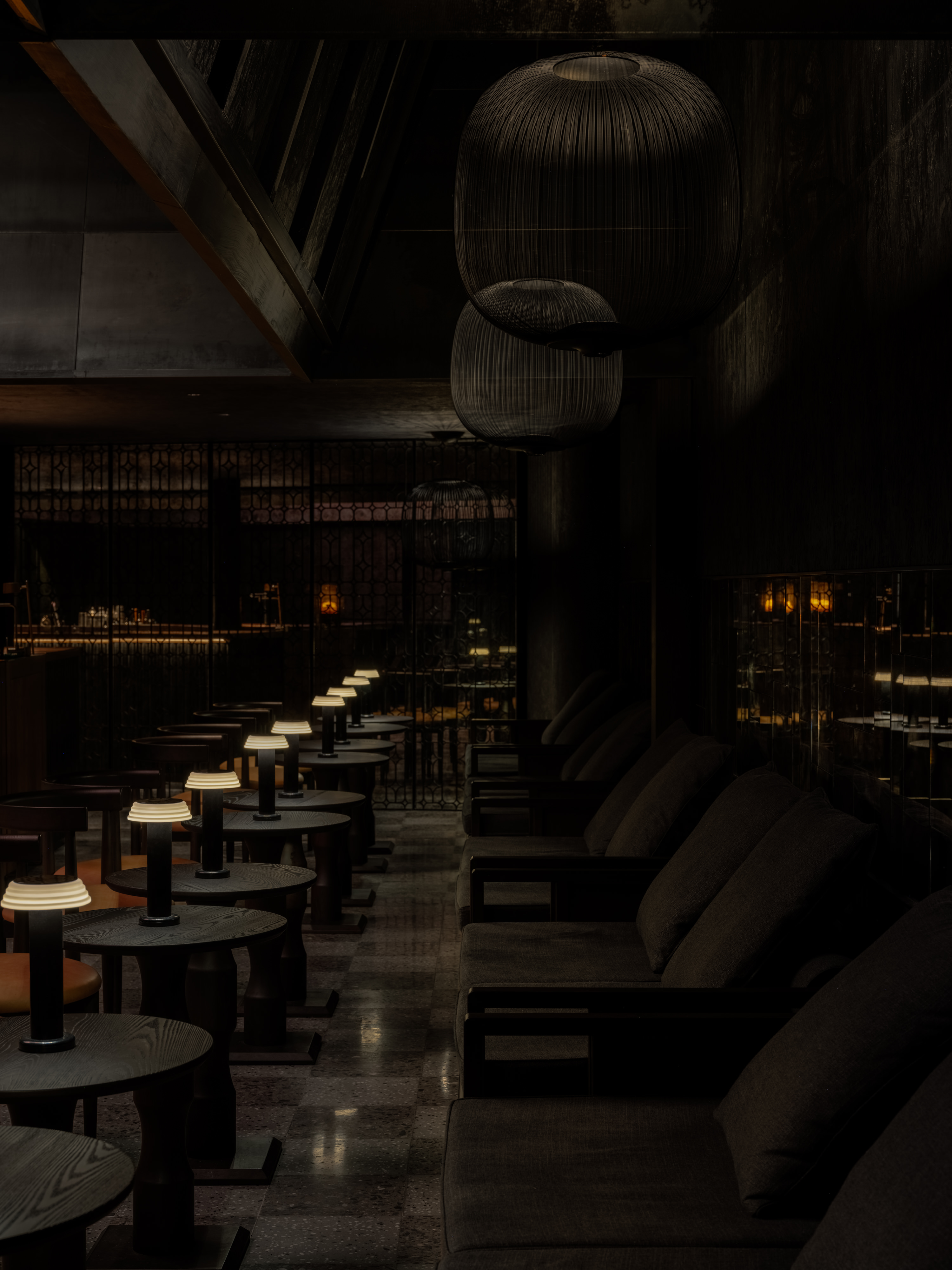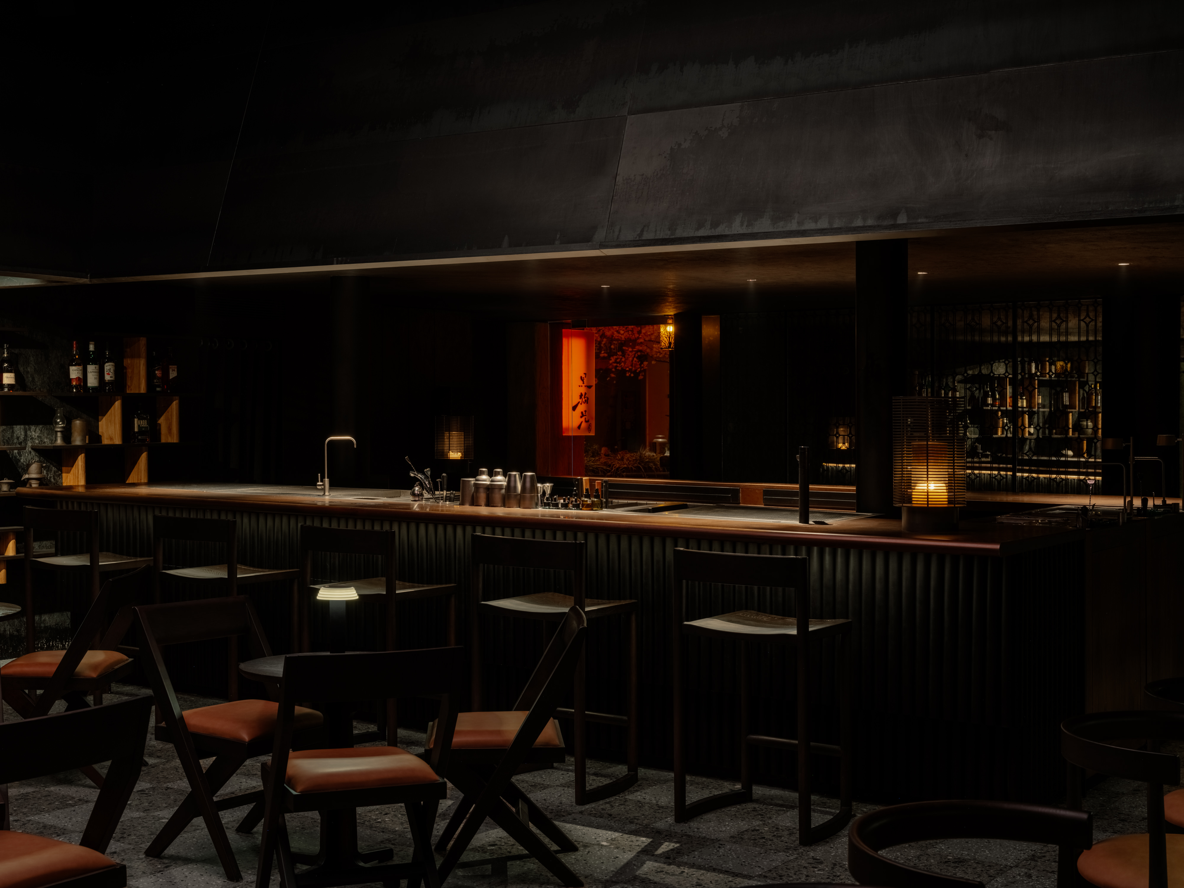 Inspired by the domestic spatial logic of southern Chinese living, the seating layout centers around a square-shaped court, wrapped by blackened steel awnings that rise dramatically into the tall ceiling space. This spatial gesture creates senses of both openness and intimacy, reminiscent of gathering under shaded canopies in a serene garden setting.