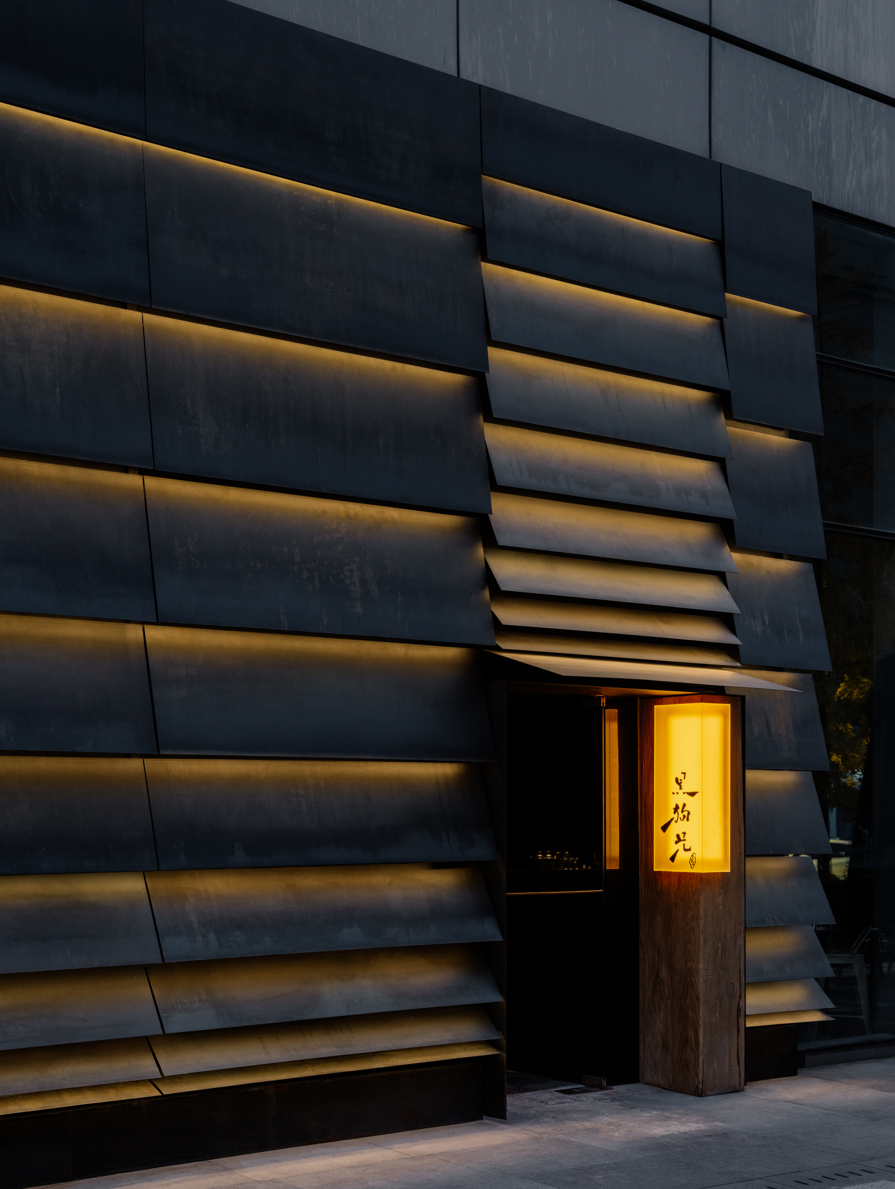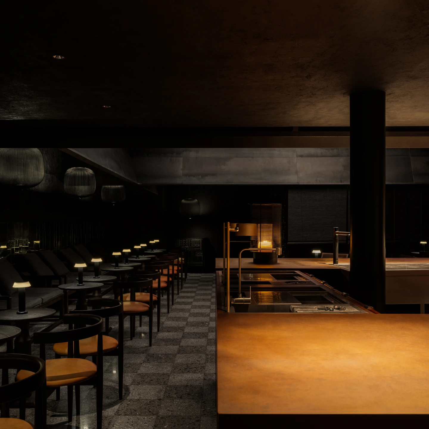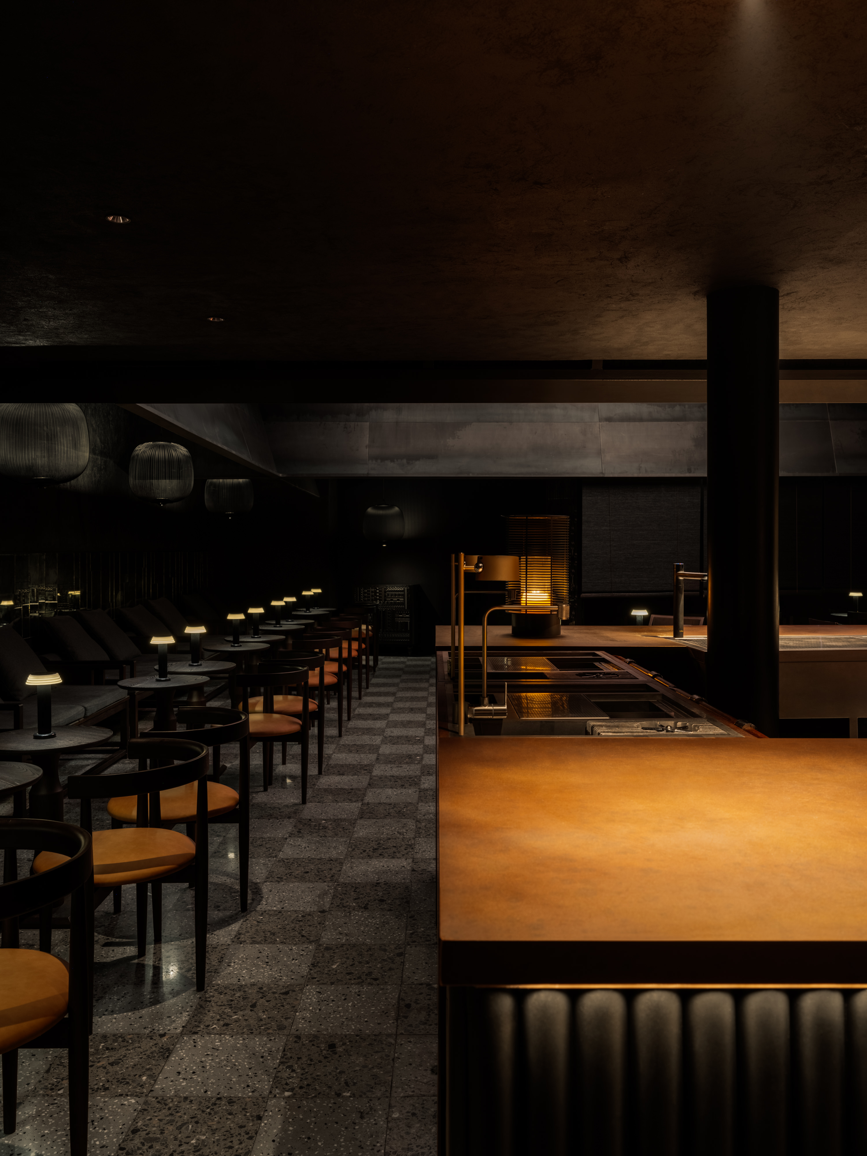 Inspired by the domestic spatial logic of southern Chinese living, the seating layout centers around a square-shaped court, wrapped by blackened steel awnings that rise dramatically into the tall ceiling space. This spatial gesture creates senses of both openness and intimacy, reminiscent of gathering under shaded canopies in a serene garden setting.