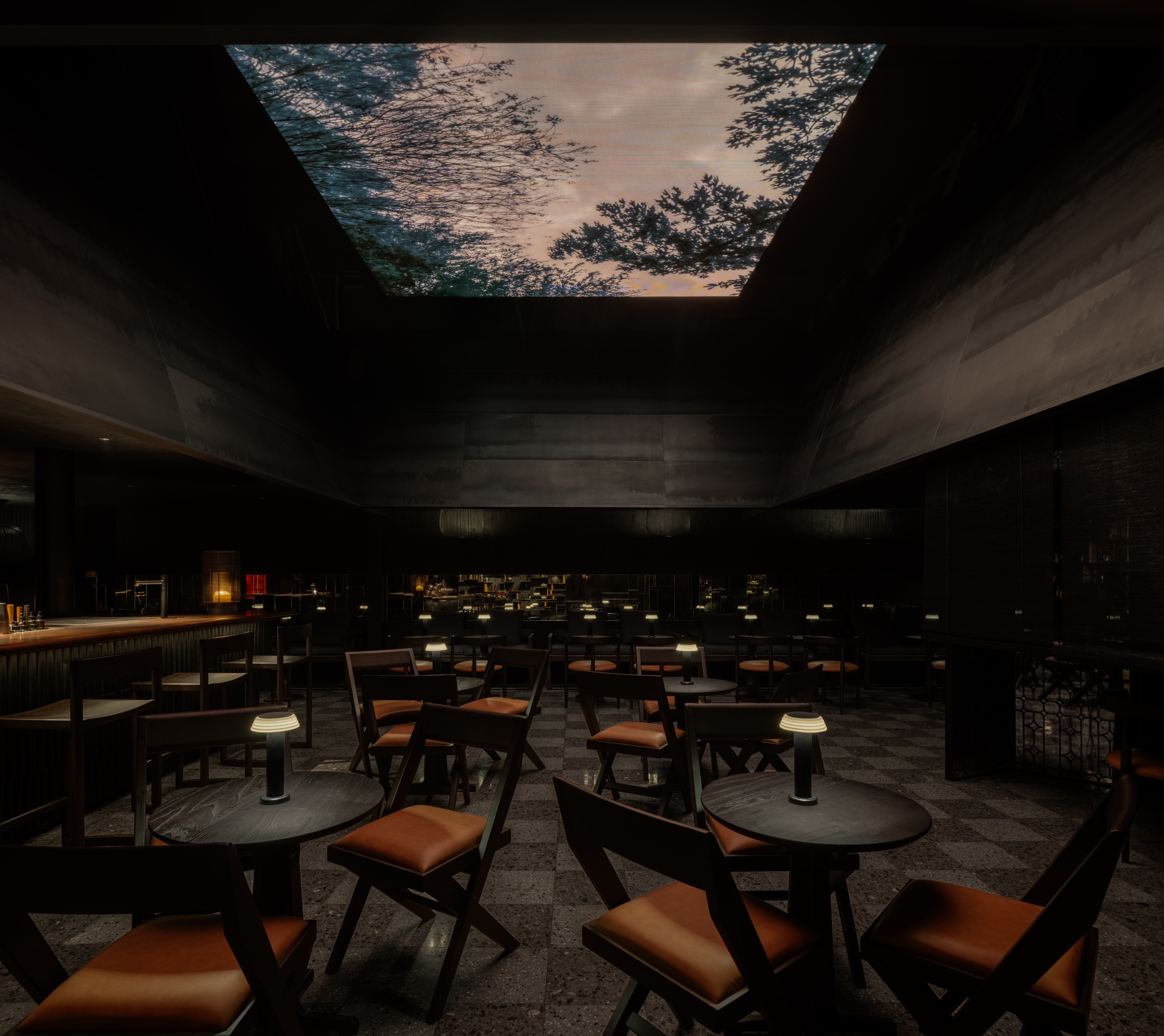 This inner court is capped by a floating LED detached from all four sides, conceived as an atmospheric surrogate for an animated sky, enabling changes in ambience through abstract or environmental imagery, supporting daily operation as well as occasional private events.