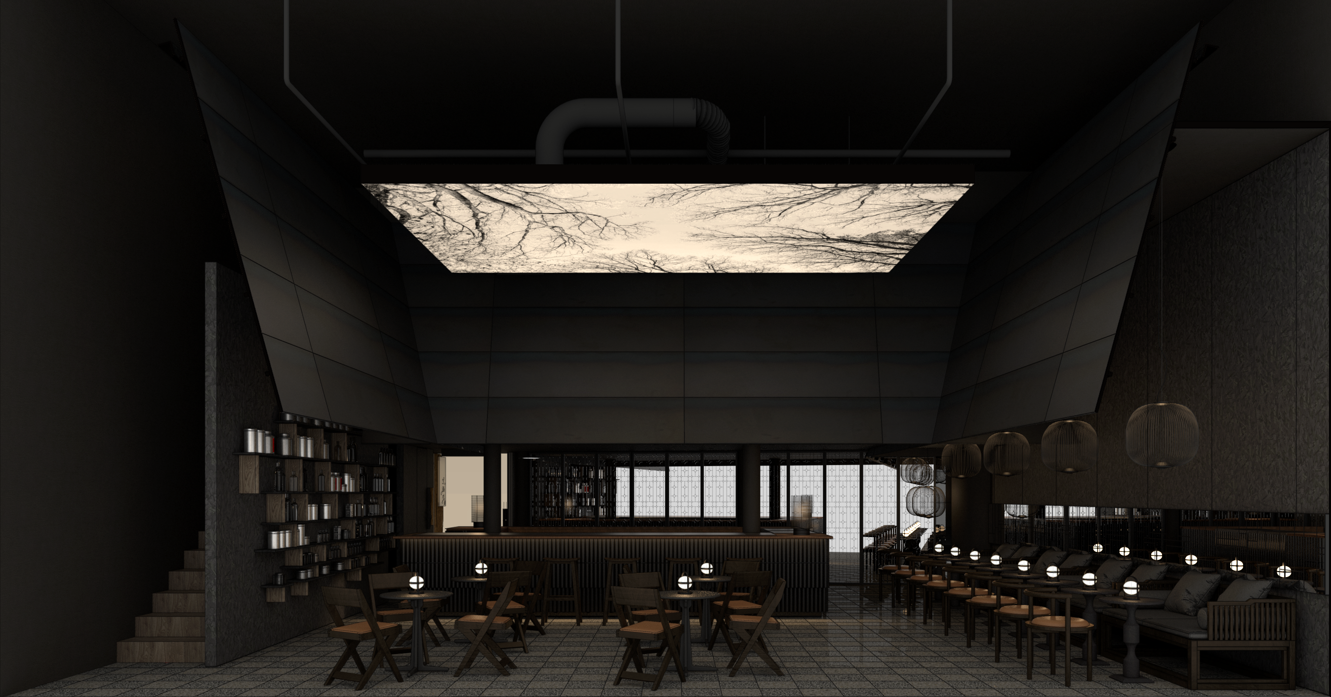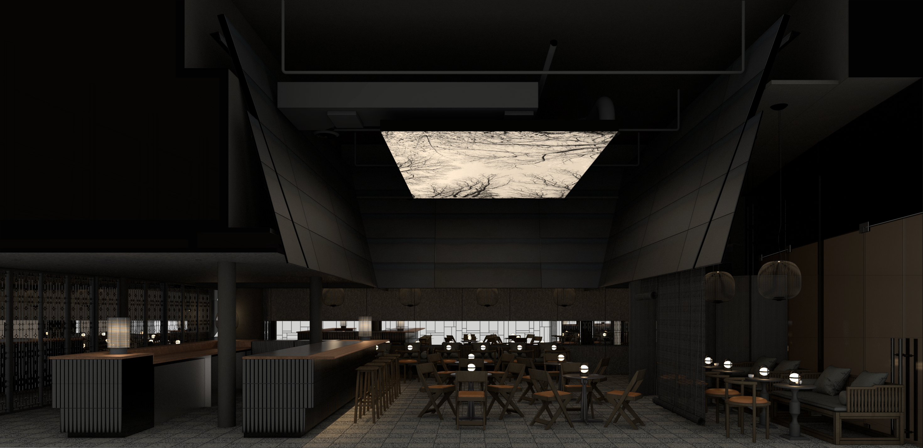 The palette leans toward darker, earthy tones, allowing materials to absorb light and reveal texture over time. Lighting is predominantly indirect and concealed, shaping atmosphere and spatial hierarchy, while the soft ambient glow from the lanterns beneath the “awnings evokes the gentle illumination of old teahouses, casting warm pools of light that invite guests to linger and converse. Upholstered seating and absorptive wall finishes contribute to an acoustically softened environment, supporting conversation-scale intimacy.