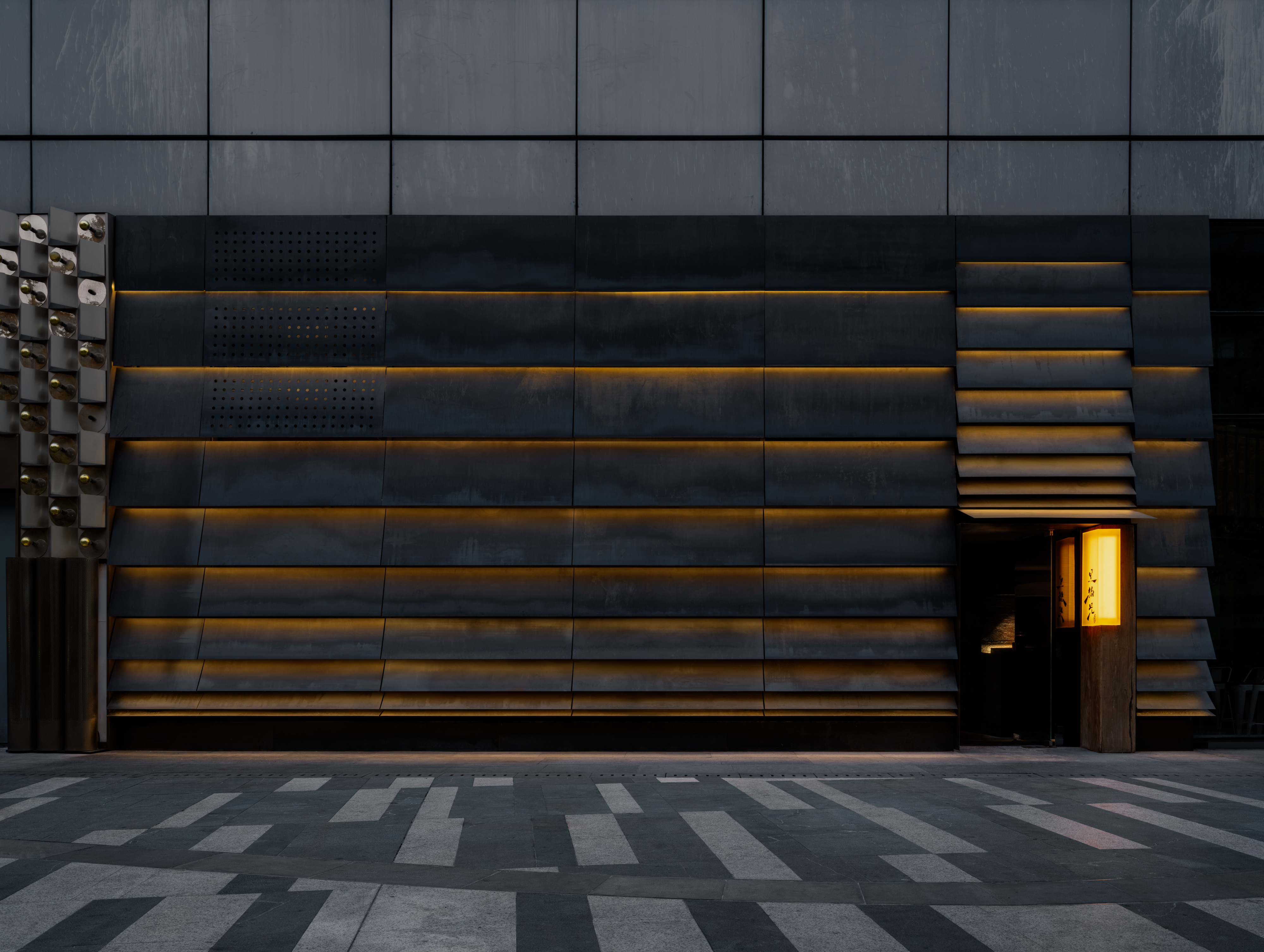 The site was previously occupied by a coffee shop, the exterior façade opens to the bustling city street, while the opposite faces the mall interior. The 120sqm ground level space has a generous 6m ceiling height with a pre-existing partial attic. Taking the advantage of the tall exterior exposure, the façade design respectfully echoes the division lines of the existing commercial architecture, but expressed in hot-rolled steel sheets with a gradual transition announcing a subtle three-dimensionality to the otherwise homogeneous mall exterior. At nightfall, the façade glow softly to evoke a sense of curiosity and invitation.