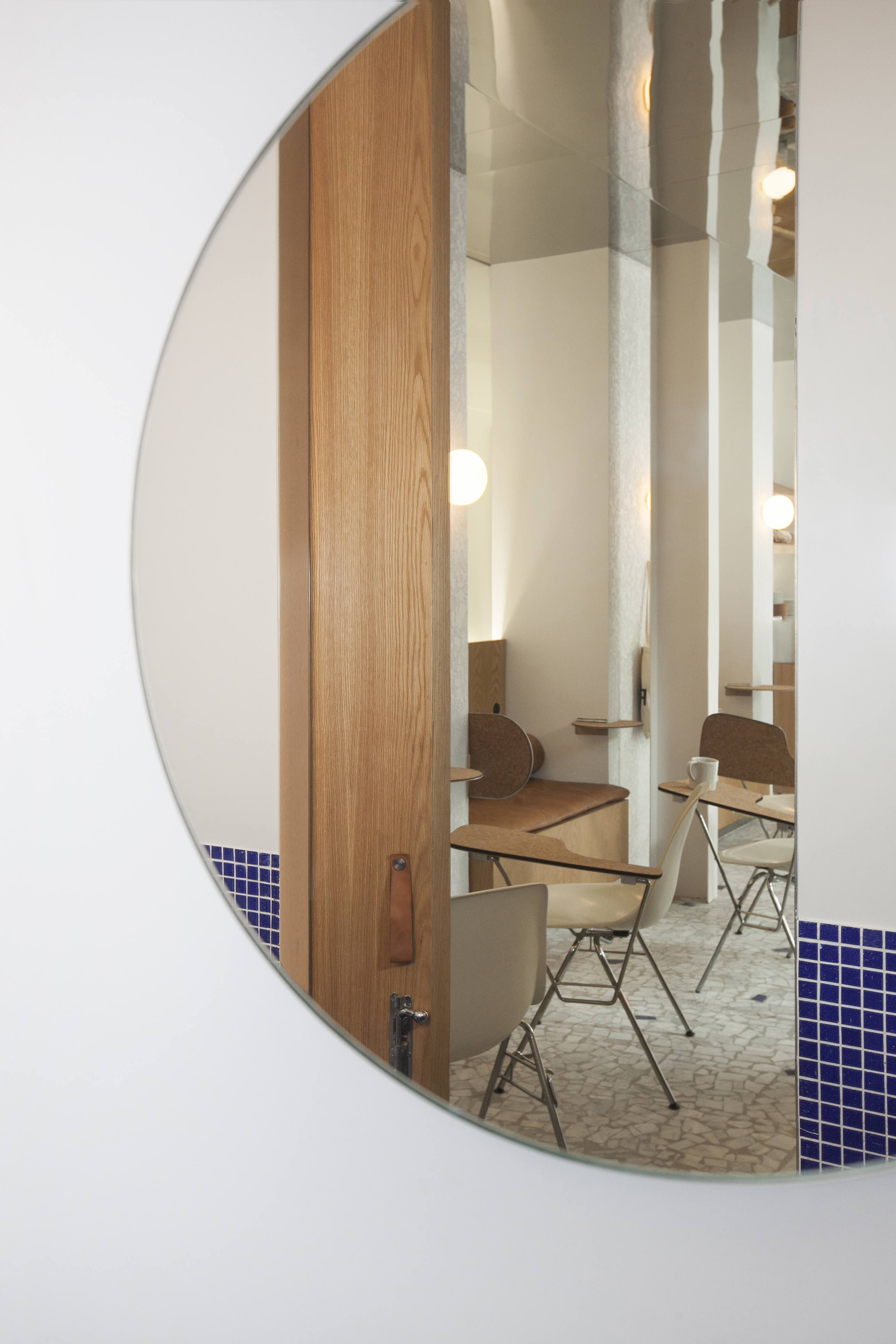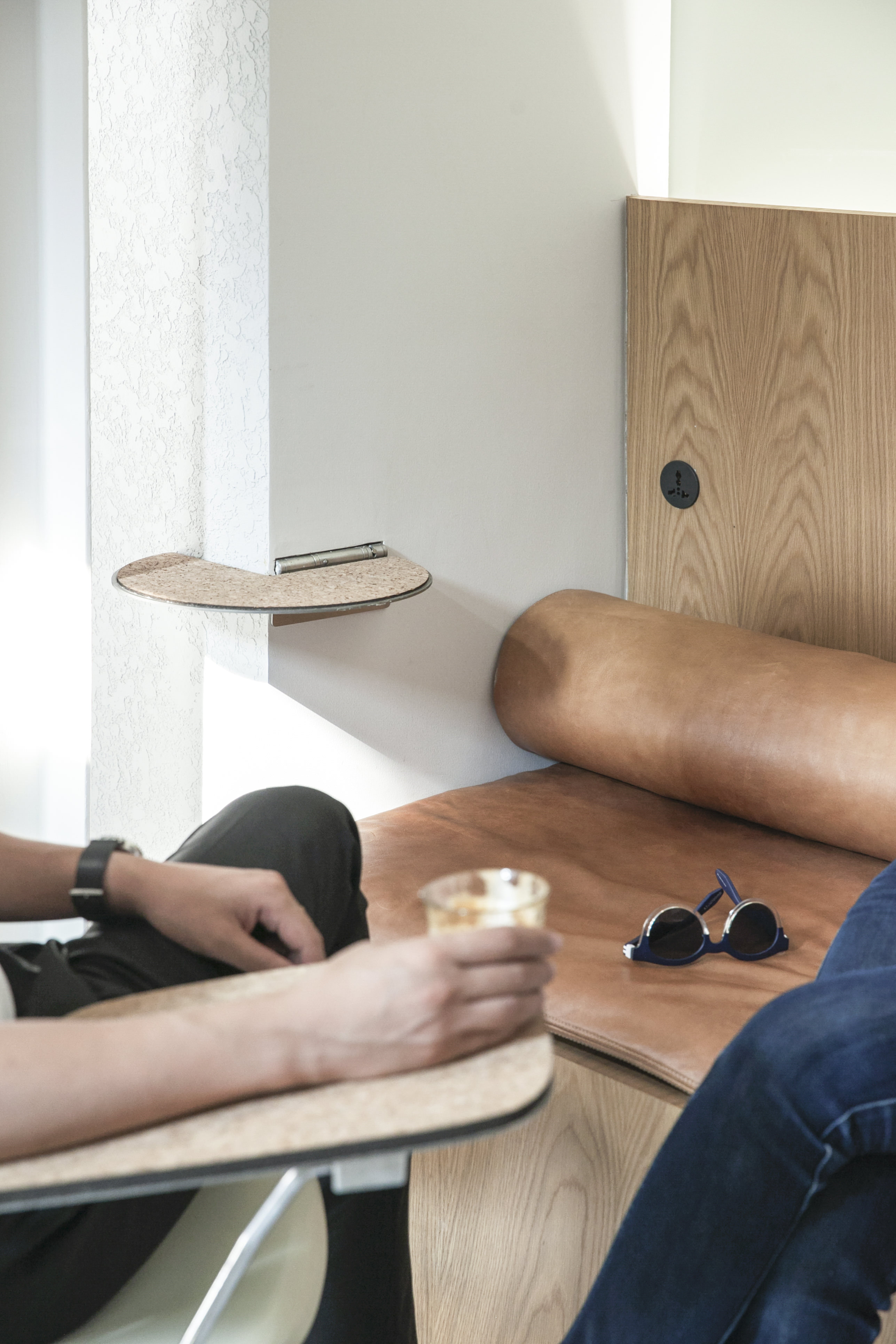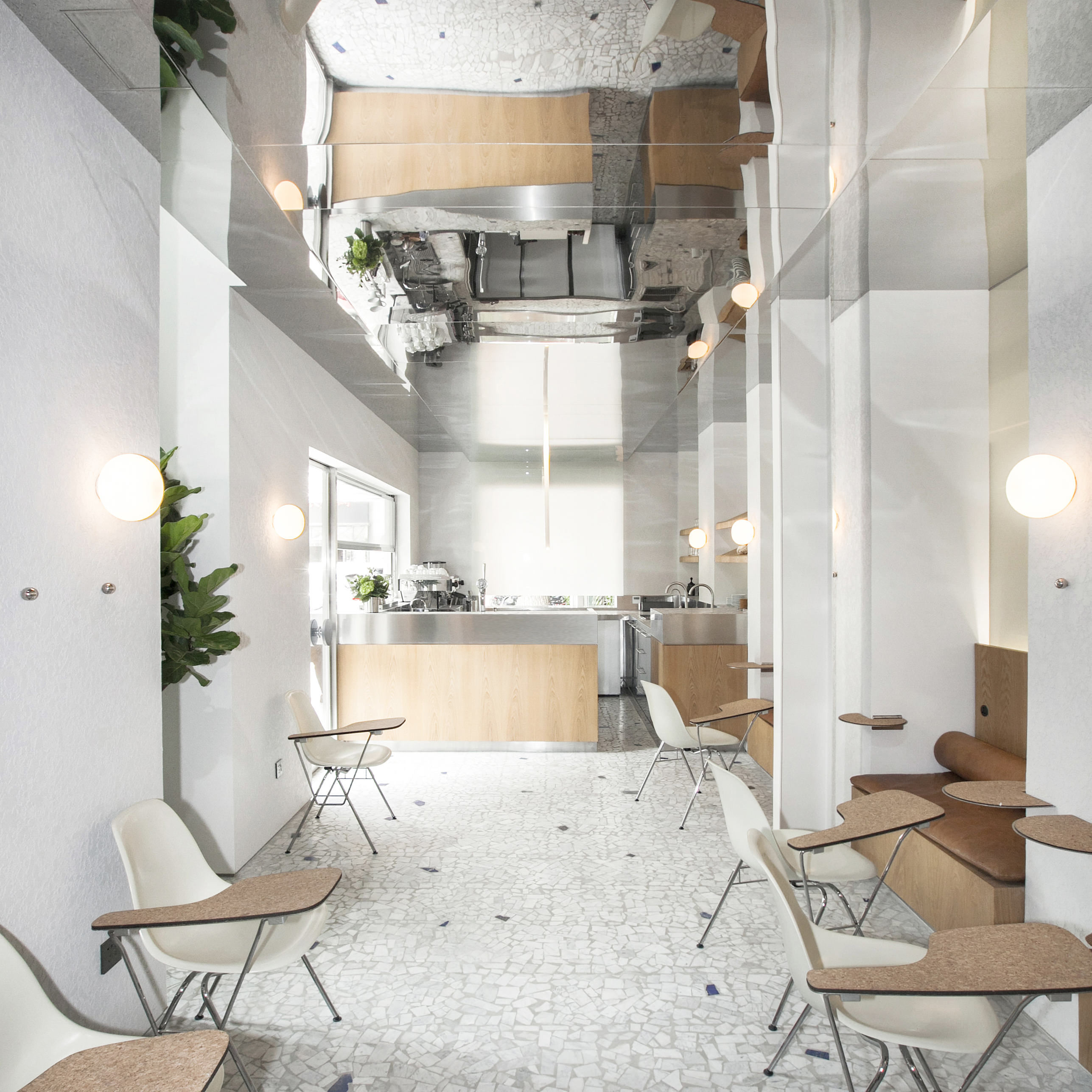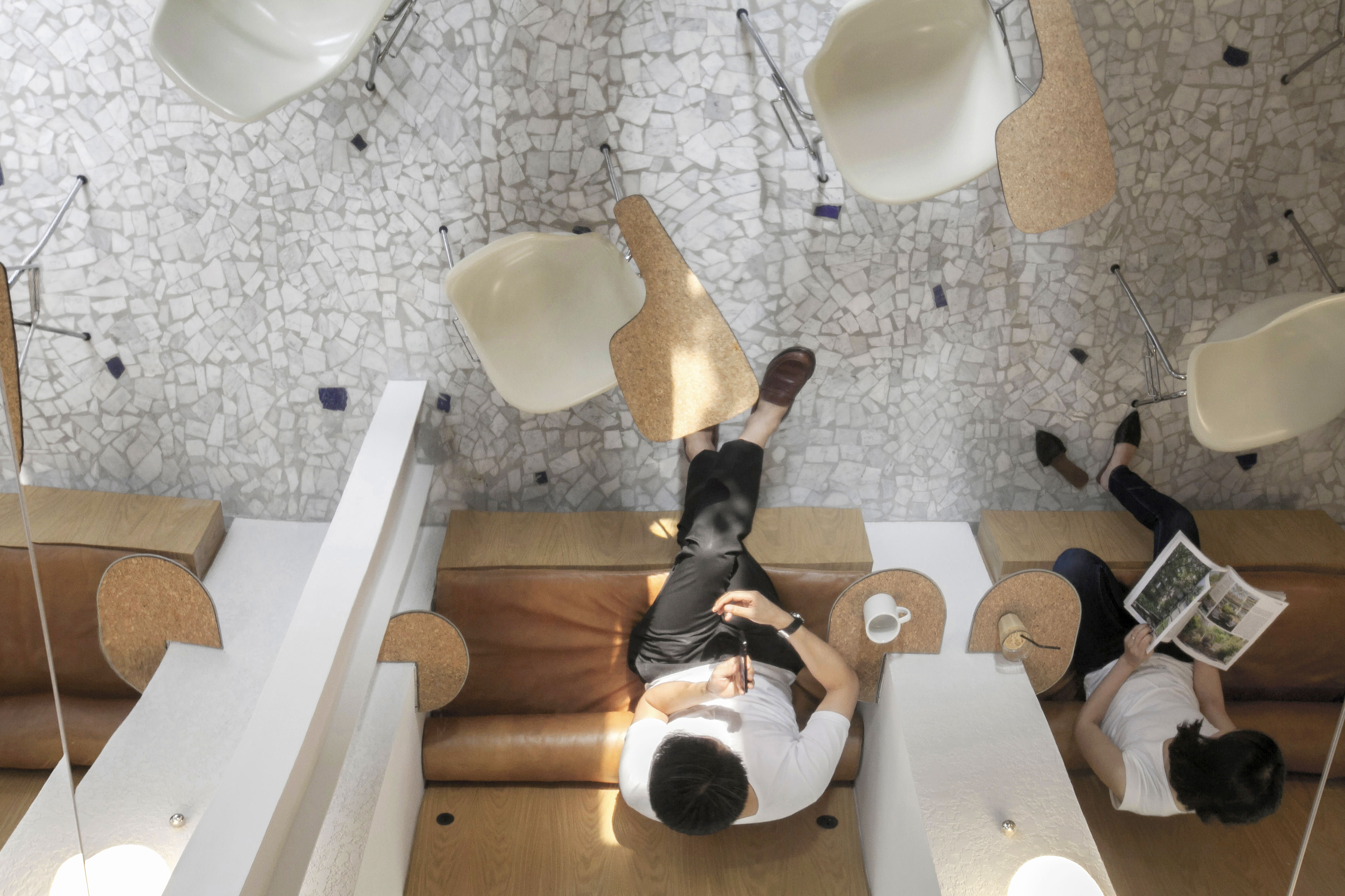 The 2.9 x 10 meter linear space was orthogonally dissected into three sectors: coffee bar, seating area, and a WC, according to their required level of exposure to the exterior. The 2 x 2m coffee bar is positioned at the north end taking advantages of the exterior frontages toward the courtyard. Three booths and 12 chairs fill the 16m² main space while the seating plan is perpetually being arranged most organically. The last slice of the space was dedicated to a spacious WC. Coffee shop and the Co-working office are linked yet separated by the original building facade with a distinct factory aesthetics of rhythmic window. These large openings were enlarged vertically to become a colonnade with booth seating in-between each column. Large panes of frosted glass allow daylight seeping into the otherwise window less office beyond. This uniform rhythm is further accentuated by the polished stainless steel cladded ceiling. The mirroring effect visually extends the height of the space while reflecting daylight into the office behind.