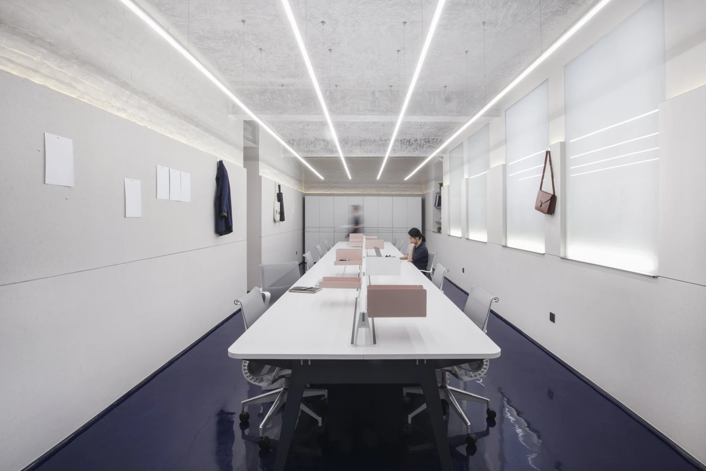 Due to the possible fragility of the existing structure, minimal changes were made to the original layout only to create a more rigorous circulation. The existing column and beam structure naturally splits the rectangular space into three long bars: a 1.5m wide central corridor, and two 3.9m wide wings on each side. The central corridor began with a 4m² waiting area, through a sliding door, leads into the main corridor connecting to the different rooms: two offices with capacity of 12 and 5 people, boardroom, copy room, and two WCs. The largest room was dedicated to house a more fluid and versatile working atmosphere with 12 working stations laid out in a centralised fashion, flanked by a pantry. Across the corridor are three spaces with no natural light.