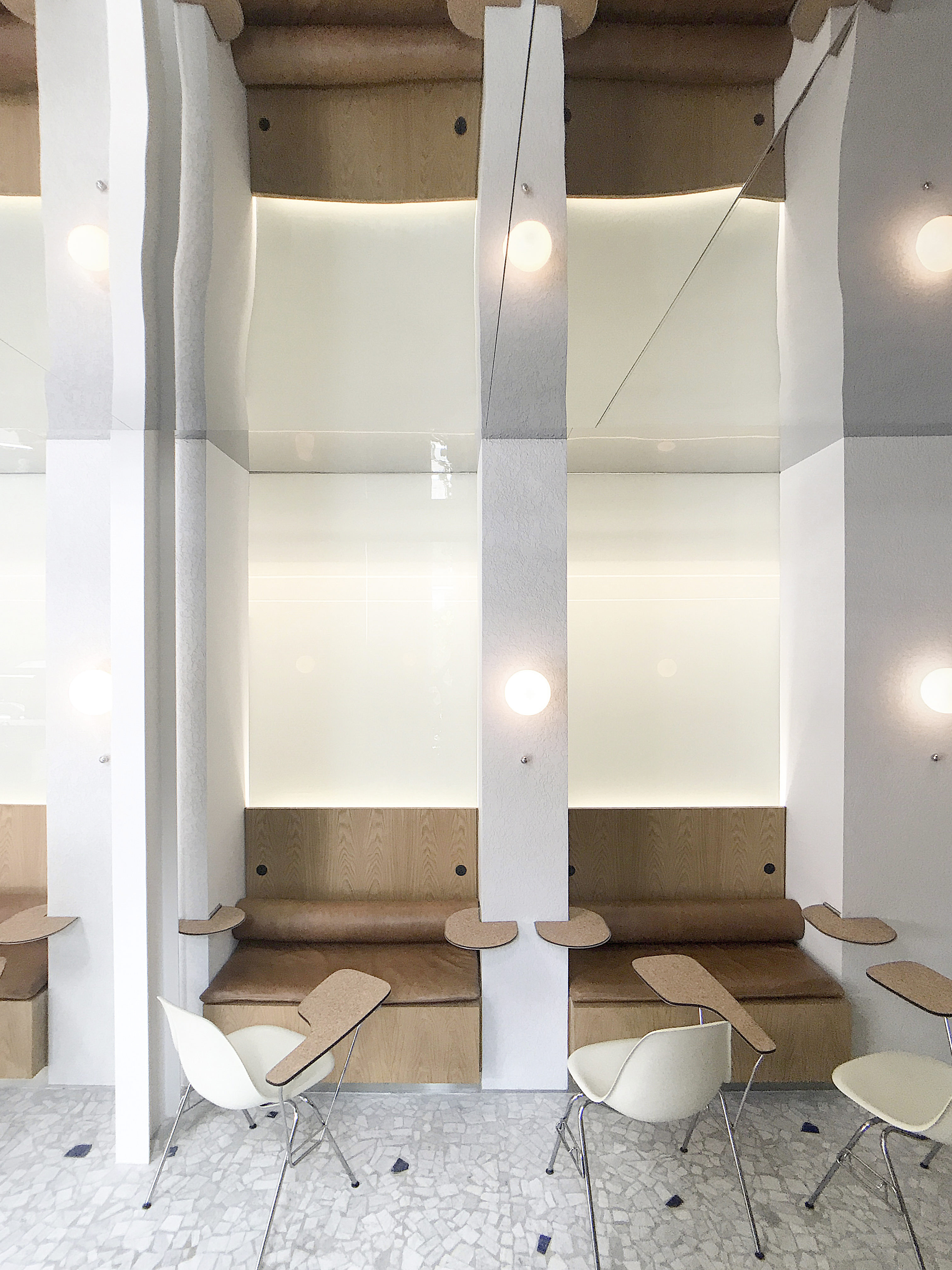 This wish was inspired and enabled by a classic piece: Eames Stacking and Ganging Chairs Tablet Arm Chair EC134, providing us with the opportunity to create endless seating combinations, and therefore endless modes of social interactions.