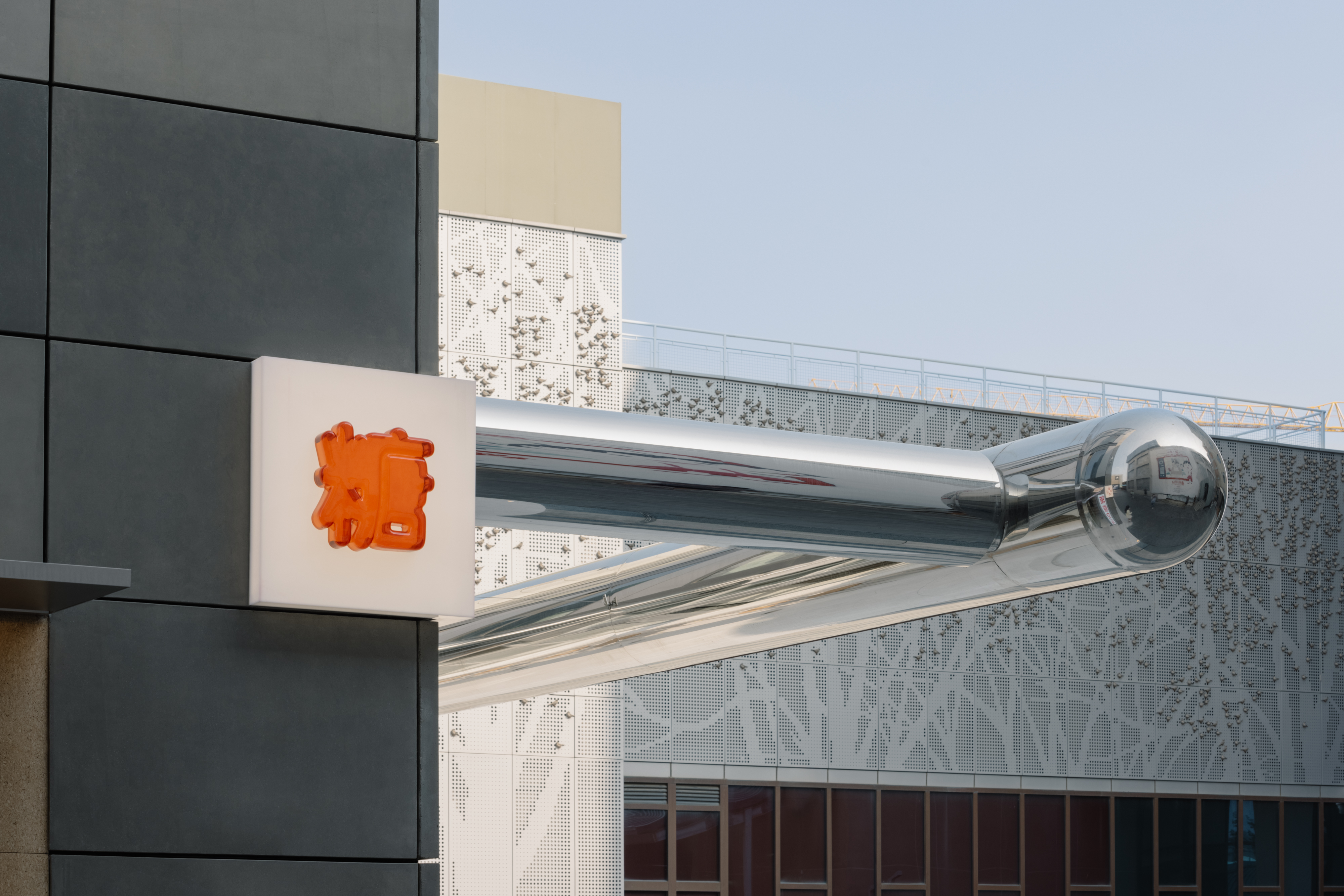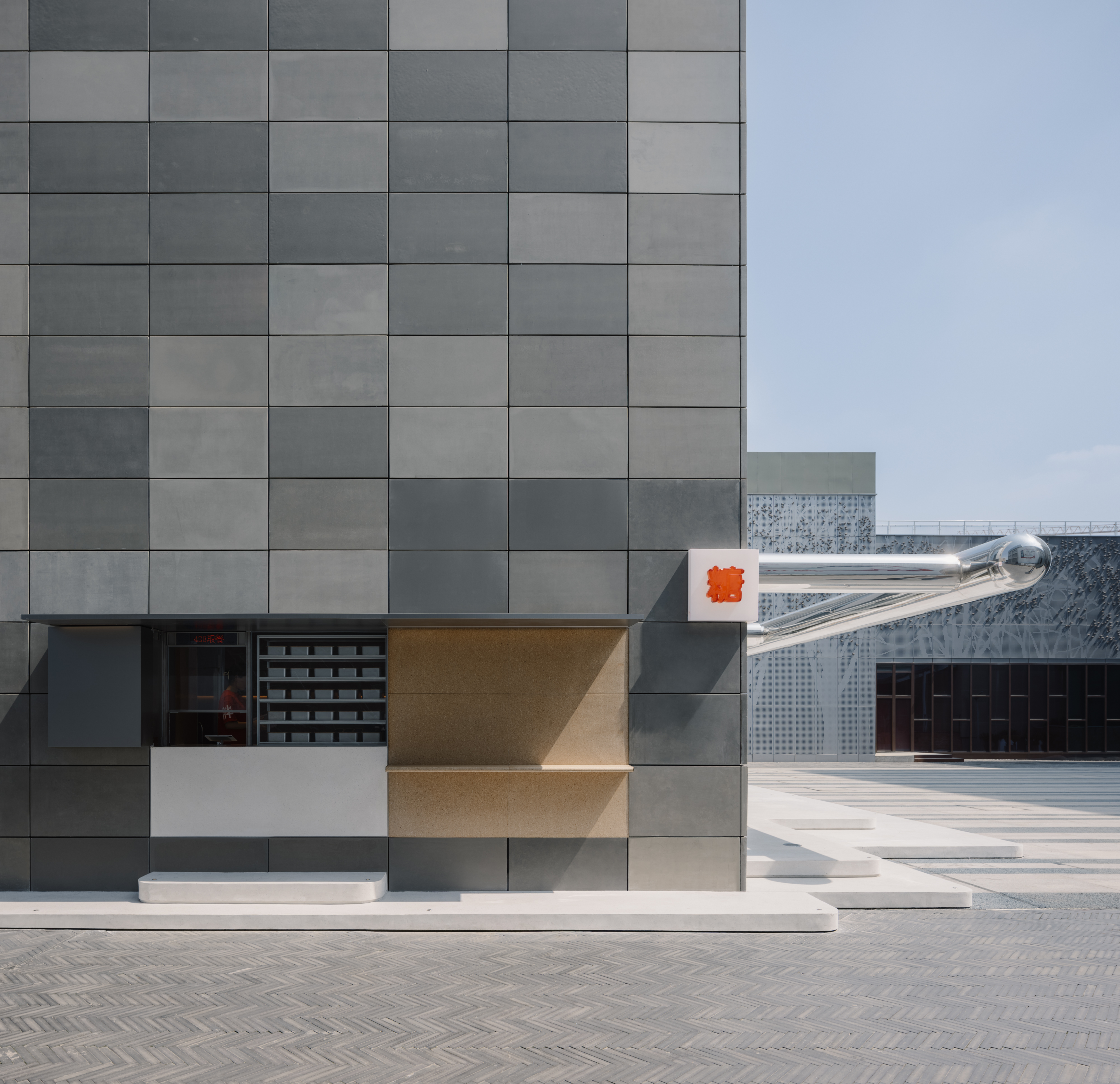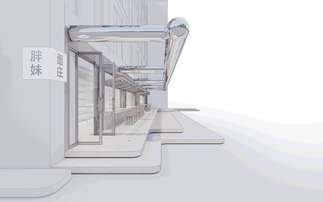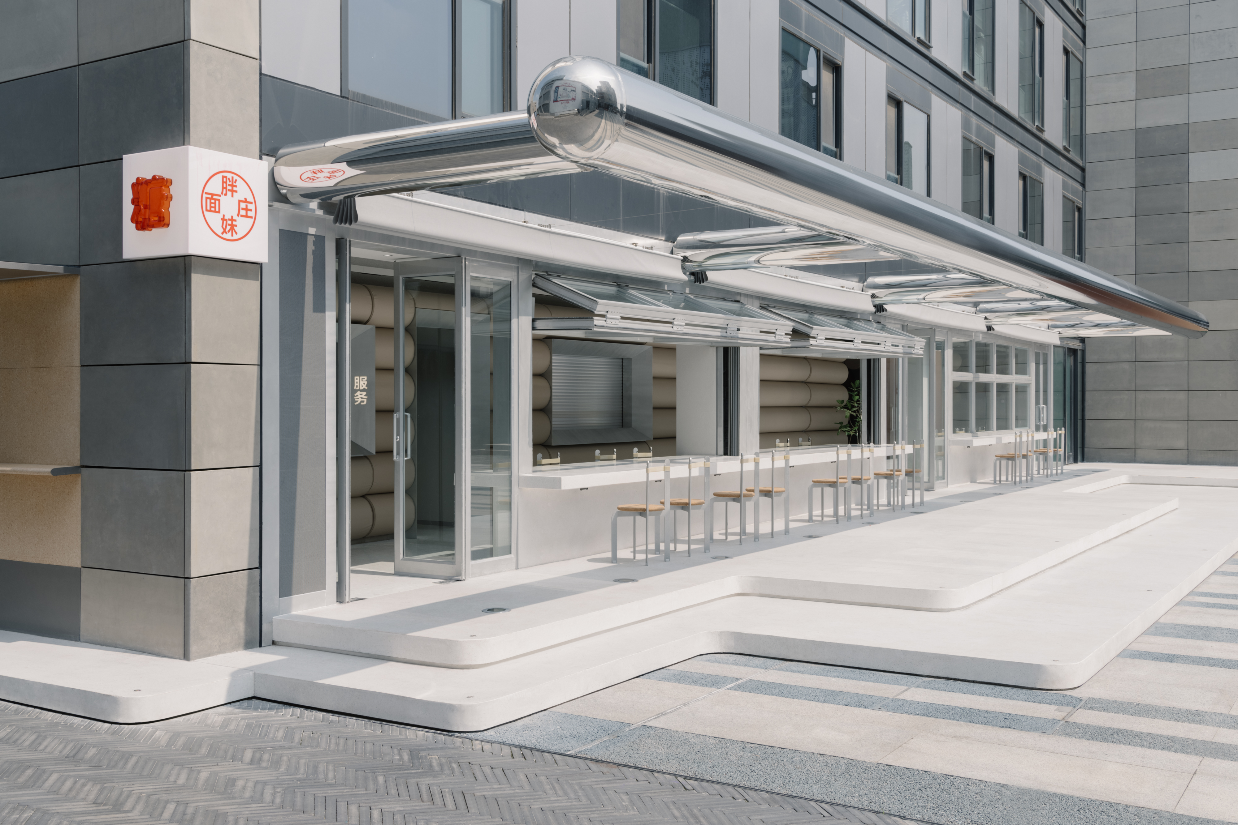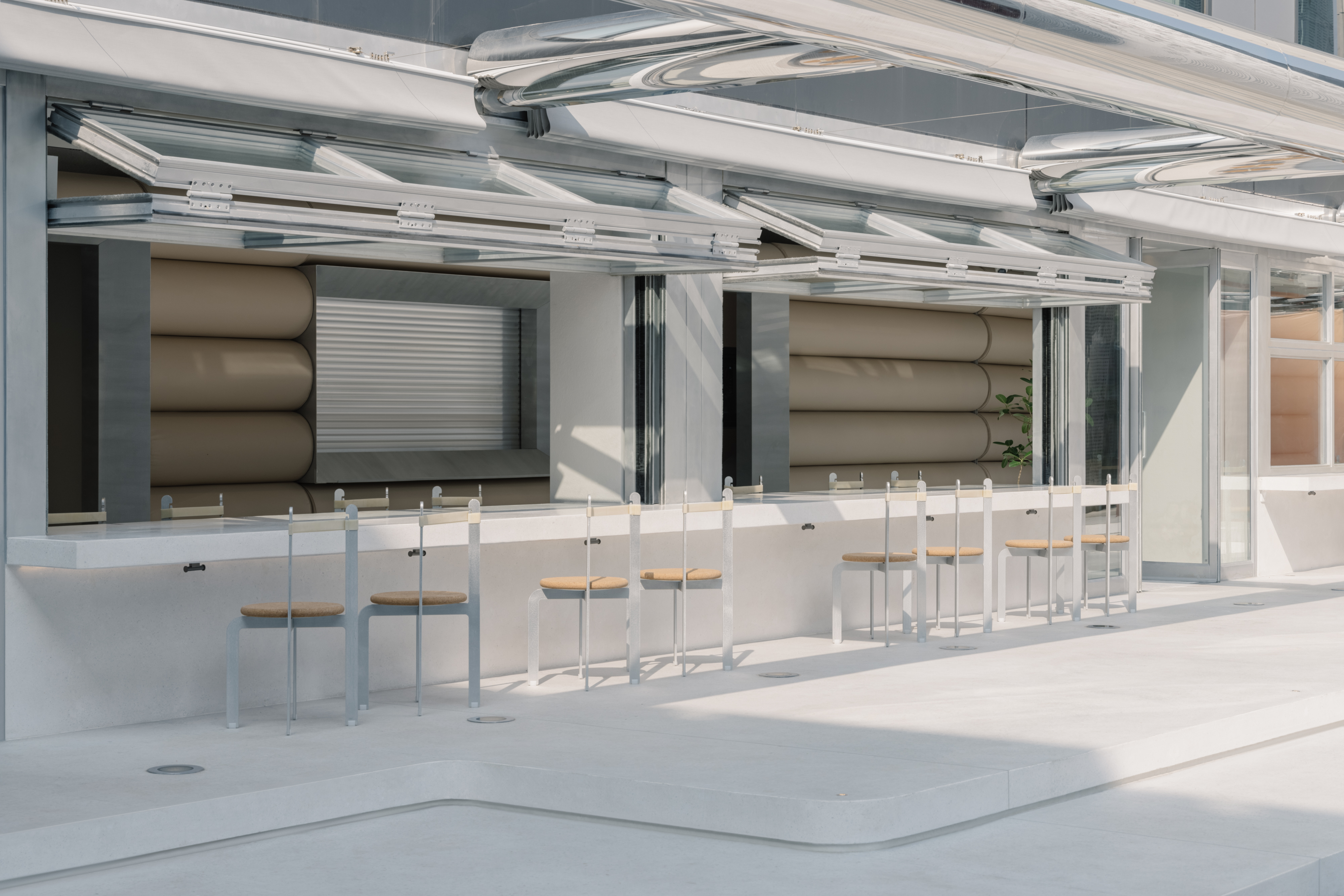 A stainless "chubby" superstructure projects out of the facade above the bi-fold windows, commanding a monumental but playful presence inside the business complex. Its tubular pill shape and reflective surface is reminiscent of Jeff Koon's twisted balloons. With rollable membrane installed, the canopy offers shading over its al fresco patio. Raised by soft corner landscape stepping, the new terrazzo patio reaches out into the courtyard in a friendly manner. The stepping and the canopy together, accentuate the linearity of the facade. They frame long and dynamic scenes of eaters enjoying their food and company.