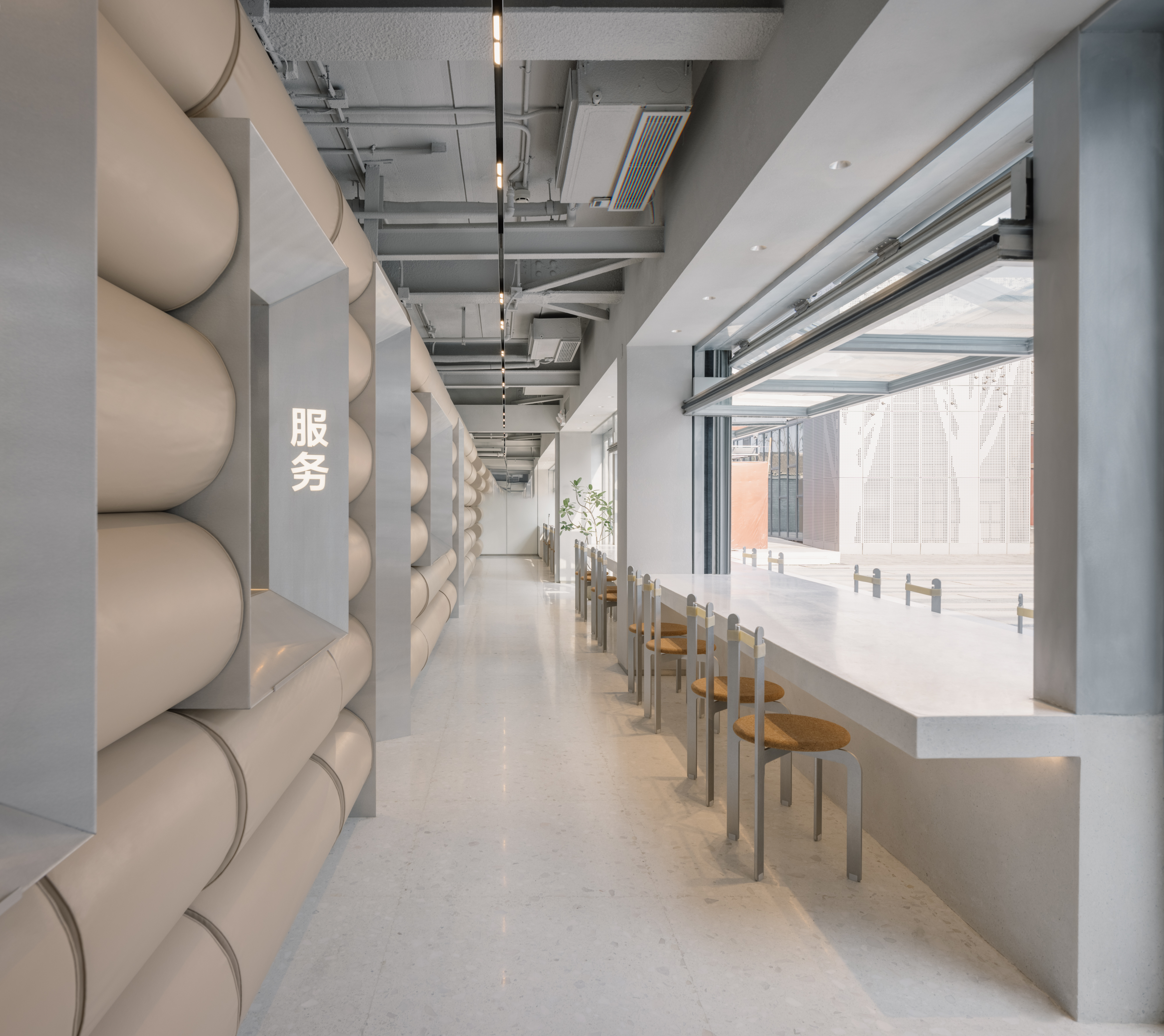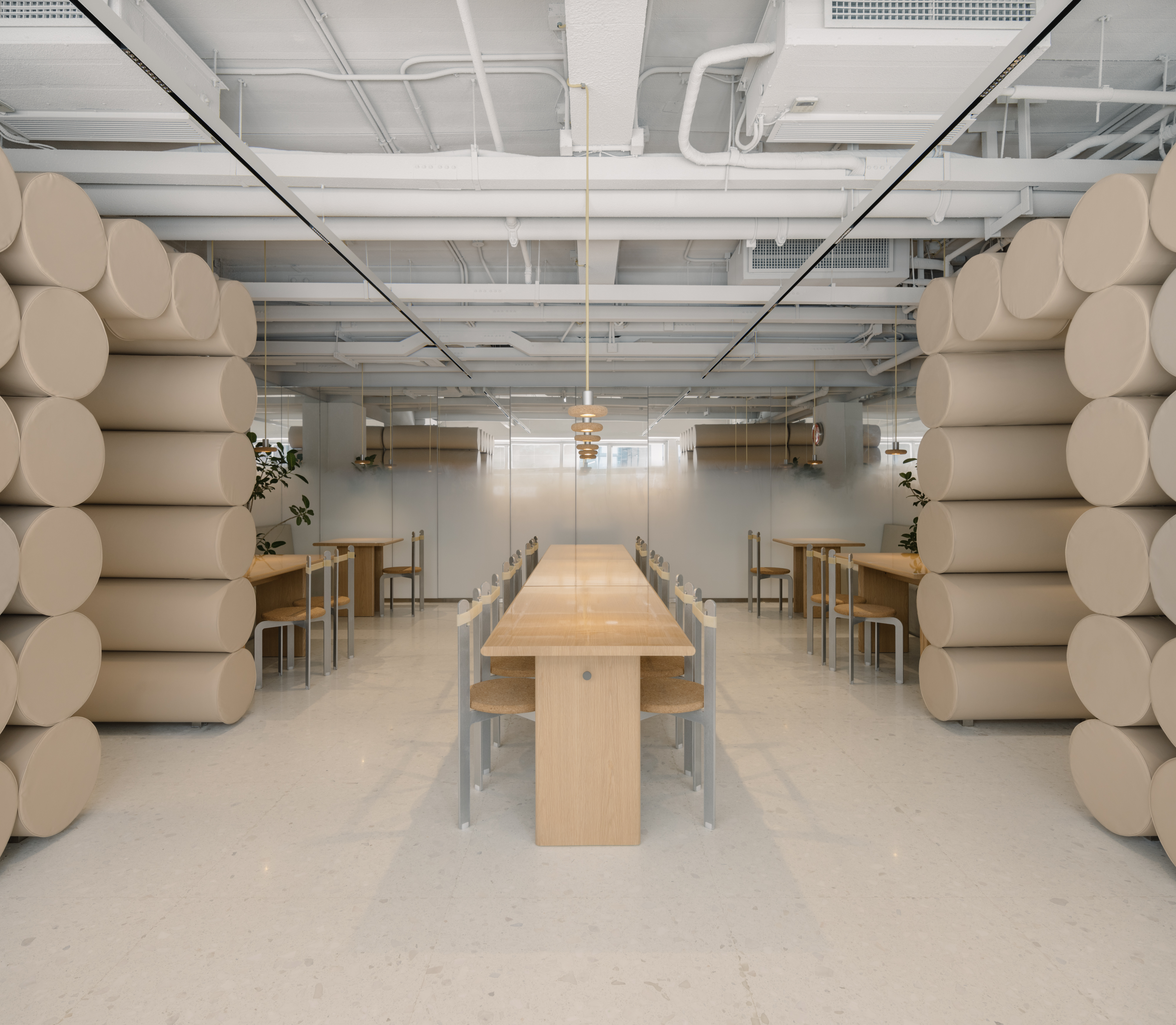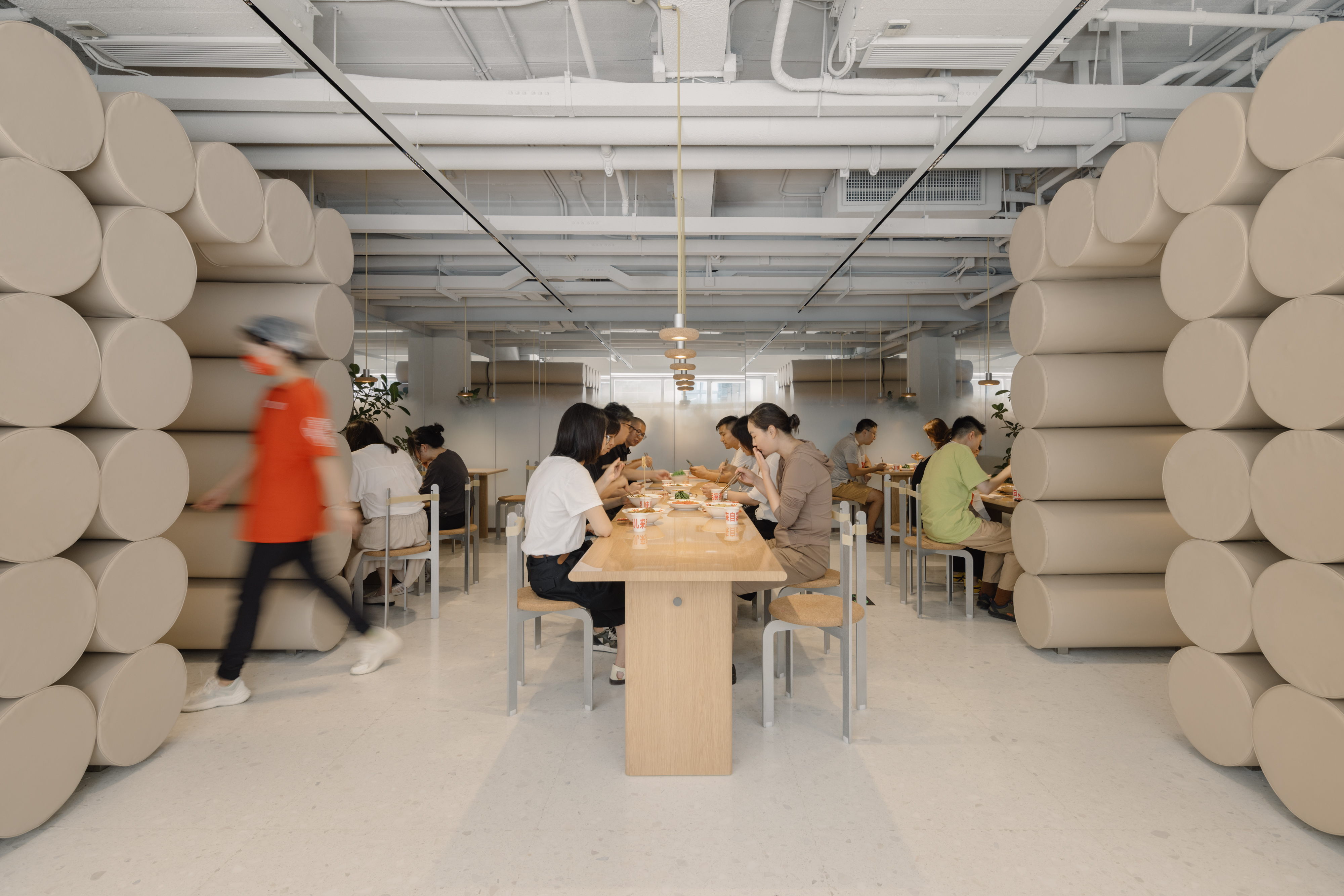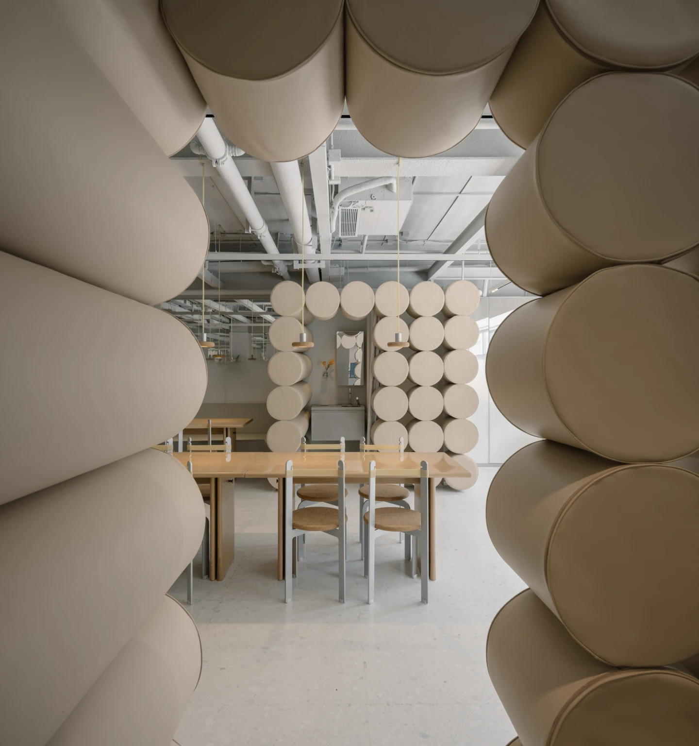 This playfulness is echoed throughout the interior too. Office AIO pulls off a play of material inspired by the improvisation spirit of hutong furniture. Crafted with rubber bands, cork and aluminium, the bespoke sling chairs and puck pendant lights complement the rooms of flexibility, minimalism and warmth. Noodle-like and chubby, padded cylinders in soft nude colour wiggle along the walls and form a backdrop that hints on Pang Mei's famous noodles. The padded wall, as well as the gradient fog mirrors, continue as the signature seen across Pang Mei’s many restaurants.