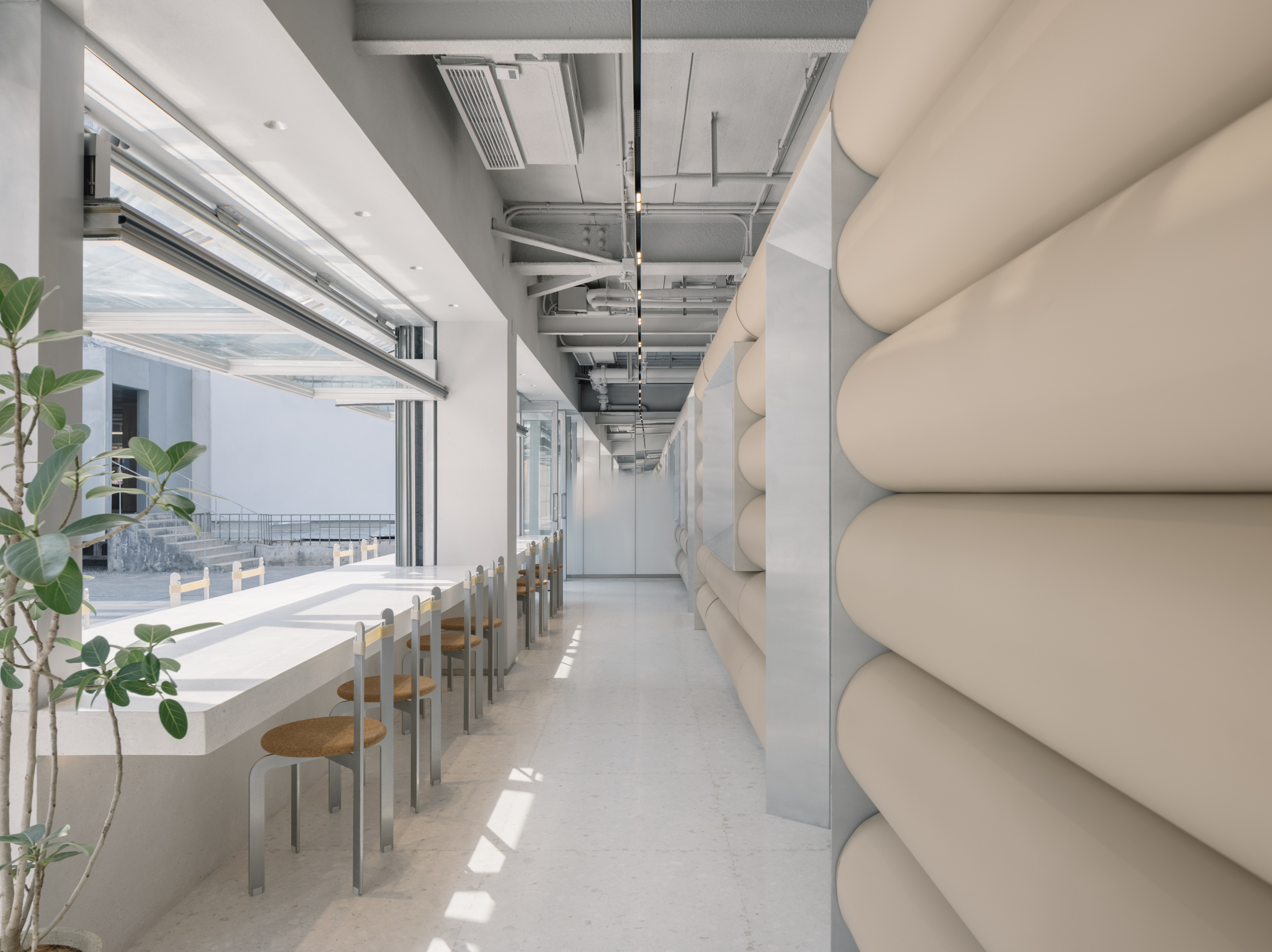 Towards its spacious eastern end, Office AIO arranges more single-party tables and flexible seatings in a larger cubic volume, doubling seat counts for peak hours dine-ins.