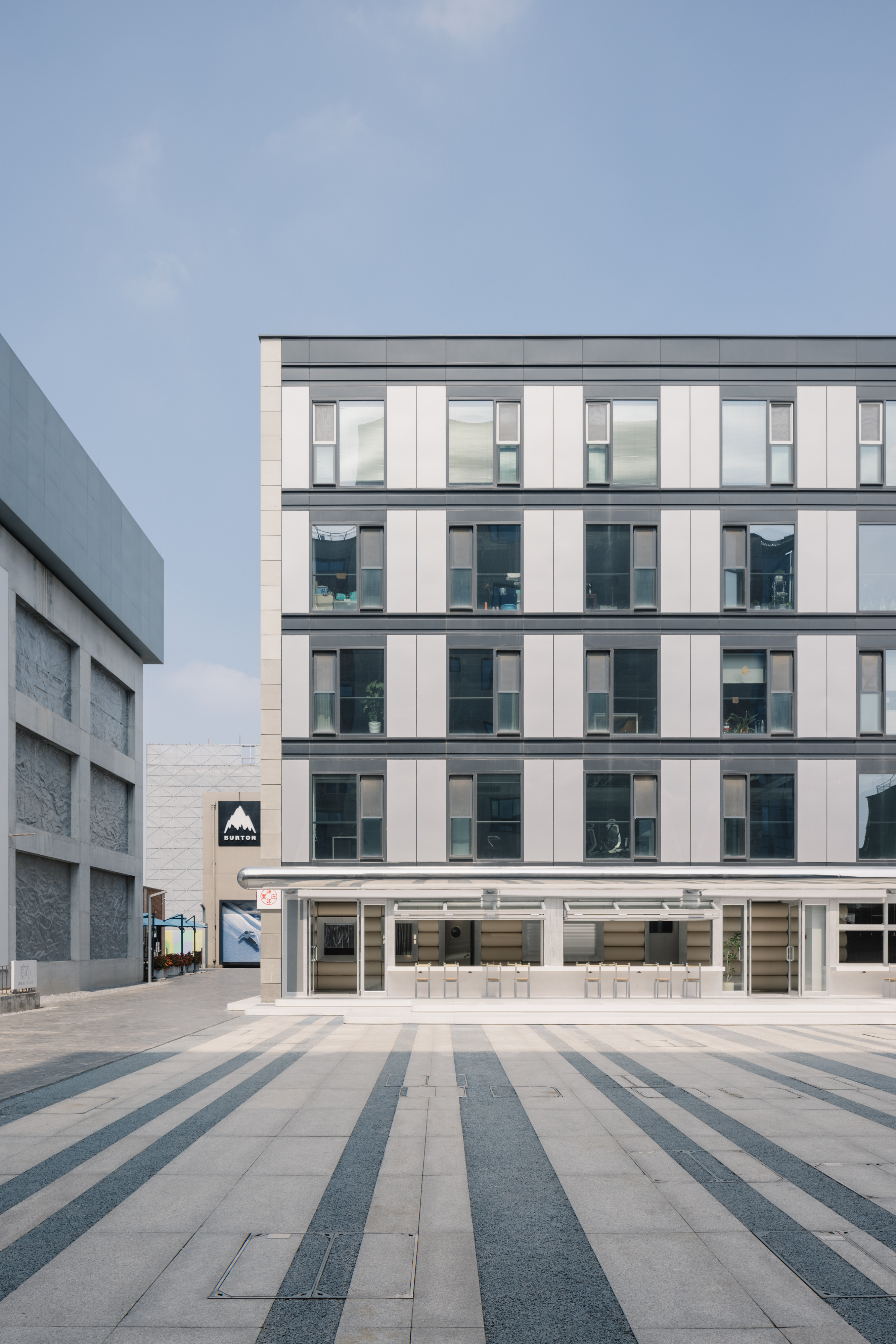 The team revamps the building's facade with functional and eye-catching features. Long tables protrude beyond the building’s envelop, with seatings on both sides to extend the social scenes out onto the plaza. Upward bi-fold glass windows are installed along the tables' centreline, blurring outdoor and indoor spaces.
