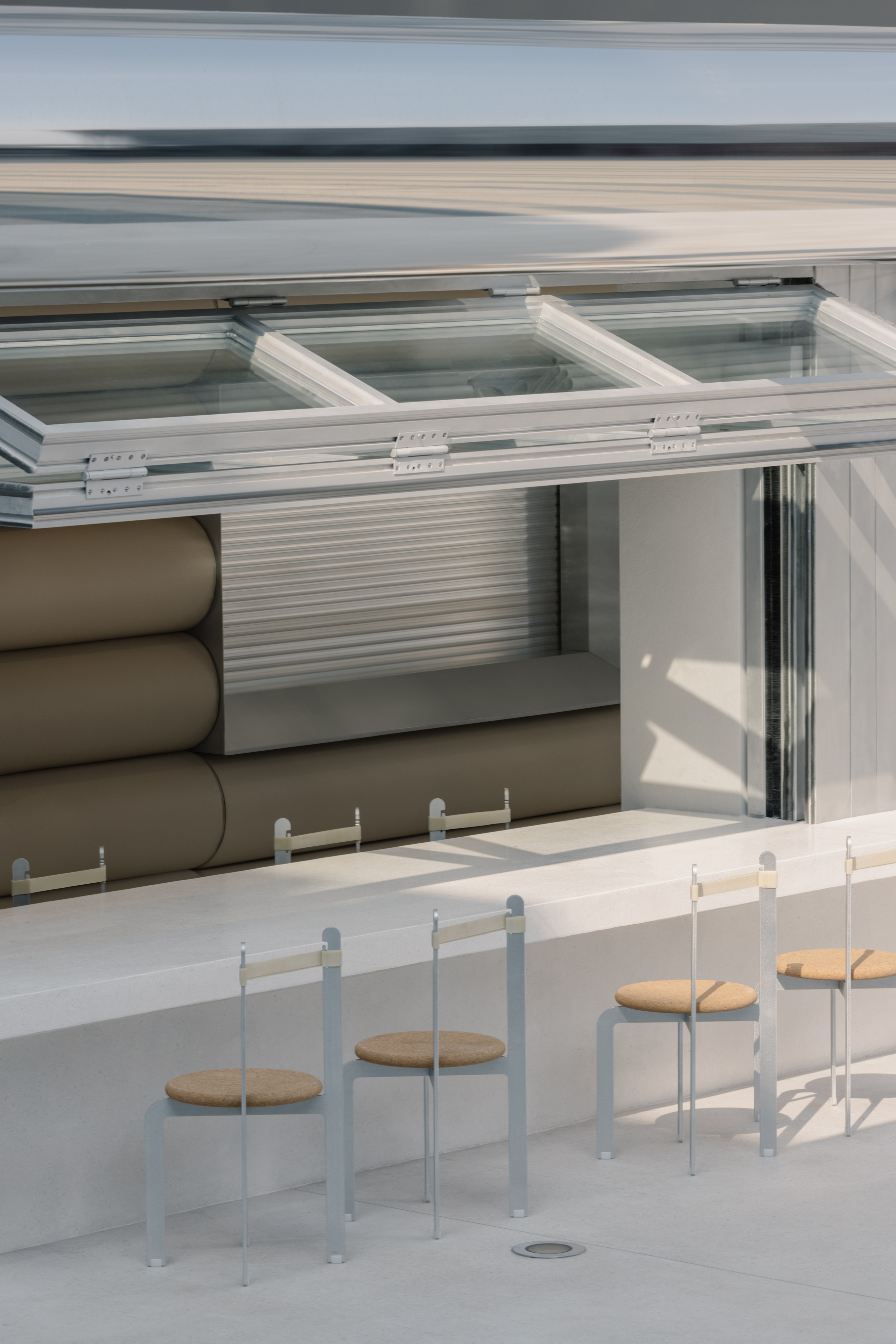 A roller shutter act as the key to the eatery's transformation. Shut off during off-peak hours for quick counter service only, the shutter opens up during peak hours meals, expanding the restaurant for full table service.