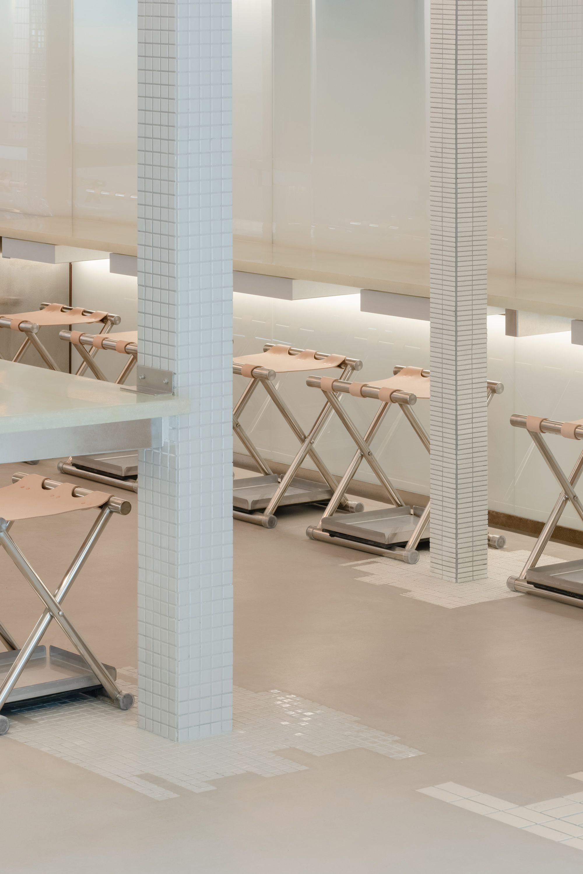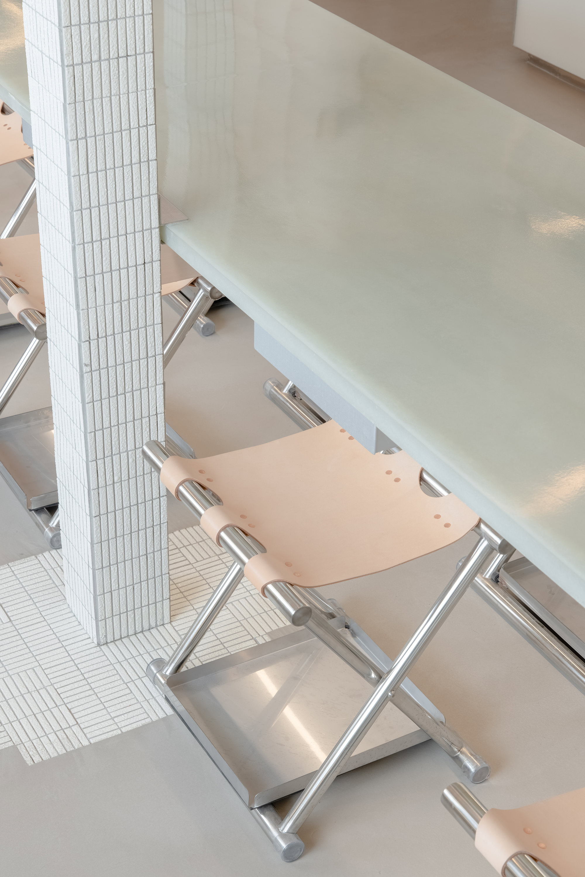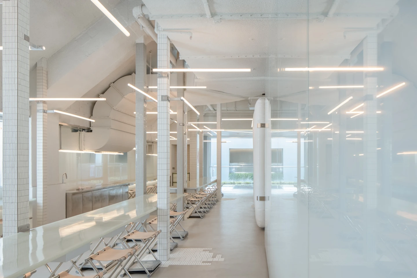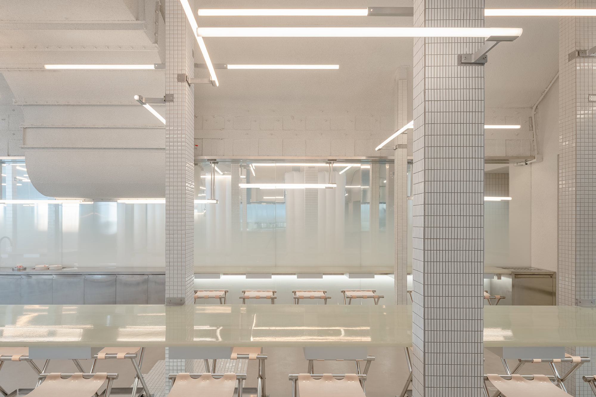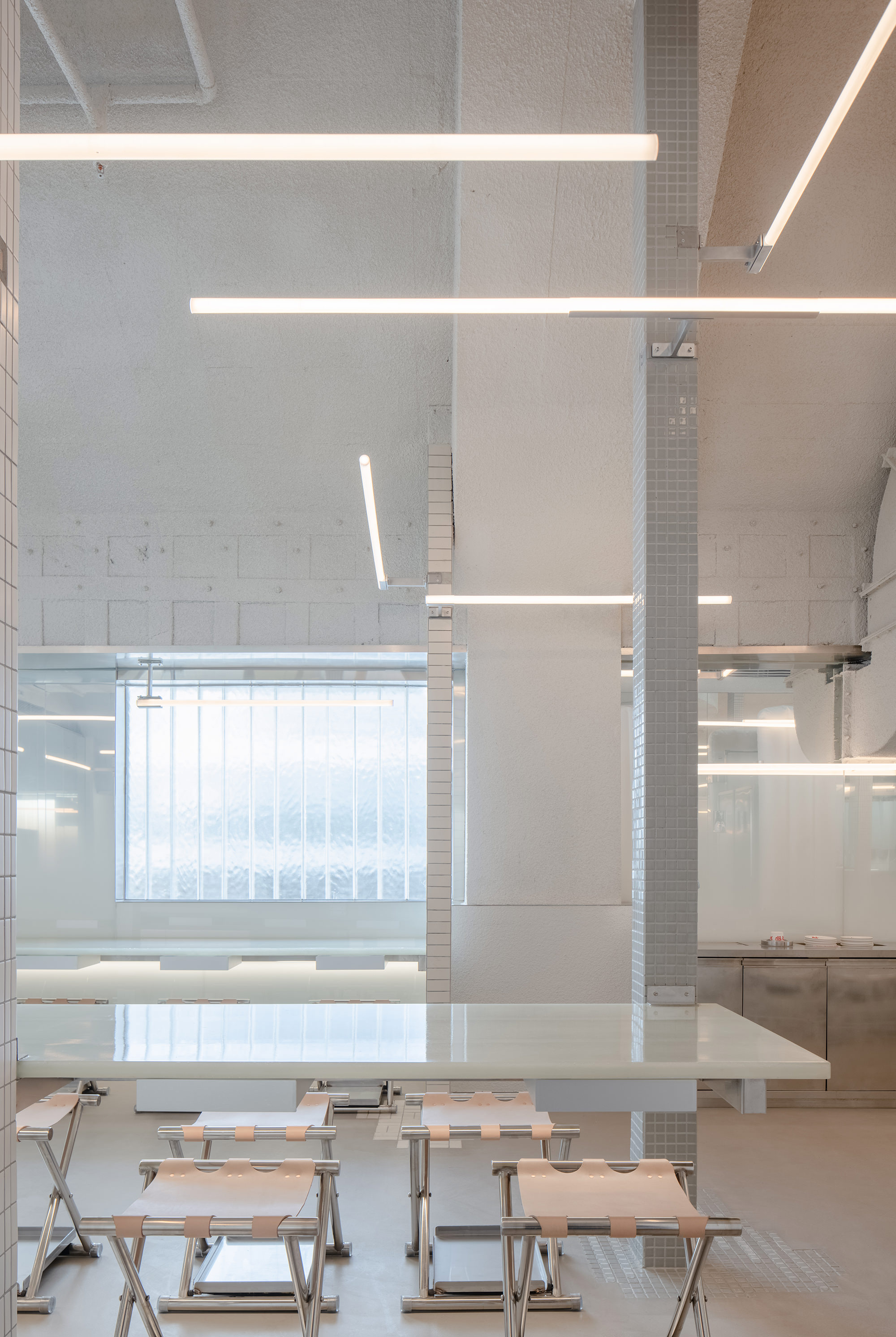 The columns also lock the centre table in their concave. Made by a long seamless slab of translucent fibreglass, the "floating" table gives each customer quick access to the utensils in the drawers. This airiness of industrial smoke, is further enhanced by the mirror glazed with gradience on the perimeter of the dining area. The mirrors partially opened up the space while obscuring foot traffic.