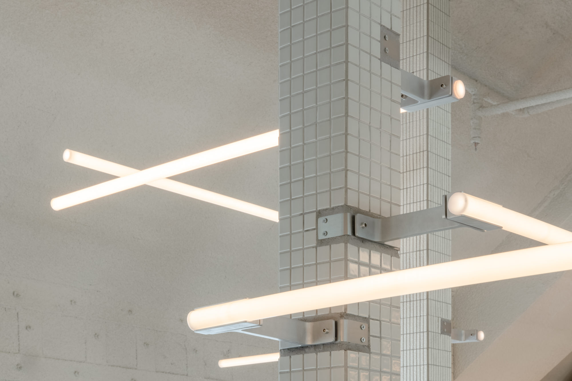 Though these columns do not support the ceiling, they remain as critical structural elements in a distinctive way. LED tubes do not hang from the ceiling. Instead, they extend out from the columns with custom-design aluminium joints. As the tubes change colour throughout the day, juxtaposing the tiles and concrete floor, they speak of the energy that permeates a futuristic networked city.