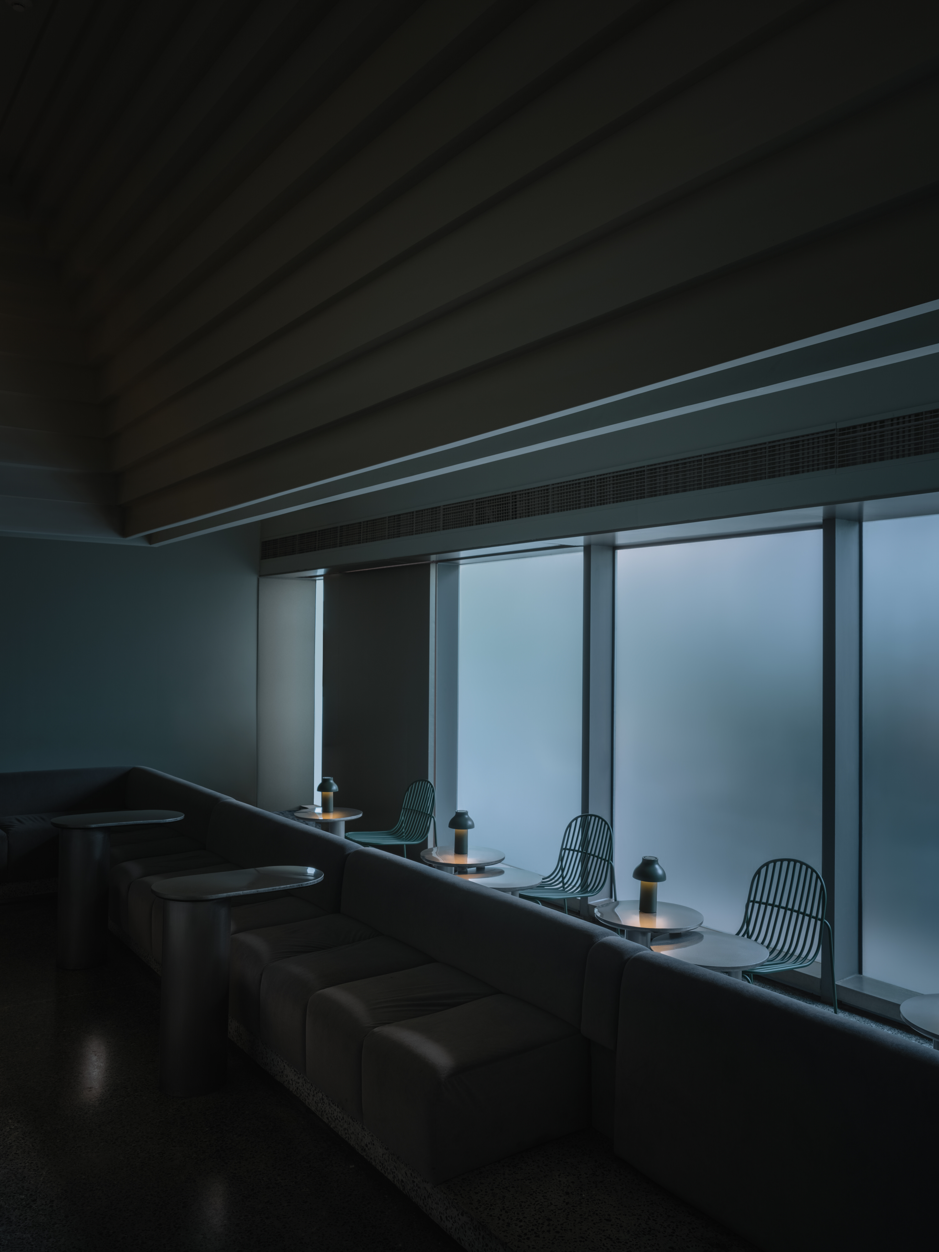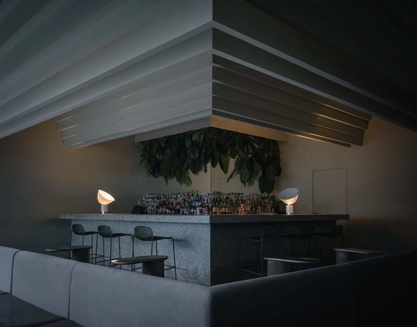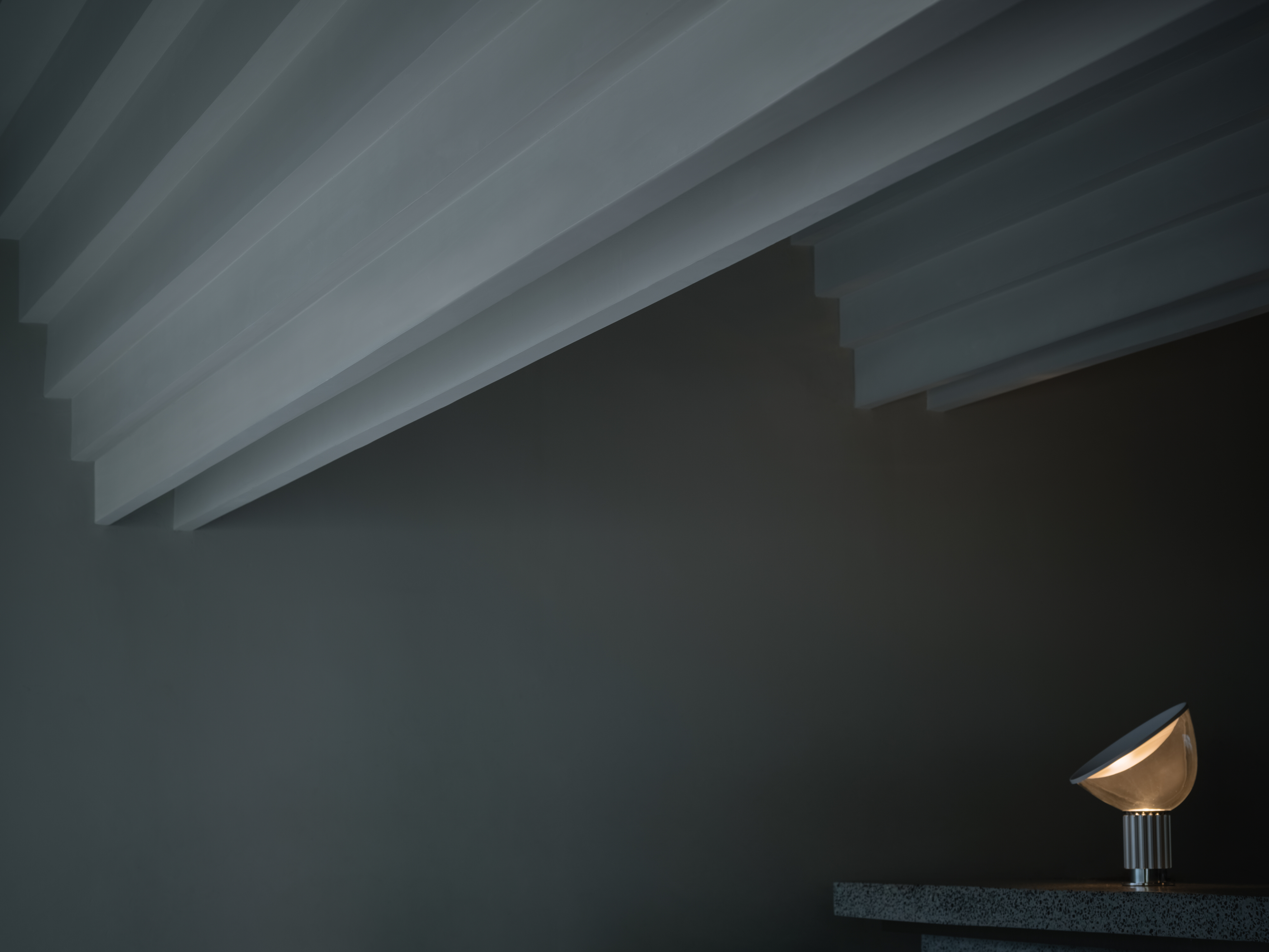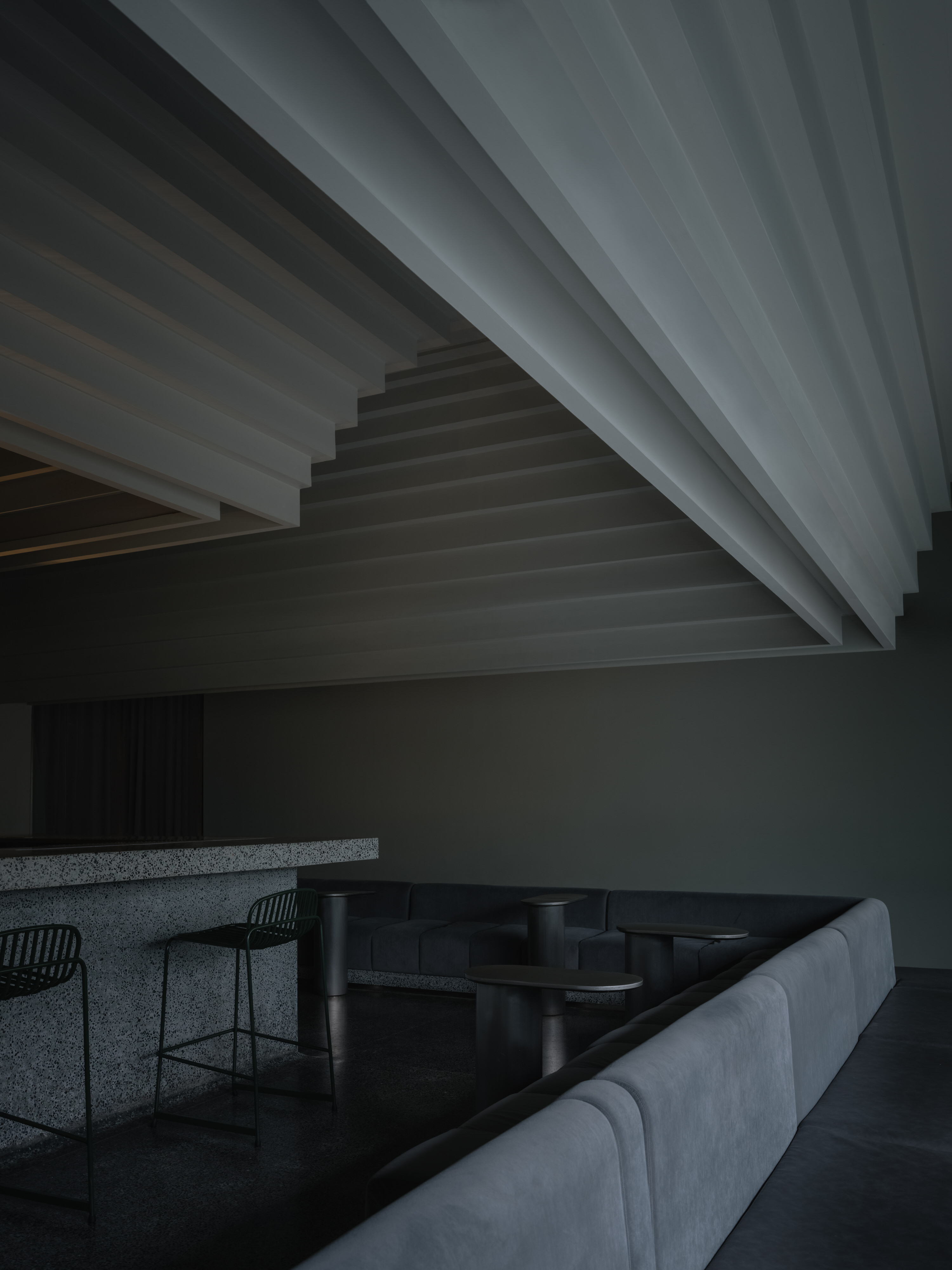 The terrazzo terrain composes a sleek and balanced layout. Each vault aligns with a ring, cupping its volume, bouncing its light and acoustics. Staggered moulding echoes the L-shape and casts characteristic shadows from wash lighting. The underlining elliptical contours of the arches contrast and soften straight lines and corners around the room.