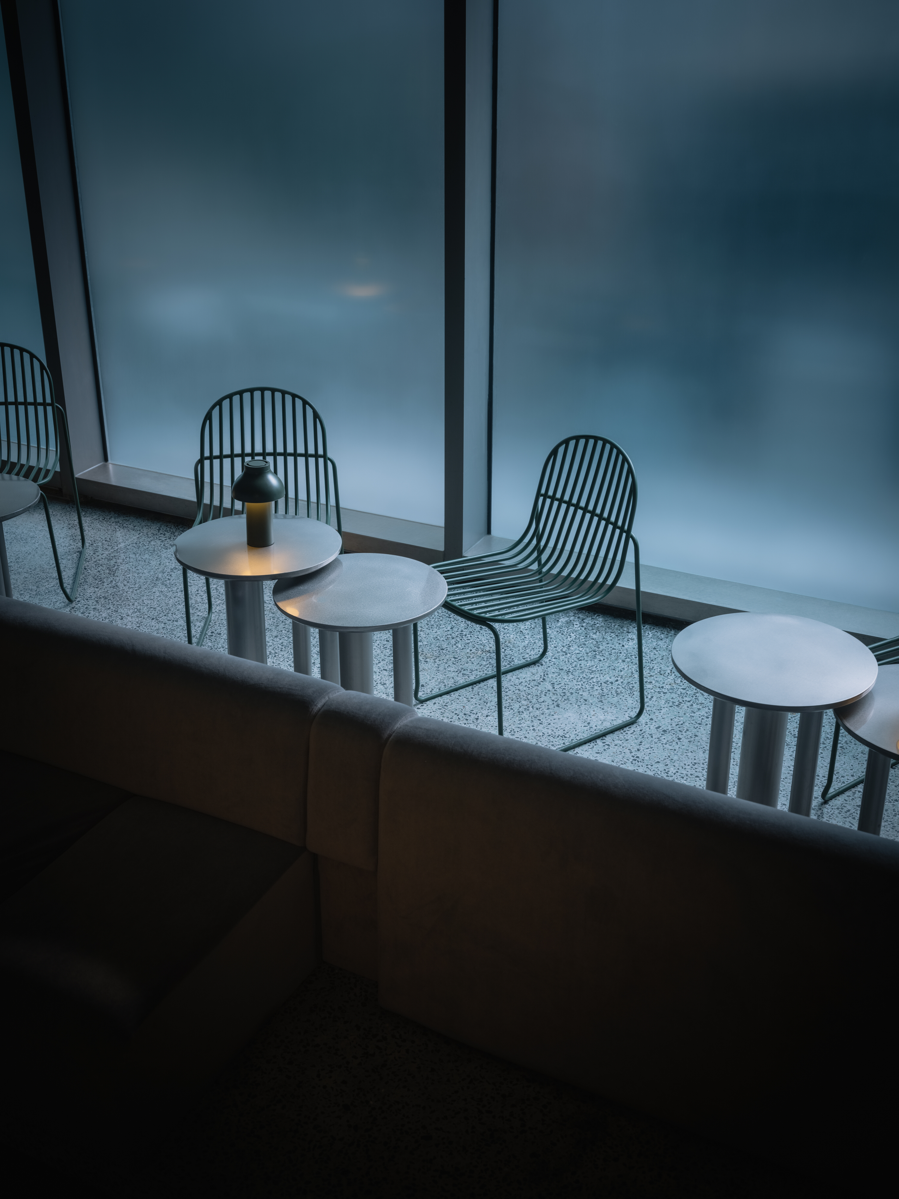 The designer capitalises on this dubious way of entry and delights the patrons with a sense of exclusiveness and privacy that contrasts the busy neighbourhood. Toward the end of the passthrough, the design shapes a small courtyard sheltering a few tables beneath a canvas canopy. A continuous bench of stainless steel lines the existing planters, wrapping the courtyard with plentiful greenery among glass towers. An urban oasis, it instantly relaxes the mind upon patrons' arrival.