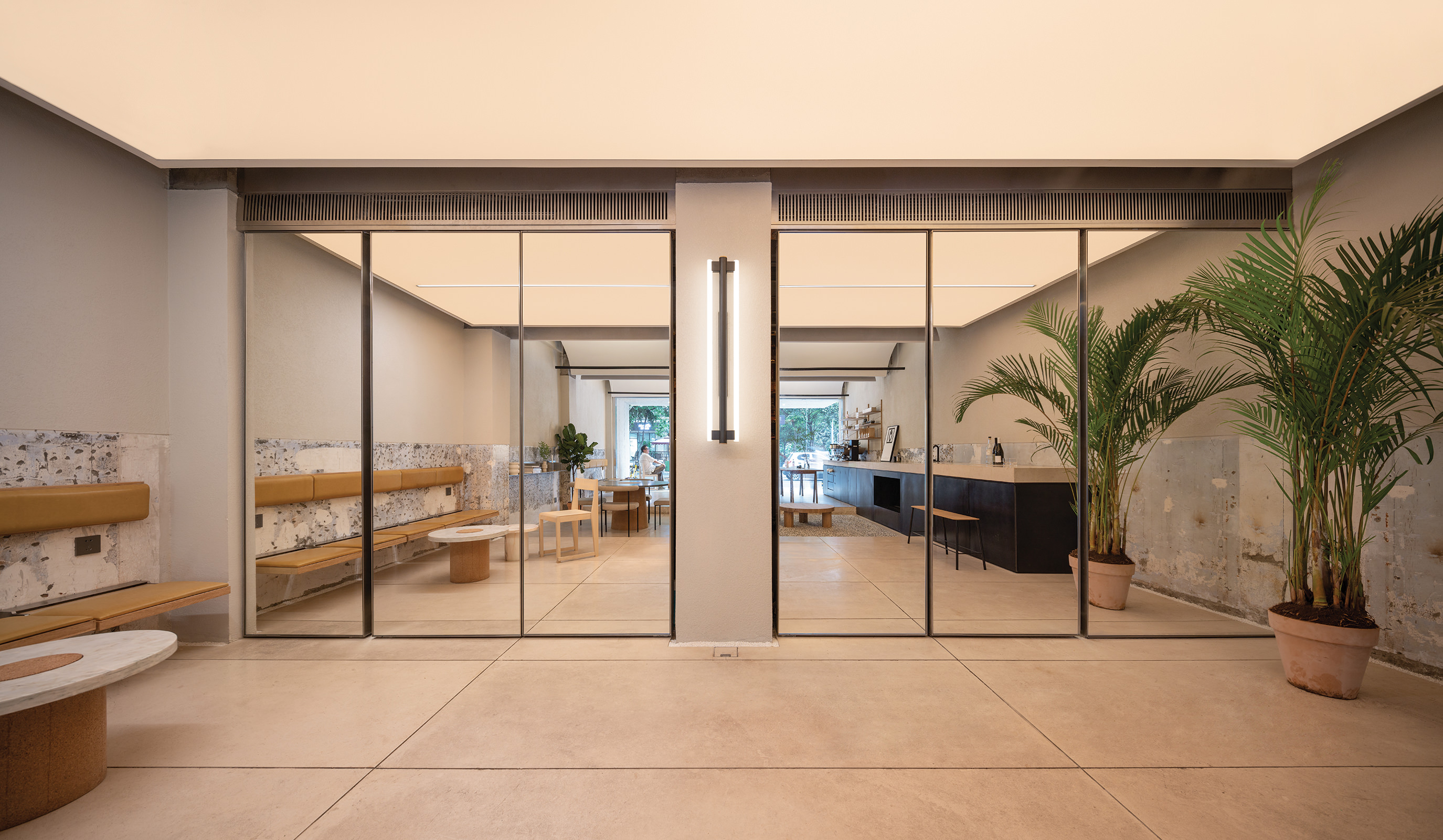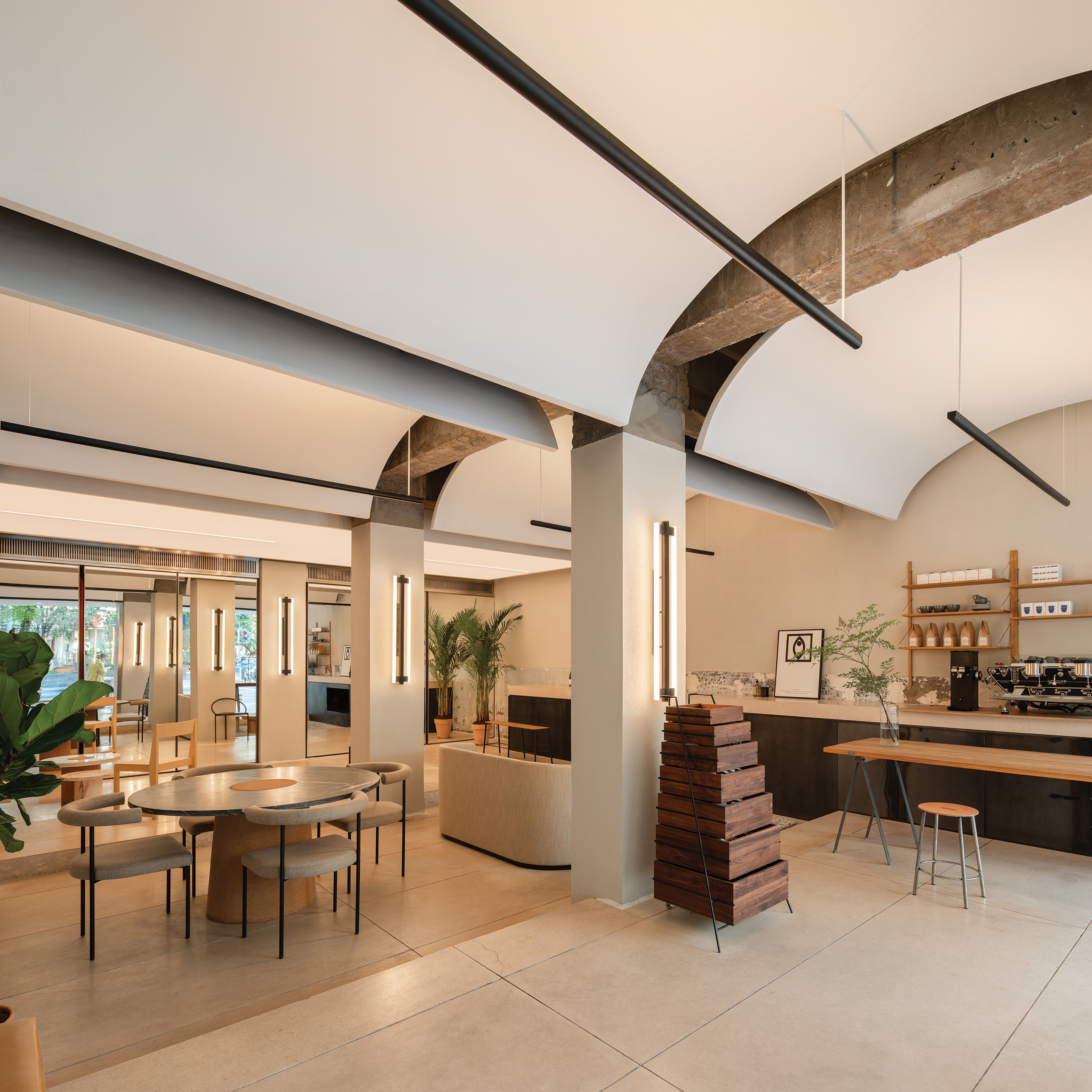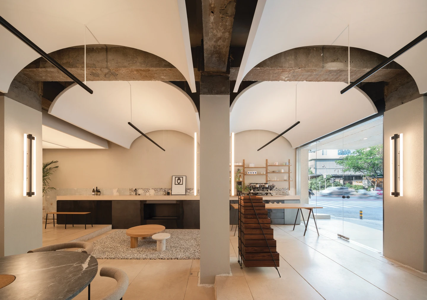 The division of three is knitted by a repetitive yet idiosyncratic gesture - the floating elliptical arches. They bring a sense of character to the store without occupying any footprint. Hovering in the air with confidence, these arches are juxtaposed by exposed ceiling and columns.
