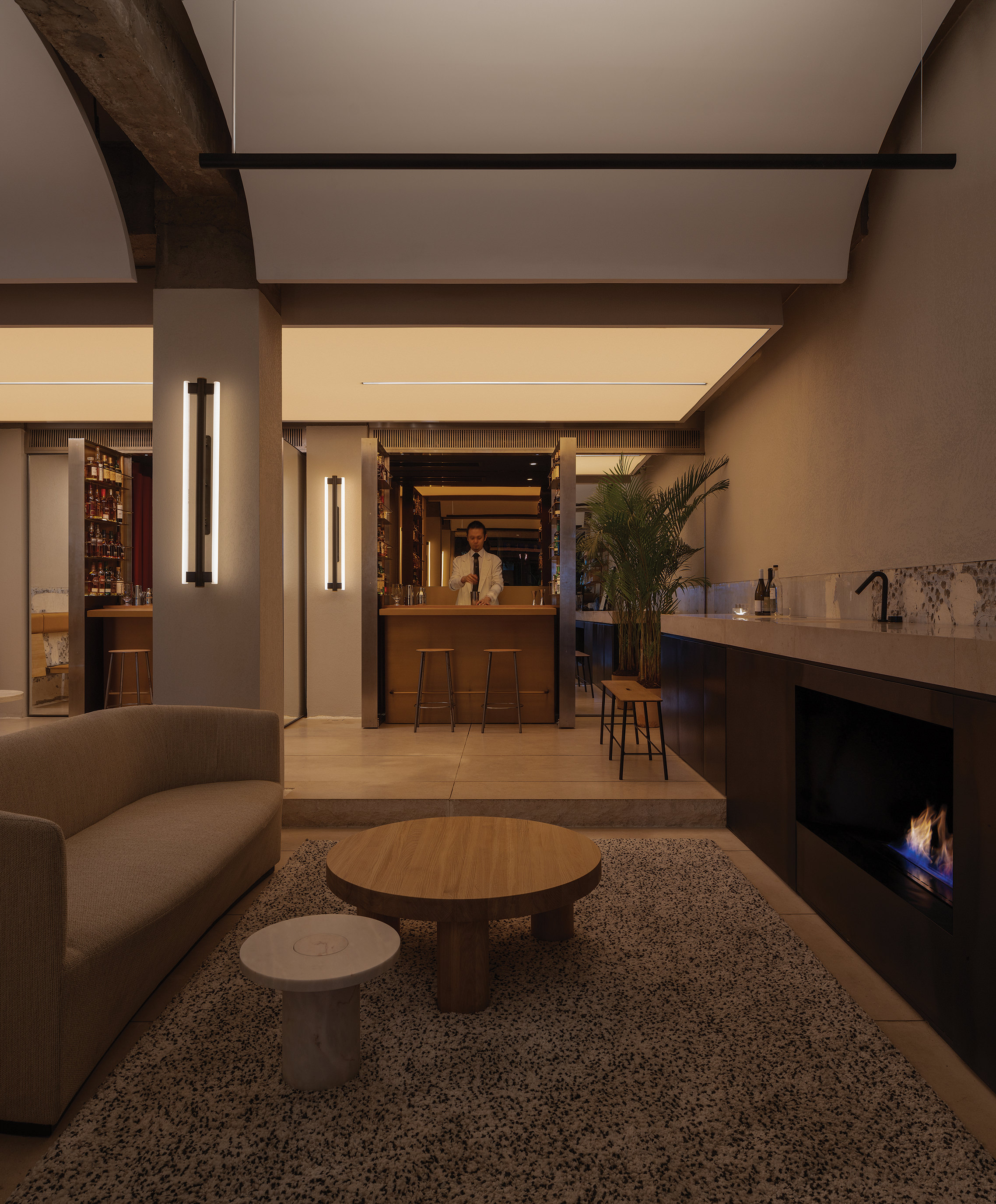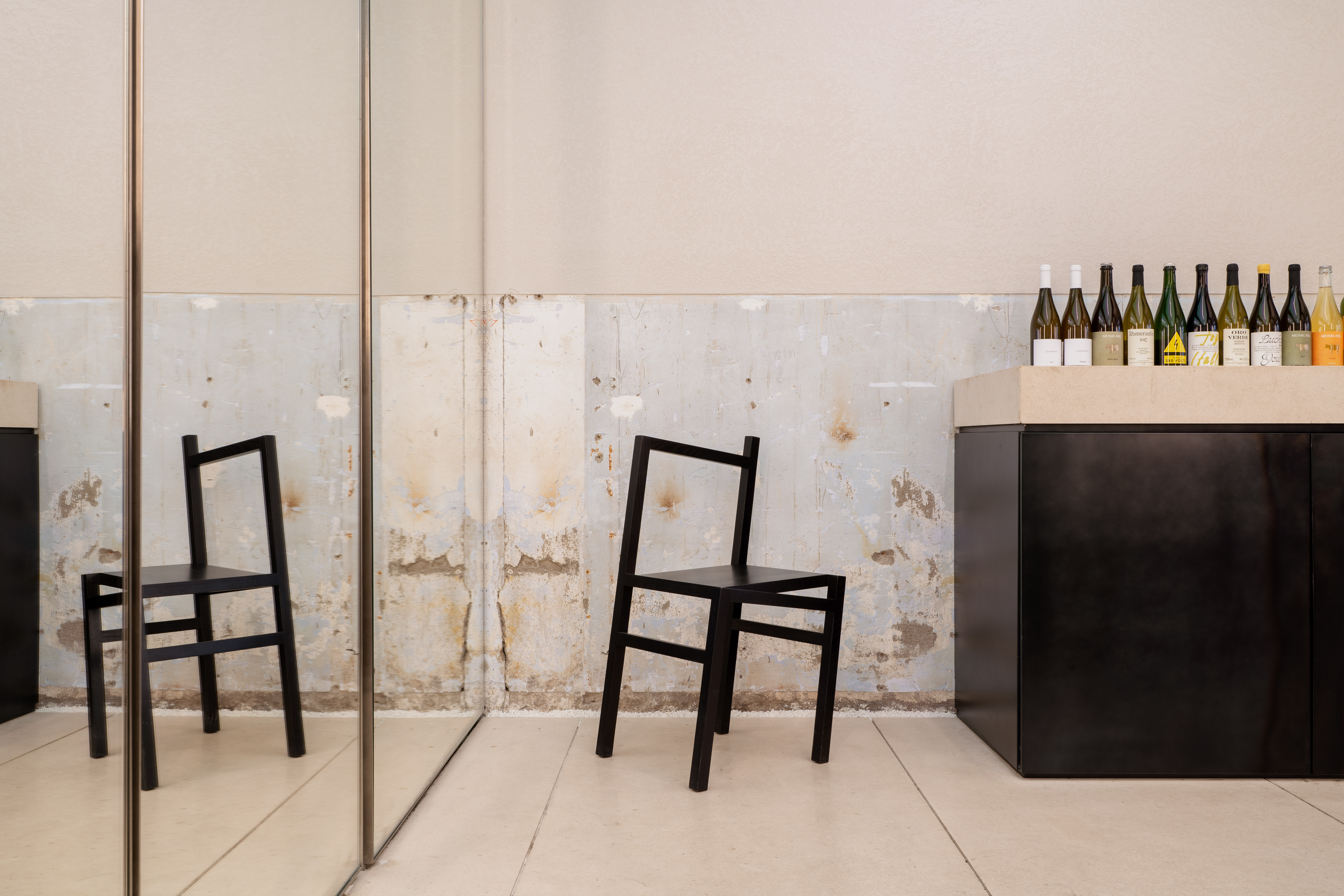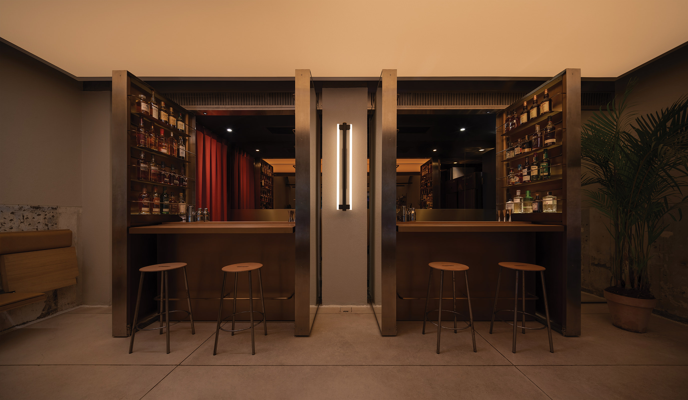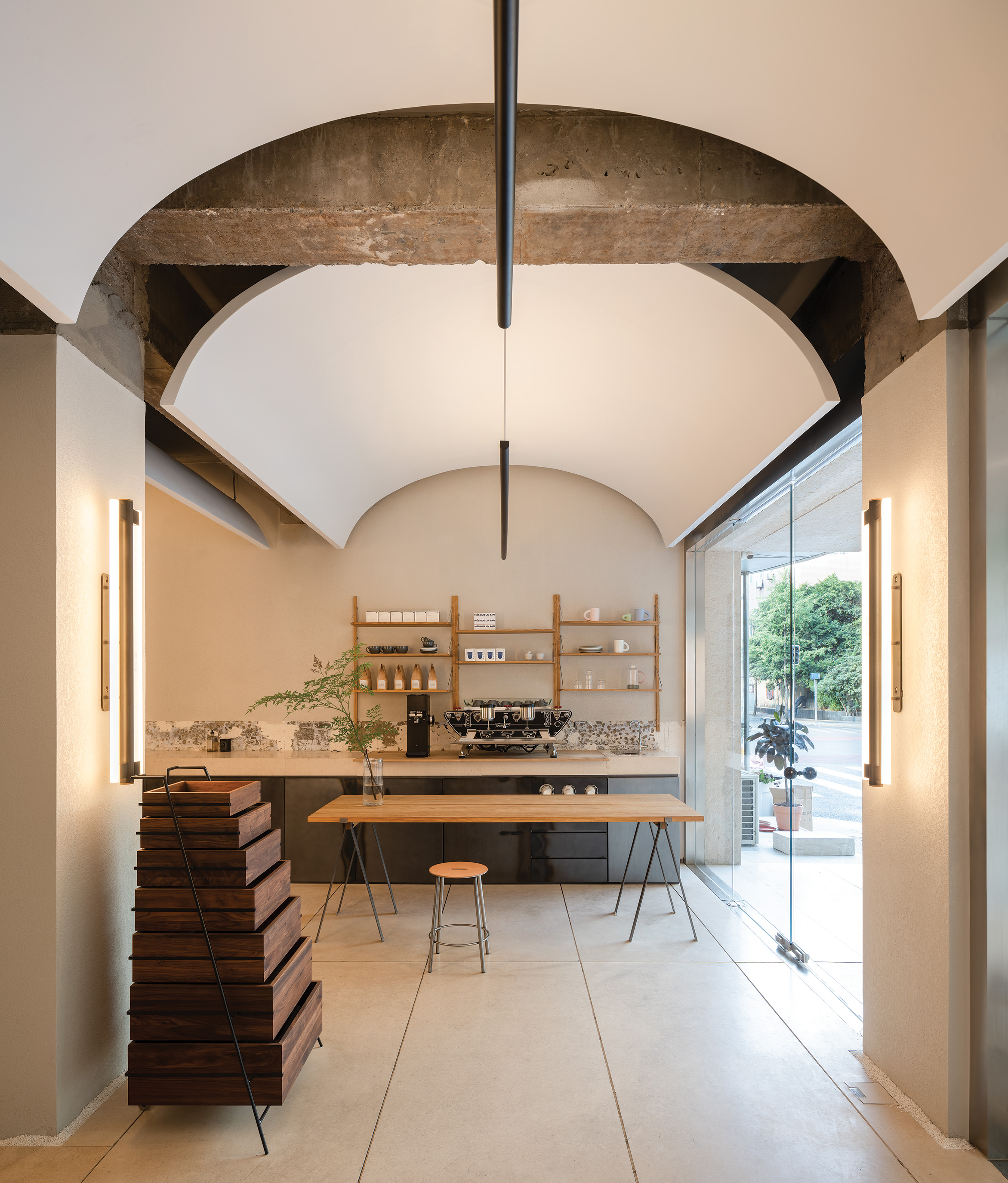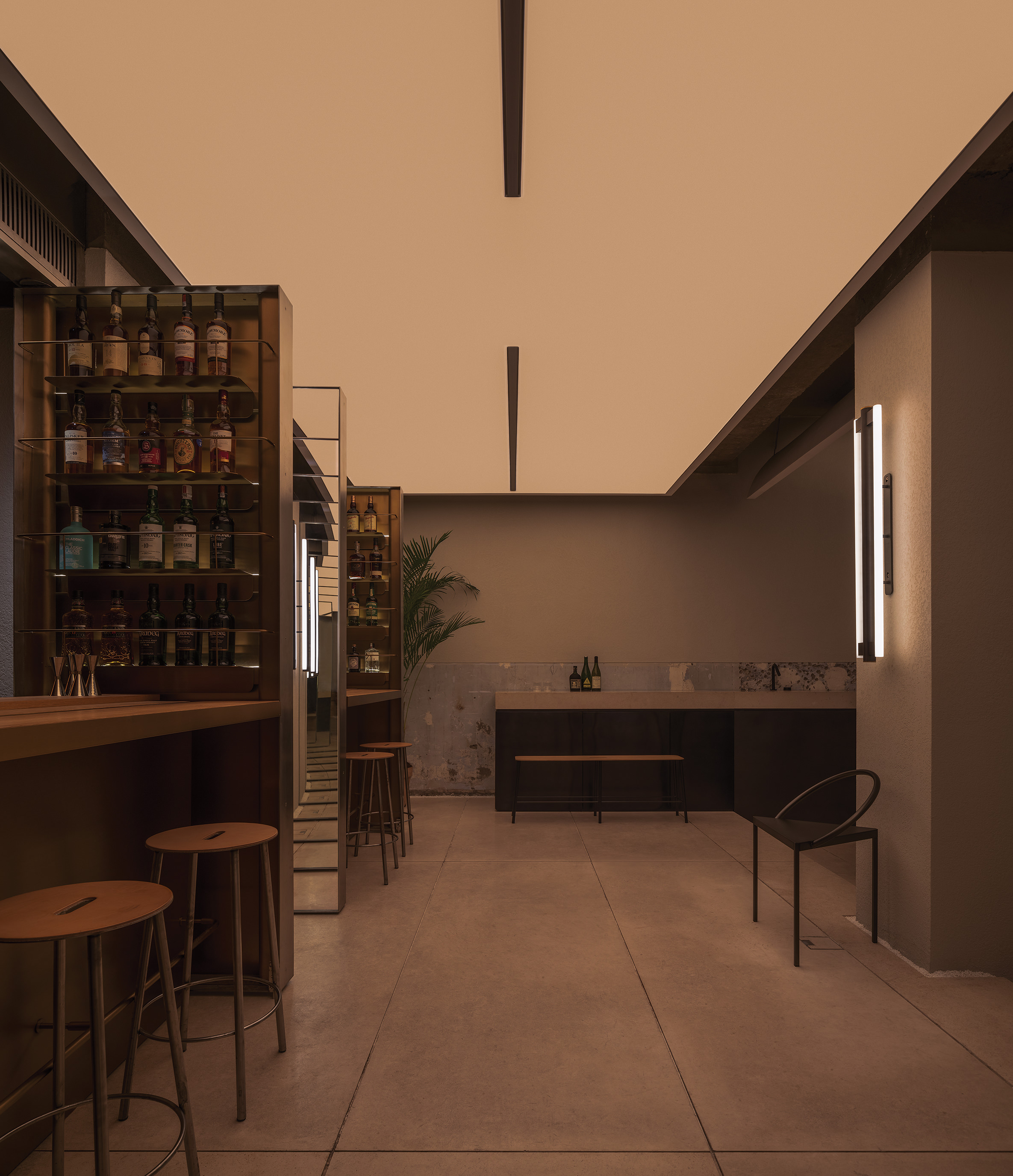 This sense of order blended with rawness is reversed and carried out on the wall too, where bands are left untouched alongside perfectly painted upper sections. When the night befalls, the space can transition from a sophisticated design store to one of changing moods. Toward the bar, the last arch section is membraned and backlit with colour-changing LED to infuse different flavours into the space. And the hidden cabinets behind the mirror open up, where curiosities arise from the reserved narrow strip of space as bartenders to attend the dark.