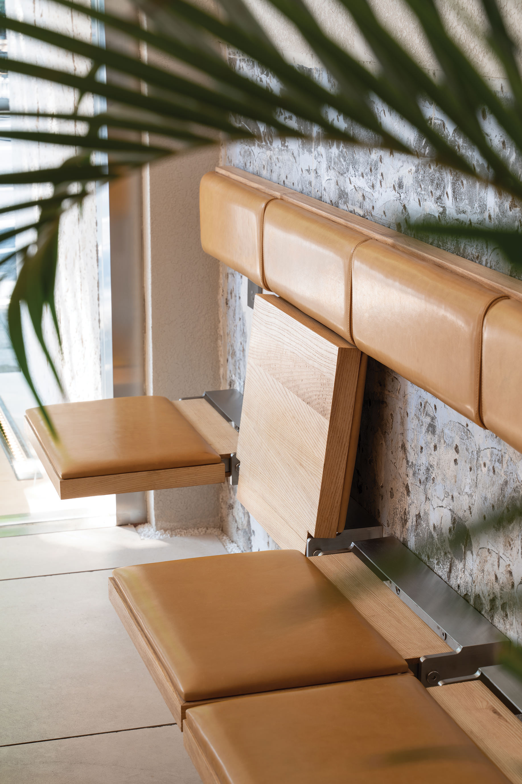 Because of products’ seasonal nature and a desire to keep customers invigorated and inspired, Office AIO laid a sectioning foundation that allows a variety of scenarios and presentations. Few fixtures are implemented to anchor the many potentials for future activities and arrangements. A long sandstone counter set along one side of the wall ready to shelve coffee machines, small products, or even roofing a fireplace. While on the other side, custom-made flip-down seats create a sense of interaction that invites people to actively engage with the things in the store. A central middle section is lowered down a step, creating an area that is embraced by two neighbouring divisions, ready to host congregation and related amenities.