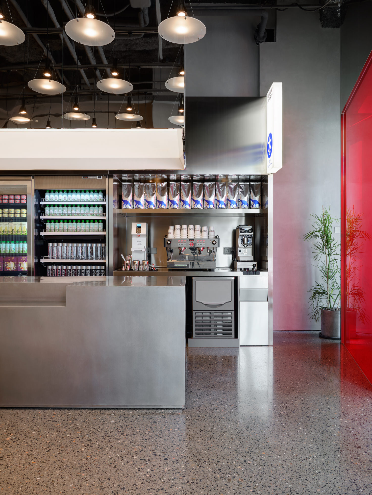 The seating areas are laid out in a linear fashion facing the “stage” and carry a stainless steel aesthetics from the Kitchen to the bespoke tables. Various table heights and sizes are purposed to fulfil patrons of different group sizes and social interactions: tall benches by the store facade for those who enjoy watching the ever-changing scenes in the office plaza, square tables for small gatherings with quicker turnover rates, and two sets of large tables to accommodate meetings over business meals.