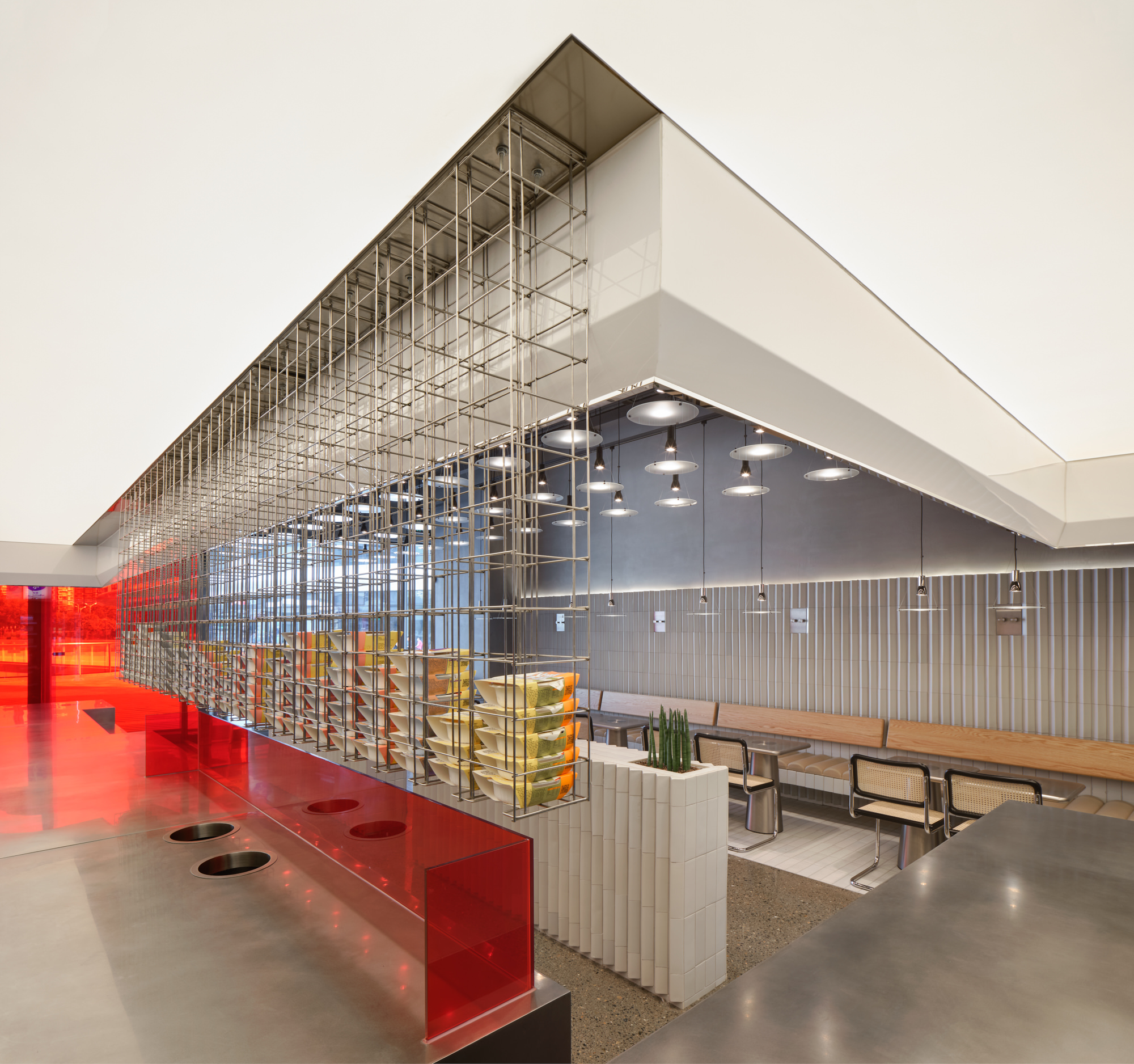 To “stage“ the Kitchen, custom-clad freezers and refrigerators used to stock all of the restaurant’s food supplies are neatly lined up and methodically positioned to correlate with the functions assigned in the two stainless steel-clad kitchen bars. A series of rigorously constructed yet airy shelves containing the boxed meals are strategically hung in the middle of this organisation, being the climax of the performance, bring forward a fluent yet dramatic impact to the act. This scene further intensified by a suspended volume of membrane lighting. The spatial arrangement allows for the fully exposed and streamlined workflow “performance”, from selection, food preparation, to collection of meals, to be celebrated and confidently observed by its customers.