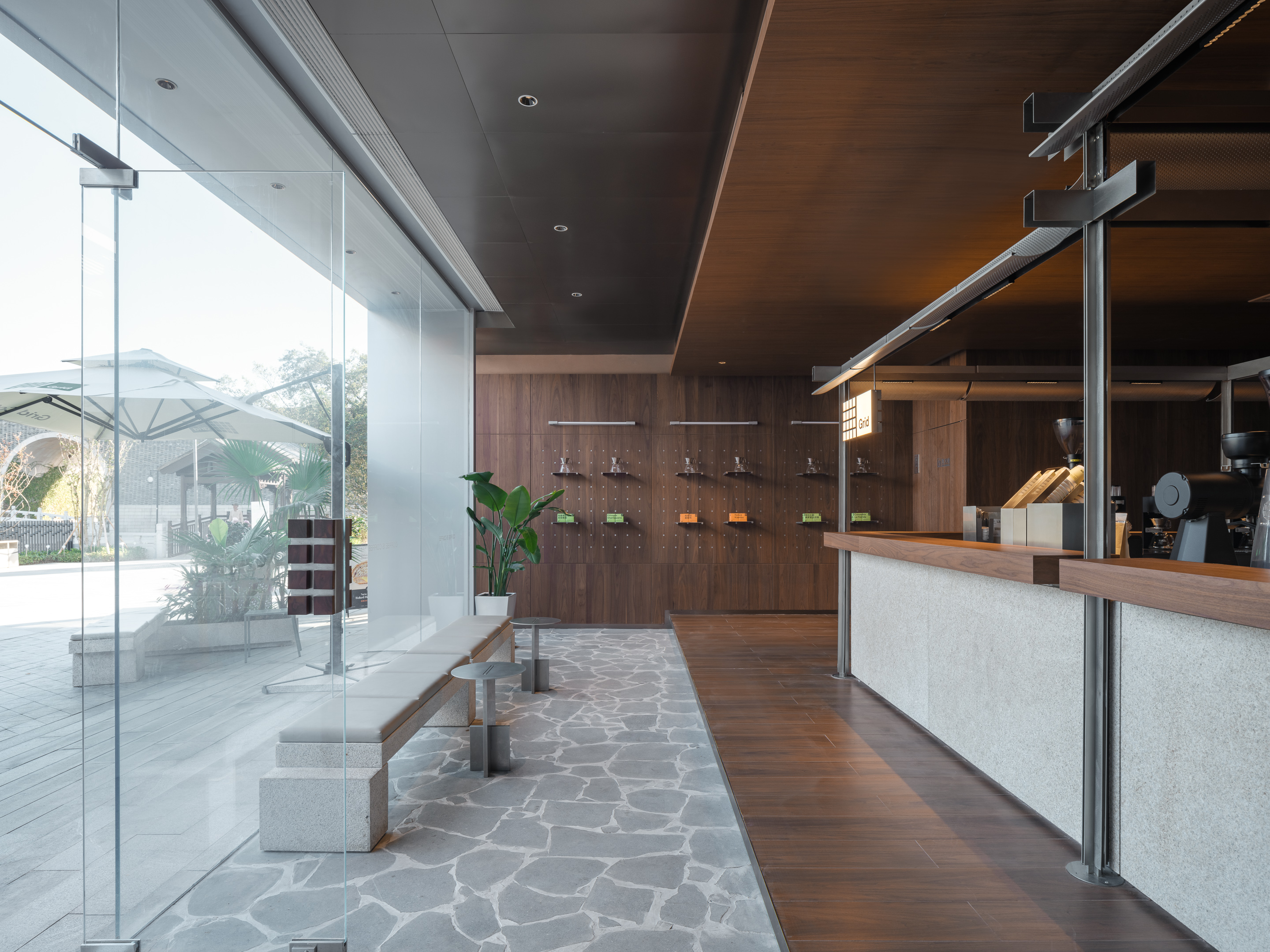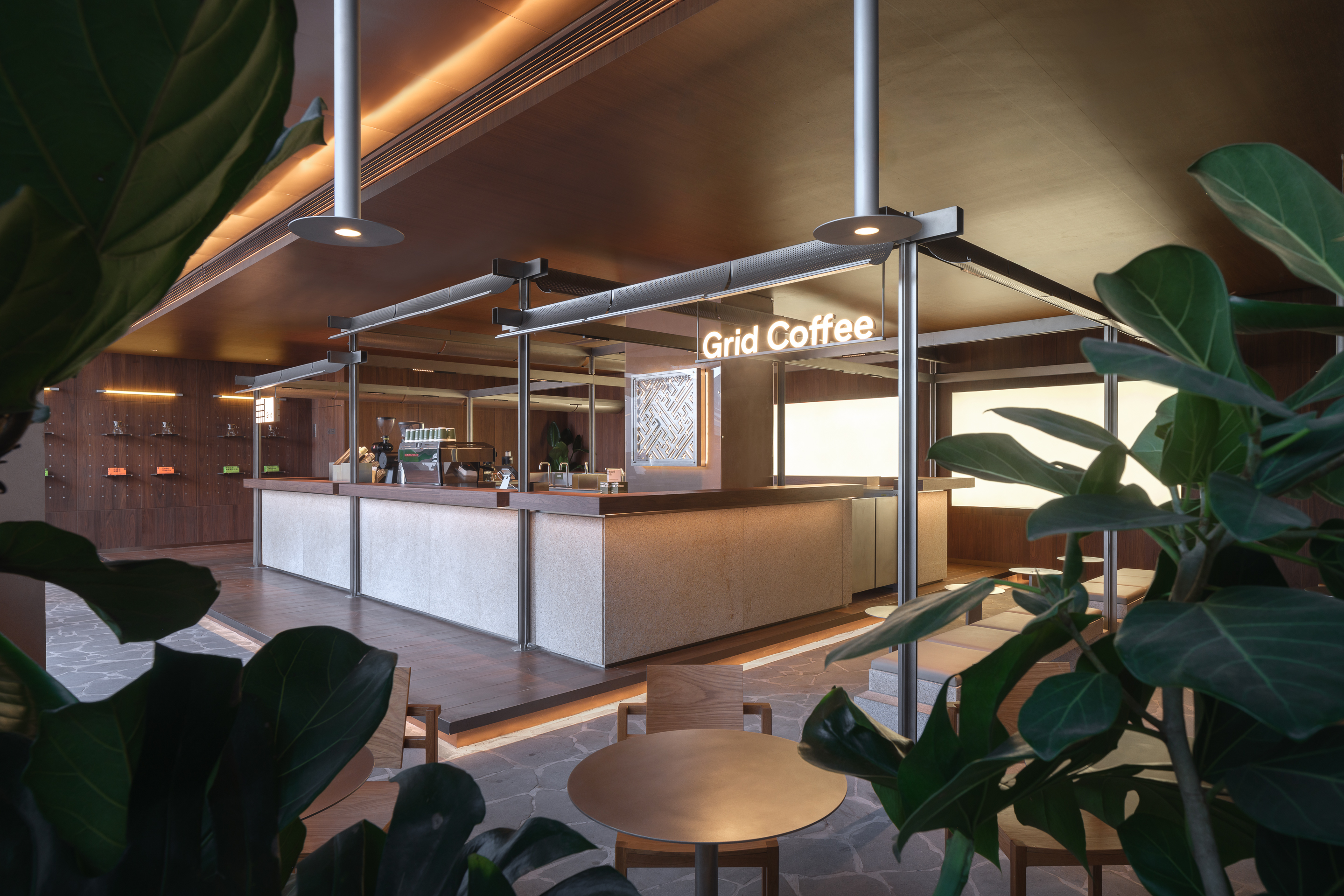 拥有充裕的164平方米空间、极具优势地面向商场的入口广场,其落地玻璃幕墙店面内,一个高雅而朴实的结构系统,轻盈地落在地面。 这个略被架高的中央吧台系统为一组铝制的框架构成,抽象地渲染了苏州传统的阶梯式屋顶,微缩成一座精致物件在室内空间里产生新的互动。 中央吧台不仅能提供 Grid 著名的意式浓缩咖啡,更重要的是能为其新推出的 “free-flow drip-coffee tasting menus” 提供一个能舒适并能专注享用咖啡风味的环境。