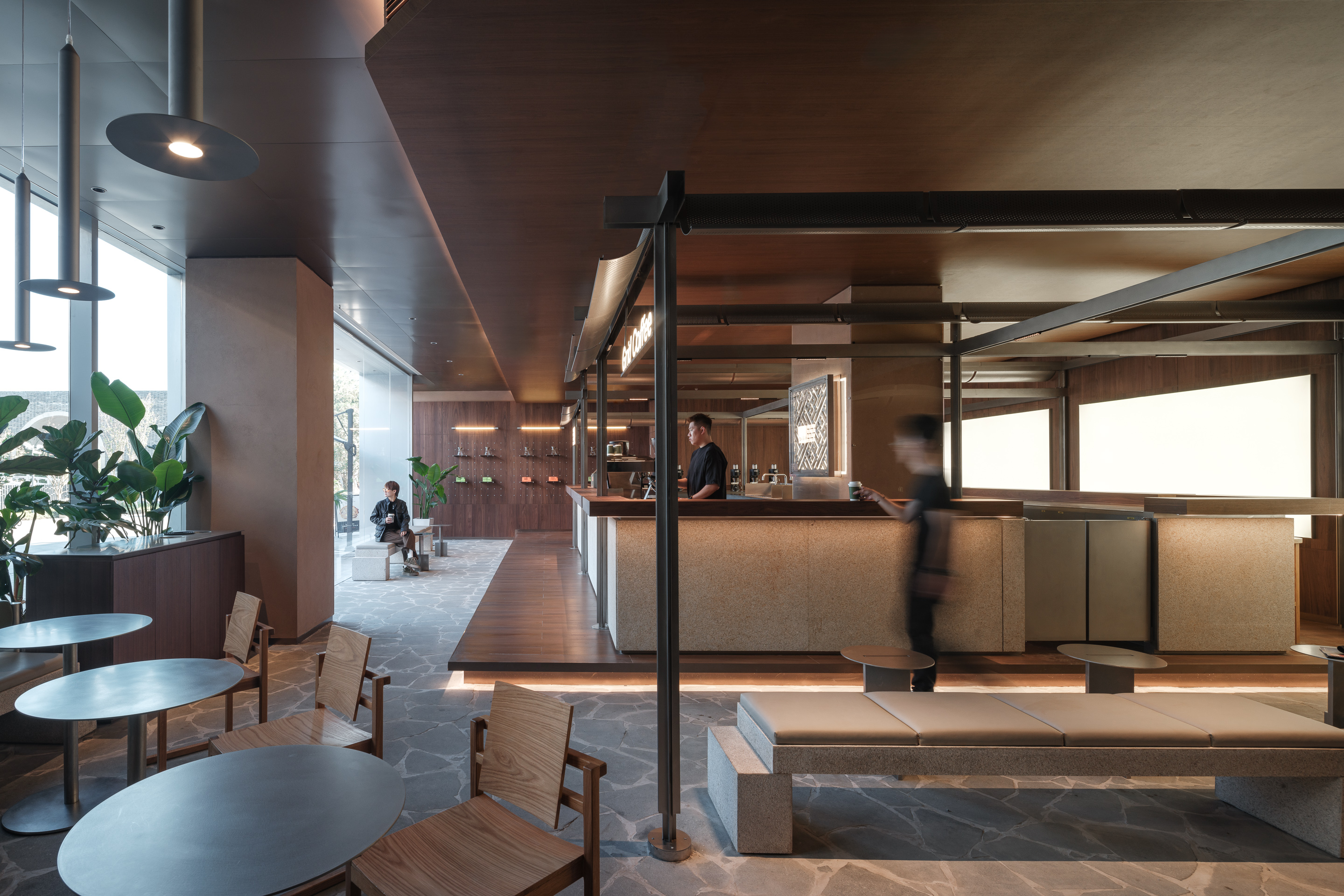 贯穿了 Grid 空间美学系统的胡桃木内饰,优雅地勾勒出钢结构框架,突显建筑轮廓,从外部观望时尽显独特魅力。这一背景与Grid的简洁品牌身份和谐共鸣,而对比鲜明的深色疯狂铺设的玄武岩或板岩地面,让人联想到精致园林小径,进一步区隔了吧台区与其他室内空间。这种材料的选择不仅增强了视觉吸引力,还搭建了传统与现代元素之间的桥梁,将空间转化为不仅仅是一家咖啡店,而是一个文化聚集地。