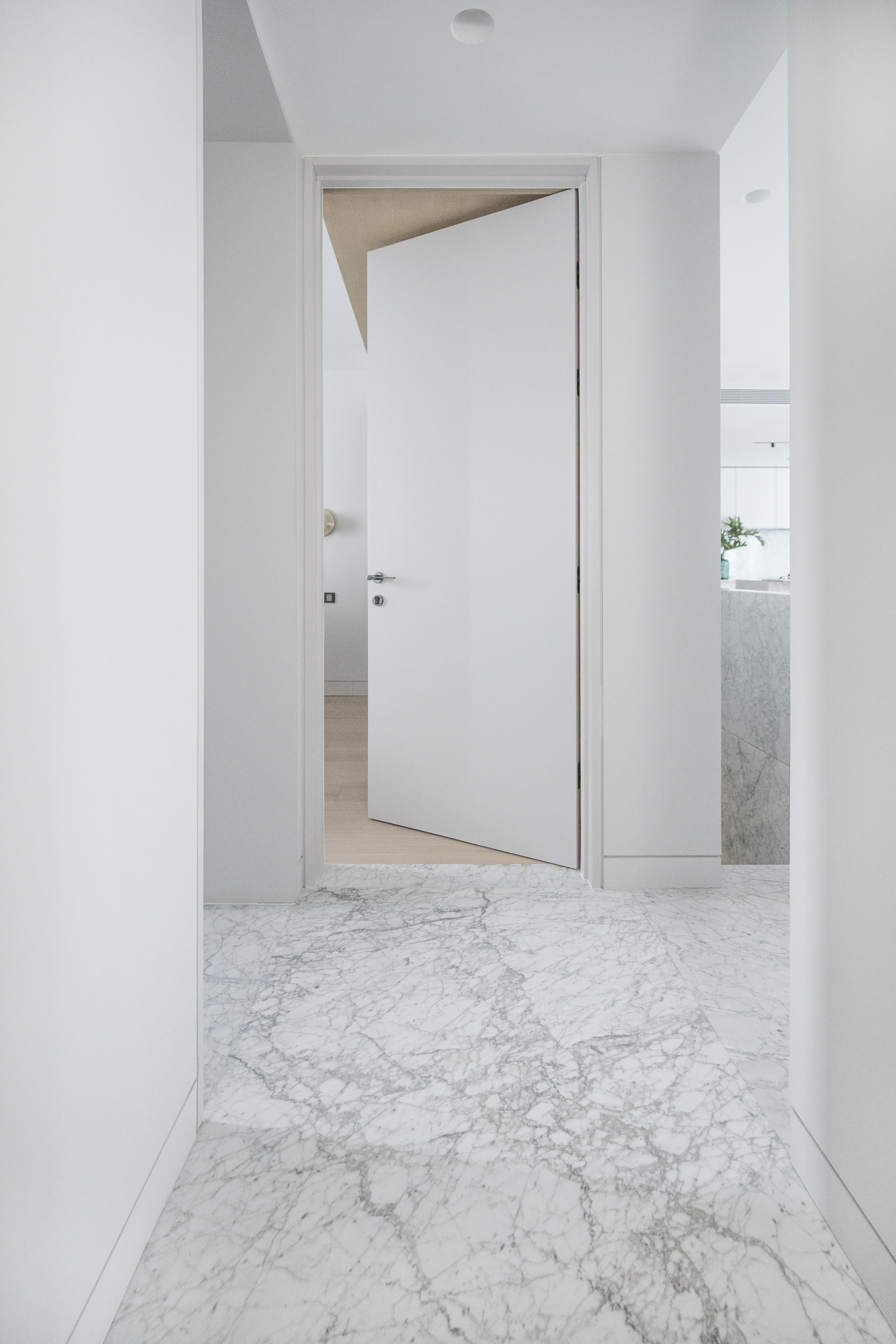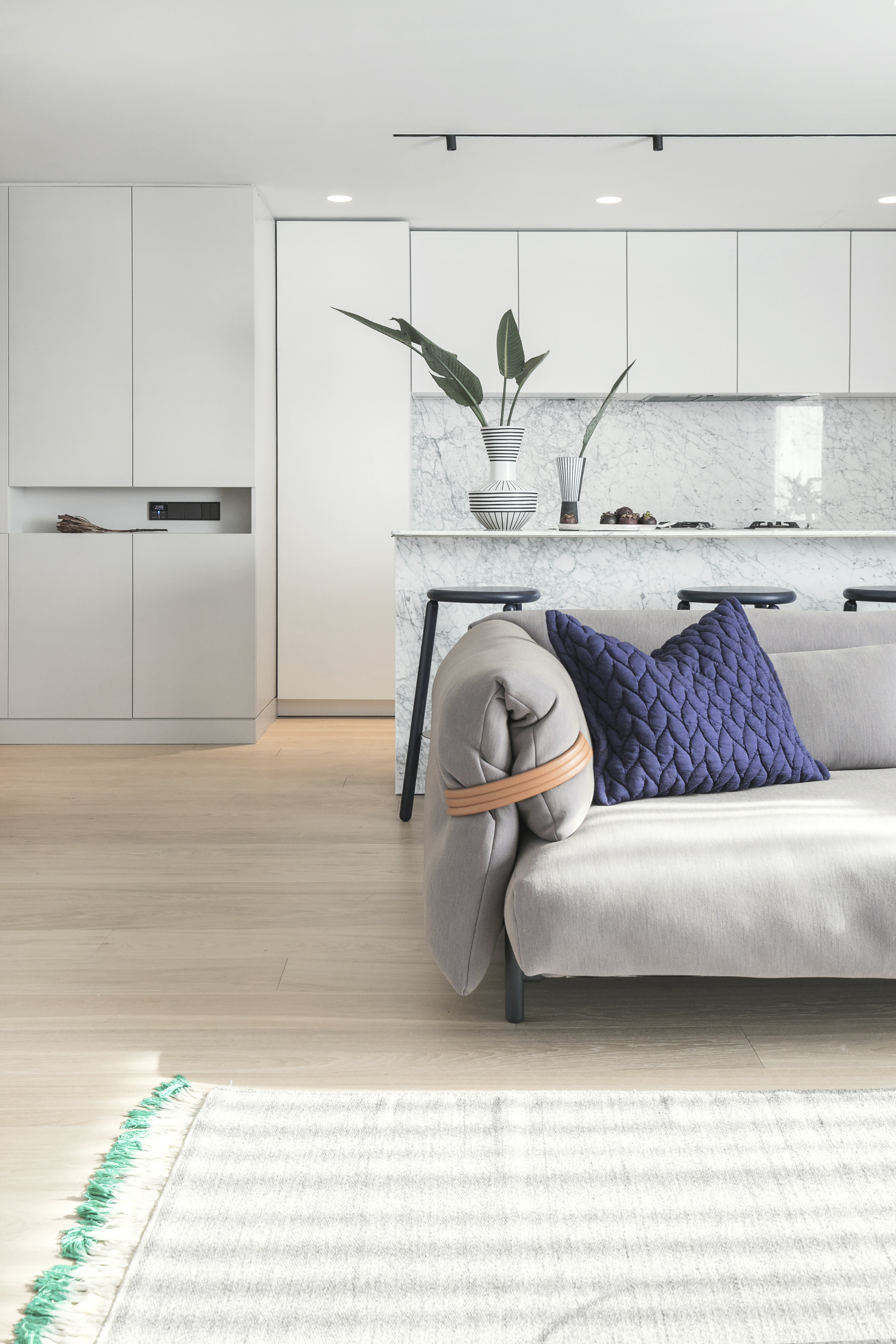 温暖的白色和灰色调在起居空间中流淌,而全高的厨房橱柜旨在淡化成背景。饰面颜色的选择也是为了与意大利卡拉拉白大理石厨房中岛和客厅边的栏杆相呼应。