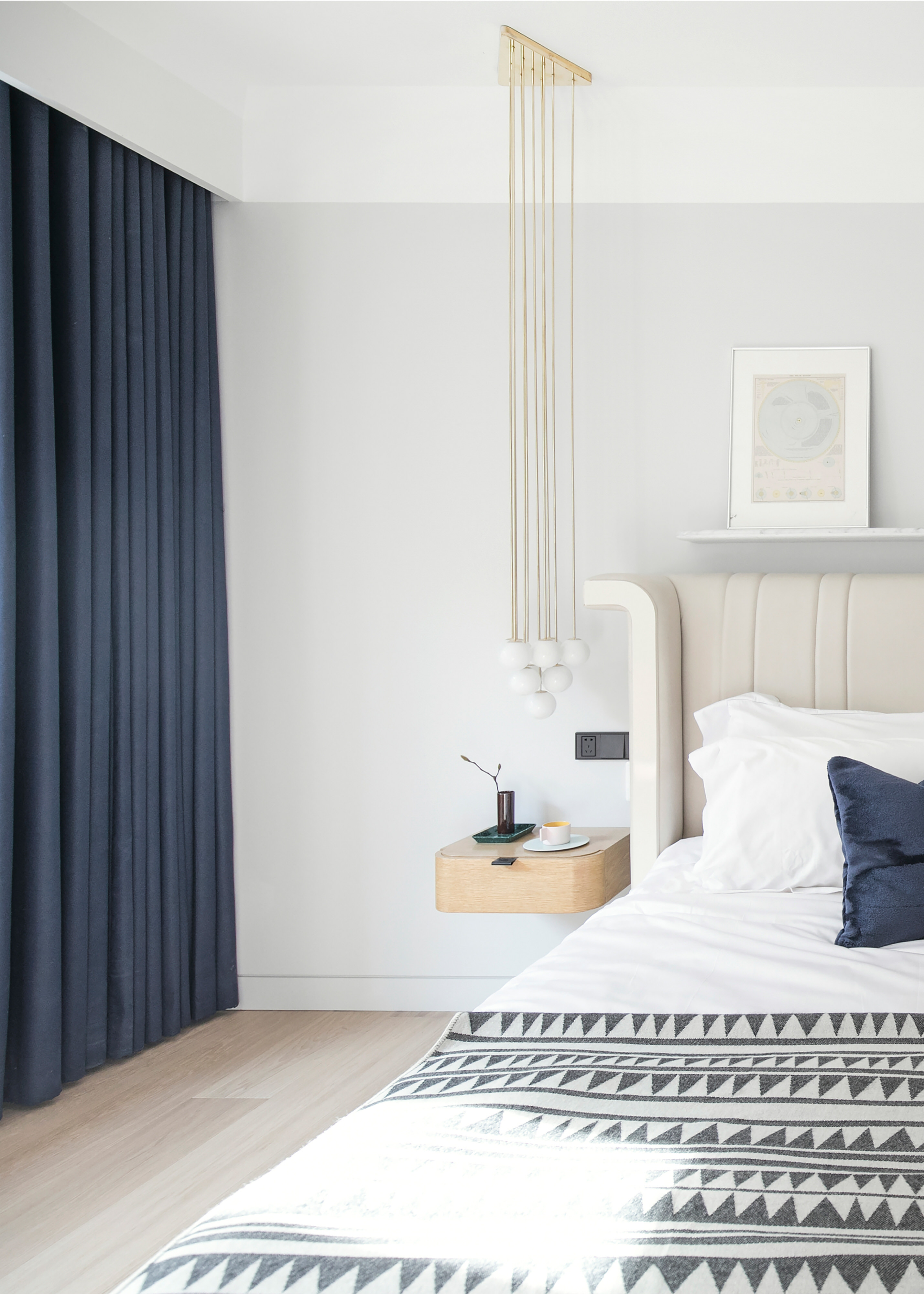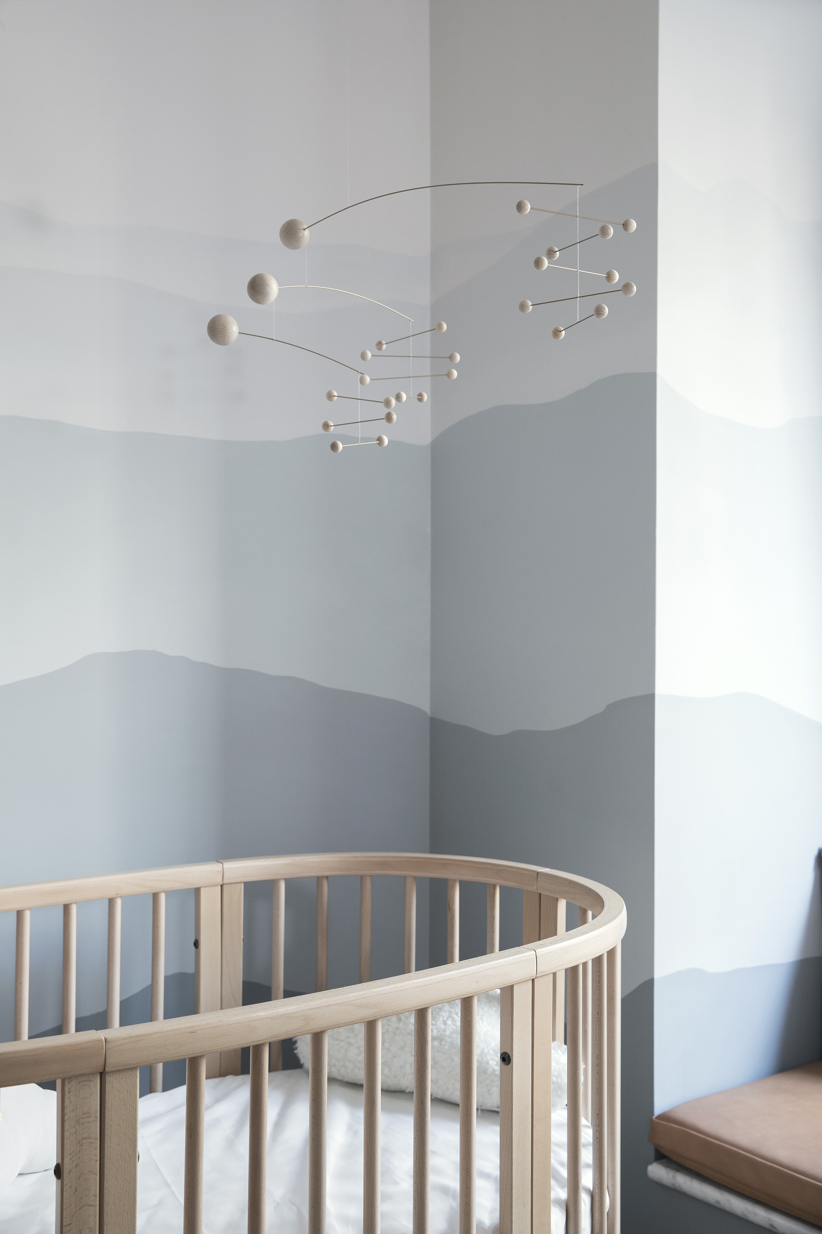 妍希和晓提出,宝宝的房间希望可以设计一个有蓝天白云的天花效果。在了解空间的小尺度后,Office AIO 感觉天花板上的涂鸦会产生压抑感,最终模拟出壁画的形式将其想法表现在房间的墙面上。一系列淡蓝色自染渐变的手绘墙形成一个温柔的景观,环绕着婴儿的床,创造出一个舒适的场景,也在视觉上打破了墙面和天花的界限。也精心地选择了实木球体的悬浮挂件,搭配蓝色的Thonet Furia 小木马摇椅,准备好成为男孩最优雅的陪伴。