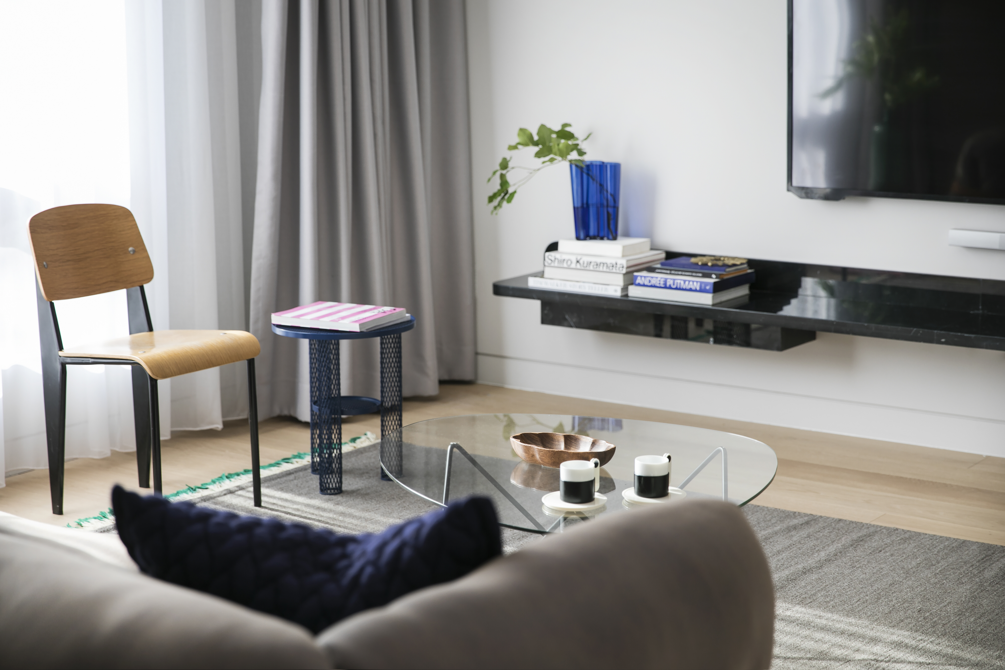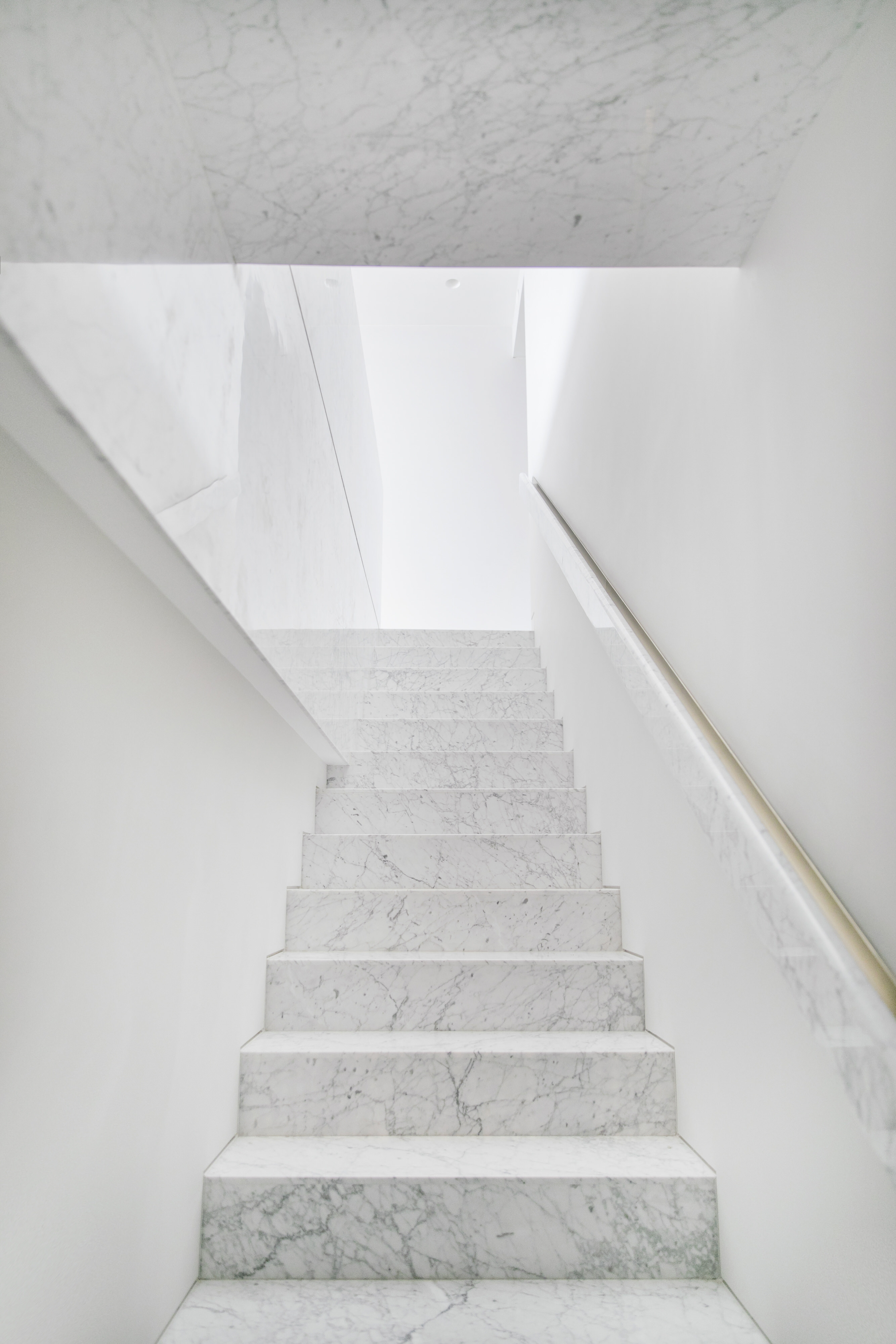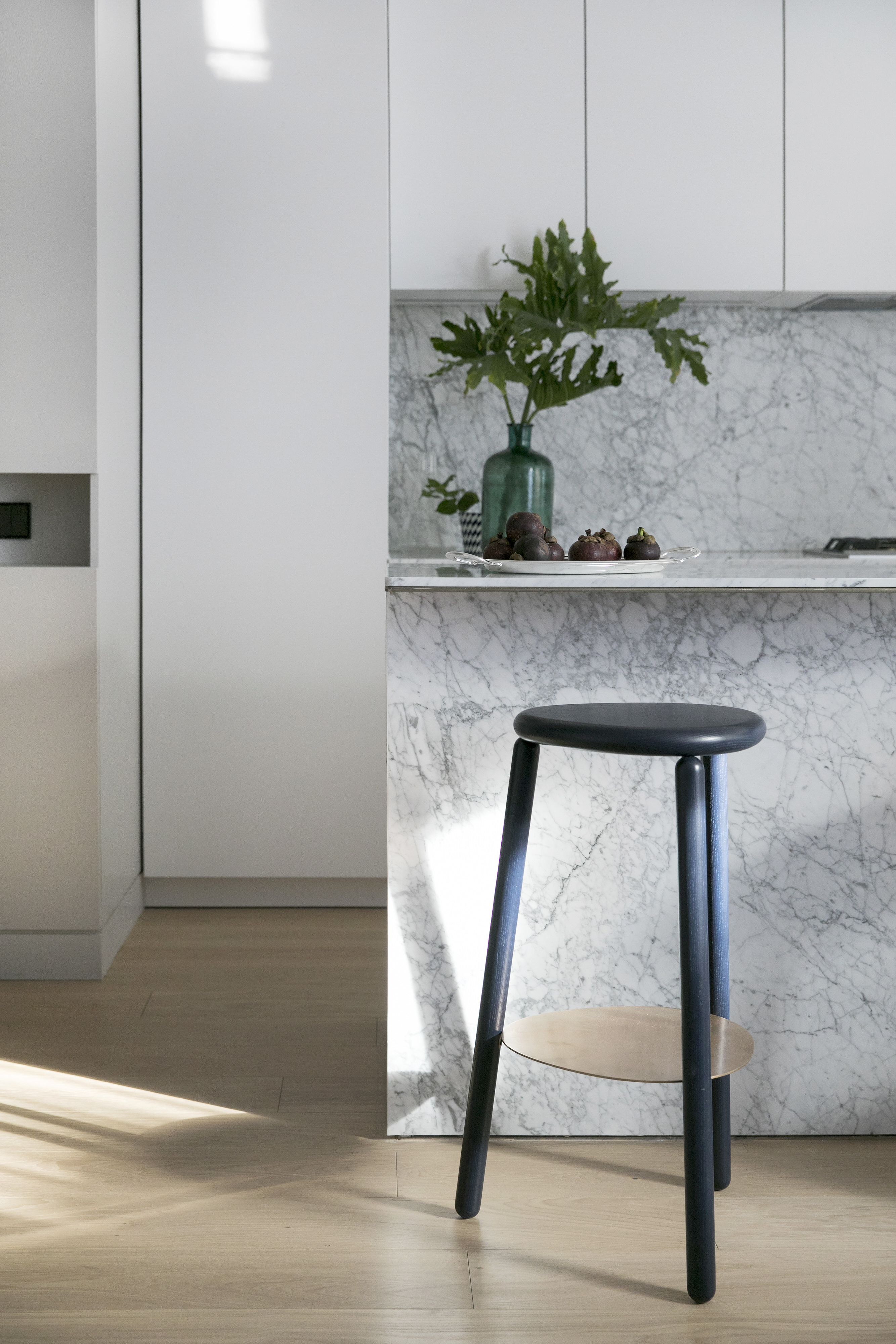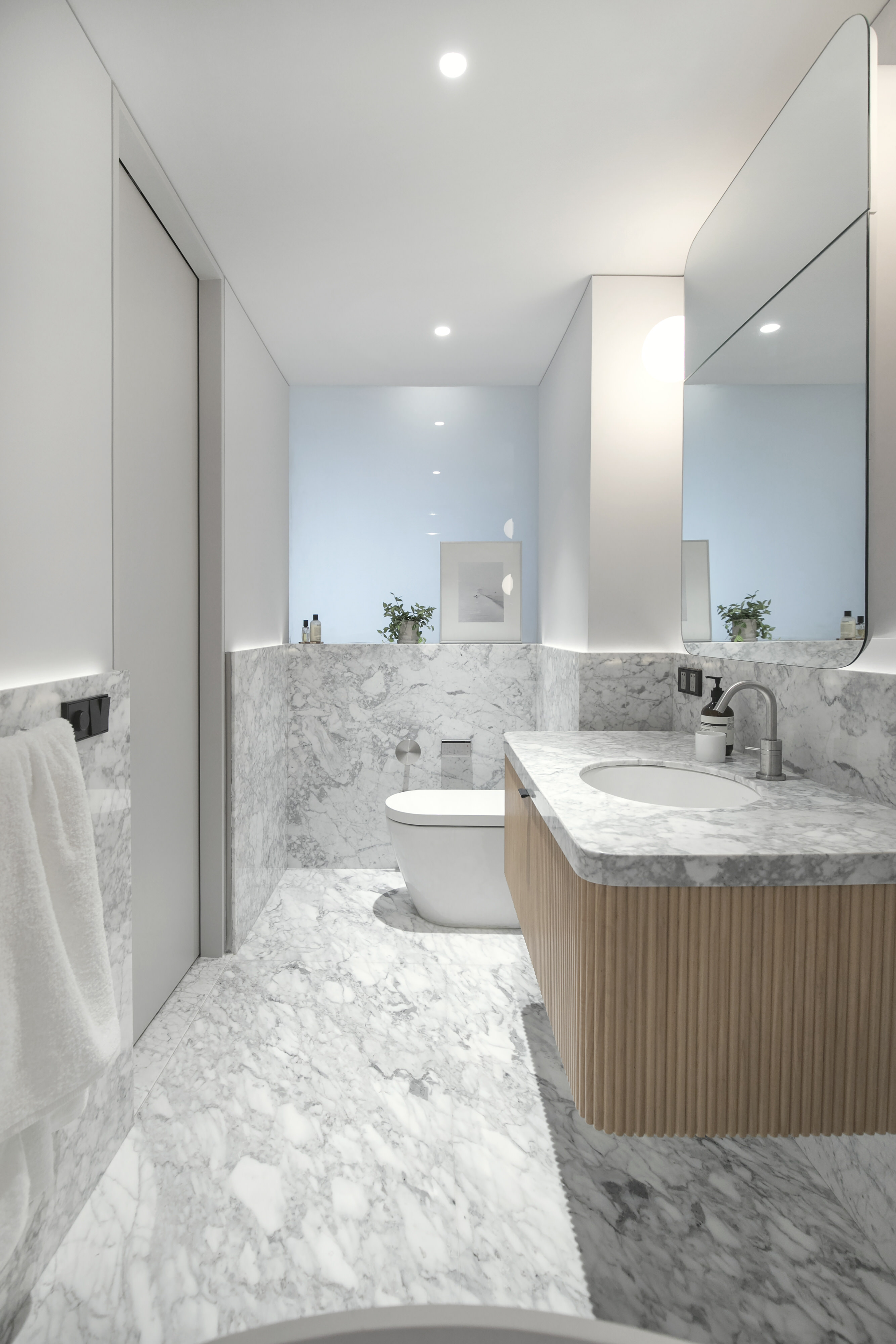 Office AIO 为客厅特别设计了一块黑白根大理石块悬挑在电视屏幕下方,以极简的方式隐藏了电源和数据线盒,同时也为书籍、艺术装饰品、和有张力的绿植提供了安放之地。除了覆盖大部分公寓的白橡木地板外,卡拉拉白大理石板还用于标志着起居区和卧室之间的过渡区域,并自然地流向连接地下室的楼梯。