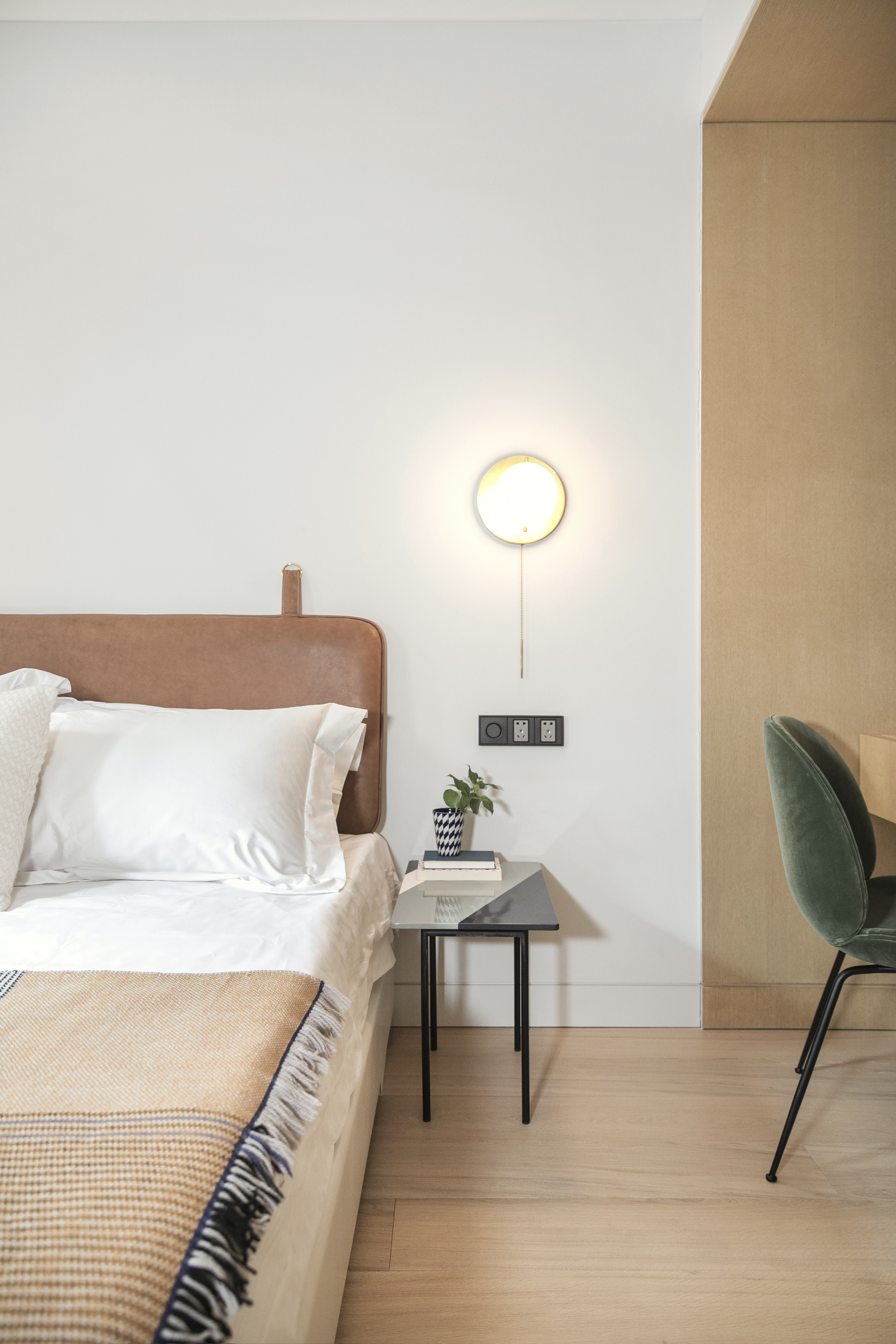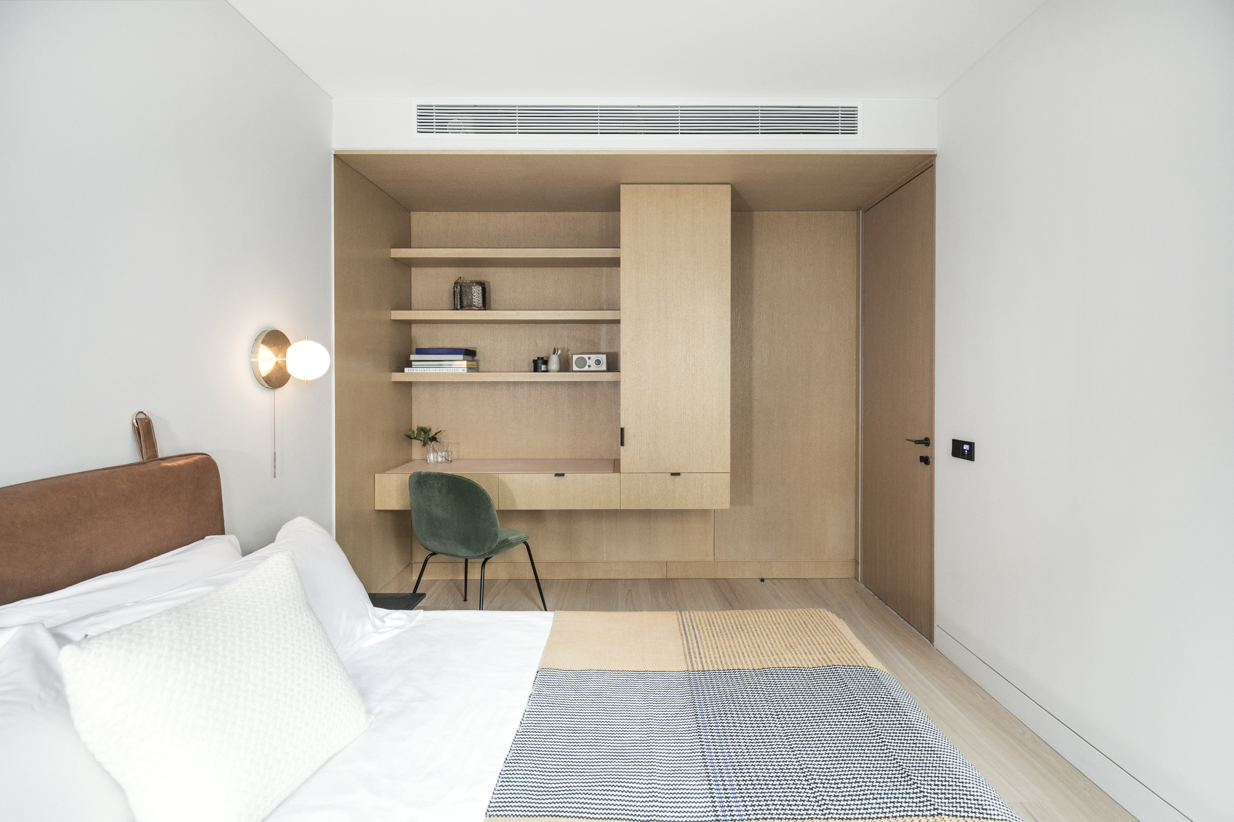 为了最大化各个卧室的天花高度,Office AIO 将空调的位置进行严谨的规整,再通过材料的变化处理高差的变化。在客房里,从一体式定制悬挑衣柜和书桌台的蜜色橡木,转换到柔软温暖的灰色涂料墙面,最后以芥黄色的亚麻窗帘面料点缀、柔化空间。