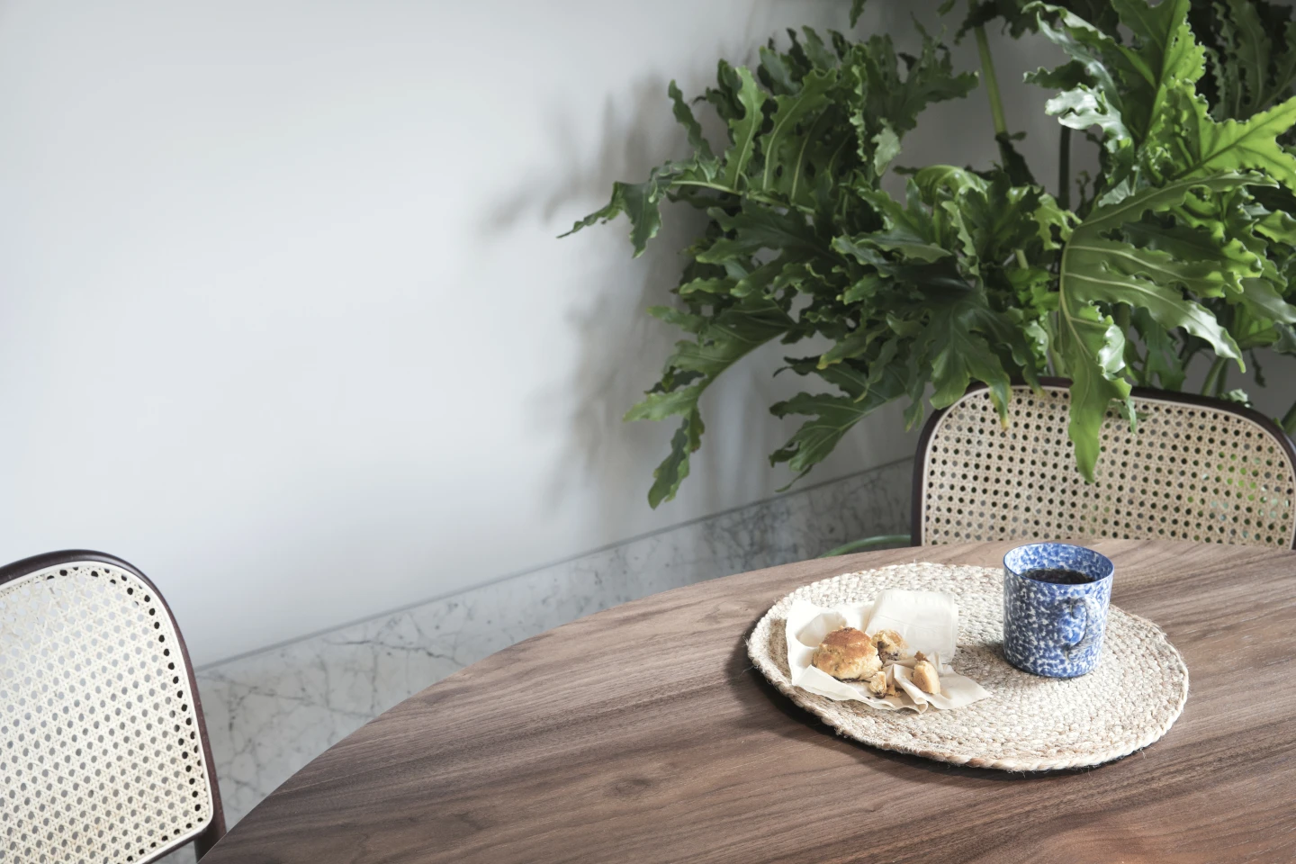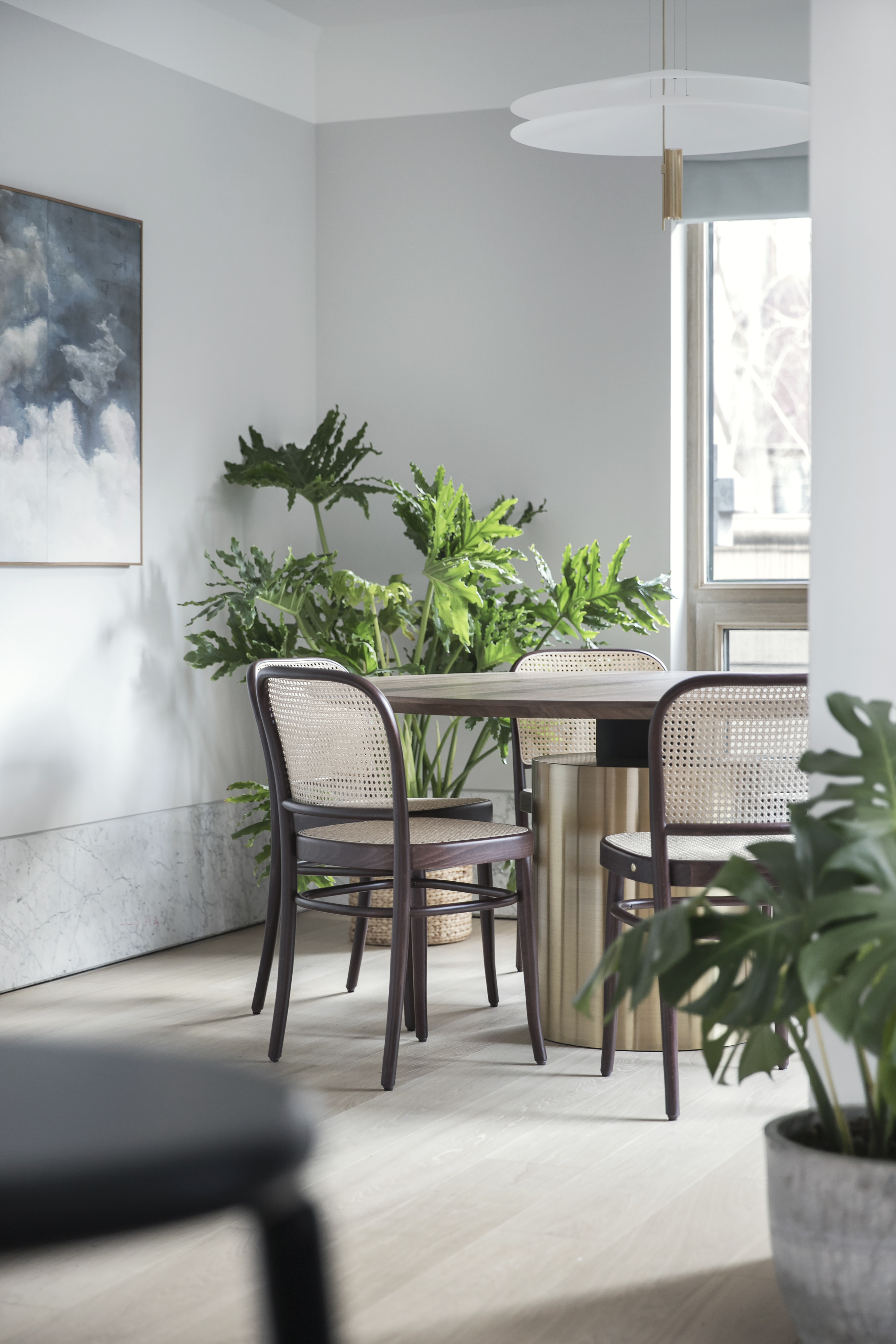 餐厅通过墙面上加高的卡拉拉白大理石踢脚线和线条简洁的斜边石膏装饰线来形成稍显正式的氛围。一盏 Vibia Flamingo 吊灯悬挂在定制的胡桃木餐桌上方,Thonet Hoffmann 椅的经典线条完成了整个空间的氛围。编织的藤坐面与玄关的屏风形成了轻松的对话。