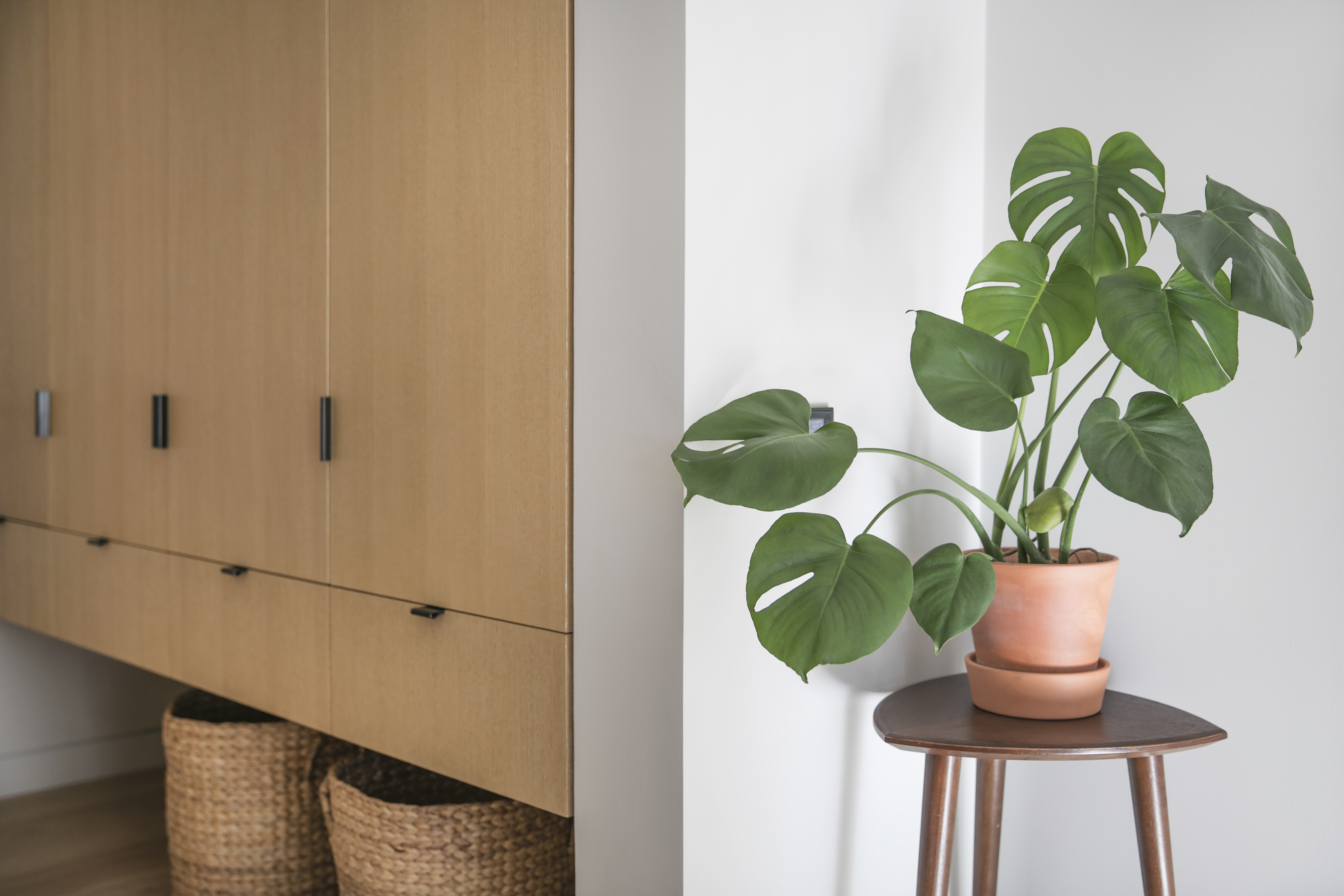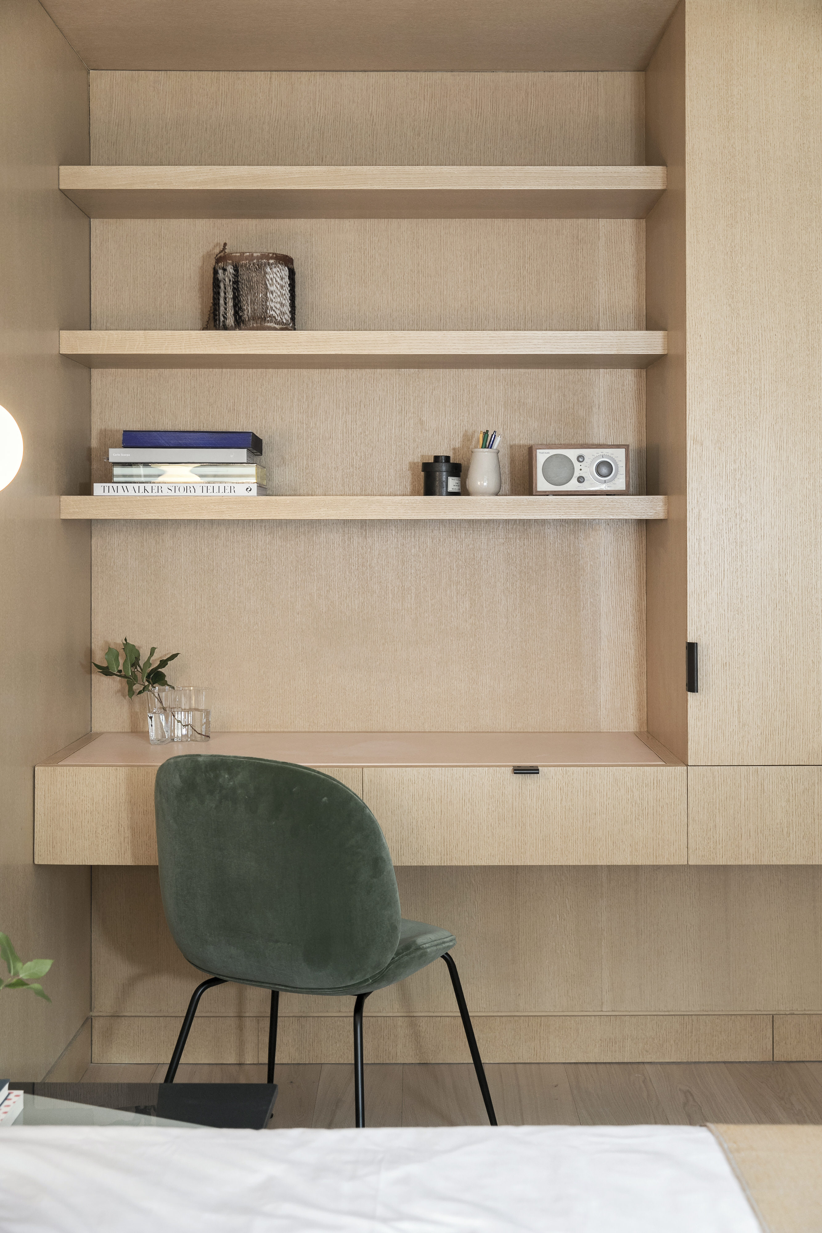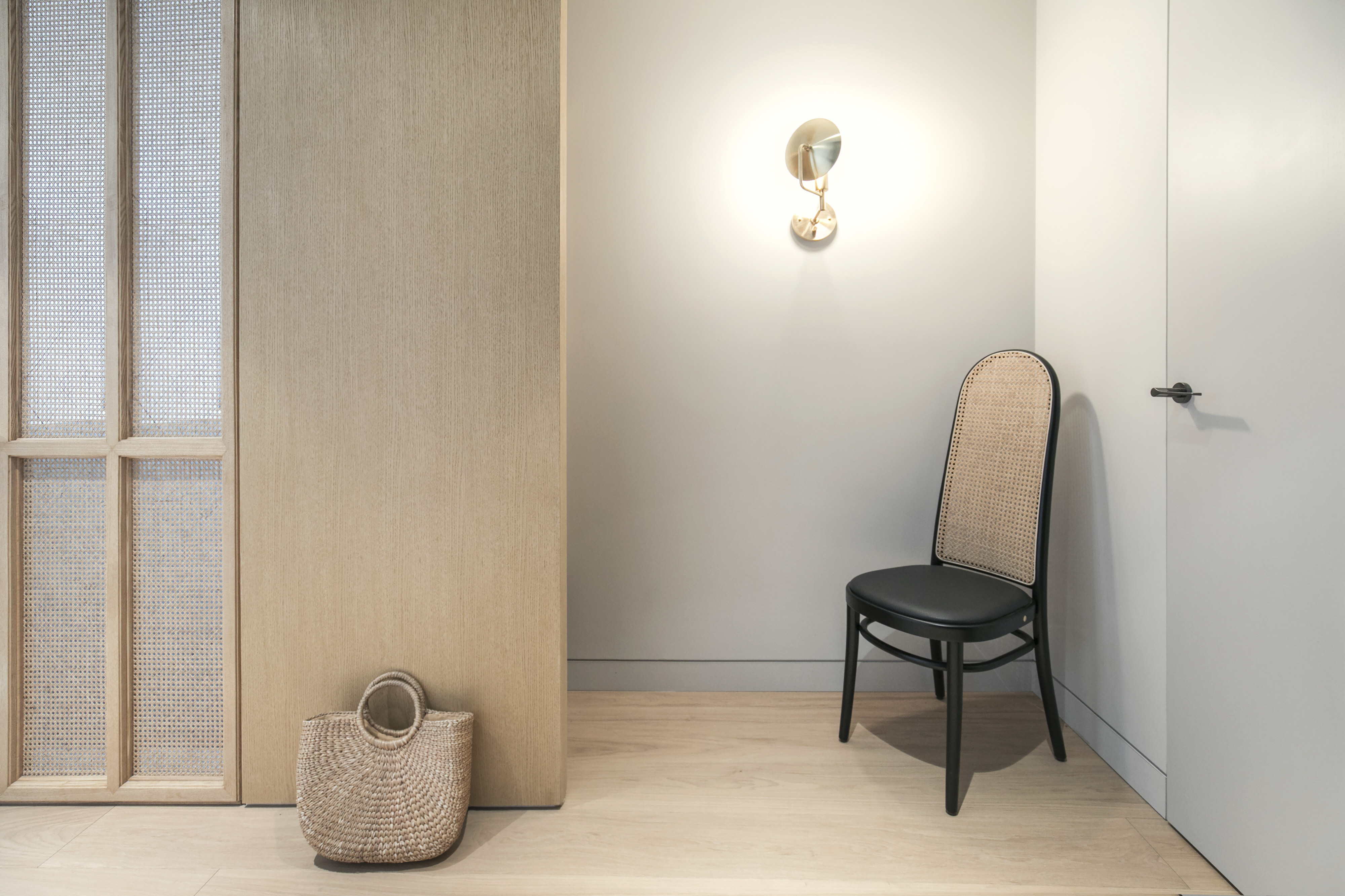 可旋转的 Workstead 黄铜壁灯和造型圆润的 Thonet Morris 换鞋椅迎接进门的家人。Office AIO 在玄关空间插入了一片蜜糖色的橡木隔板,并利用其背后的内凹空间, 悄悄地嵌入了一组悬挑的置物架,方便随手取放日常小物。橡木饰面墙的末端,连接着一片藤编屏风,将人们的视线引向公寓的核心生活区域。这片屏风不仅能够让客厅的光线照射到原本黑暗的玄关,还能为来访的客人和经常出现在门口的送货员提供足够的等候空间