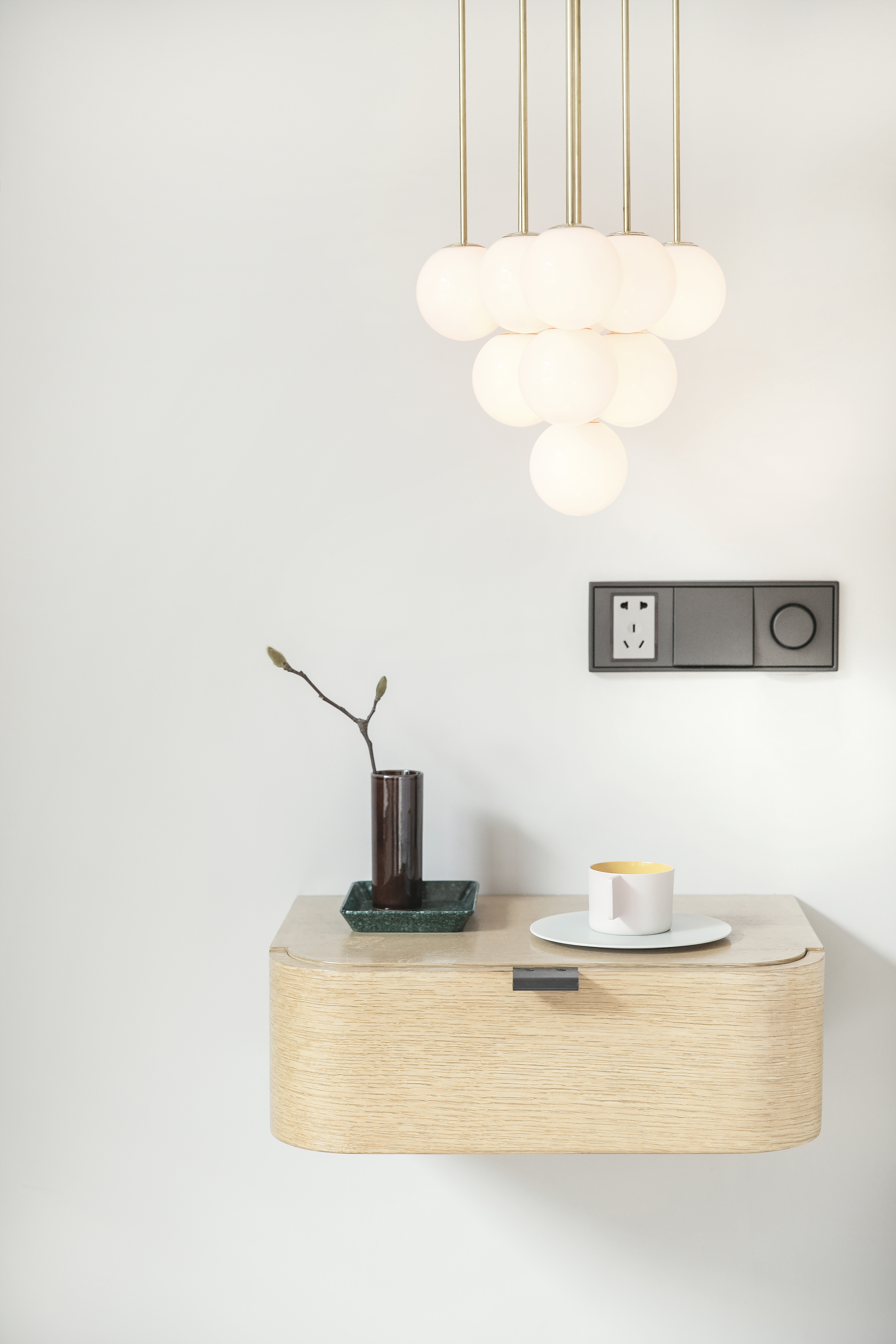 在一对精致的 Michael Anastassiades 吊灯下,对应着两个定制的悬挑床头抽屉,与卧室里的悬挑衣柜呼应,都搭配了 Tom Kundig 的纯手铸的黑钢拉手。
