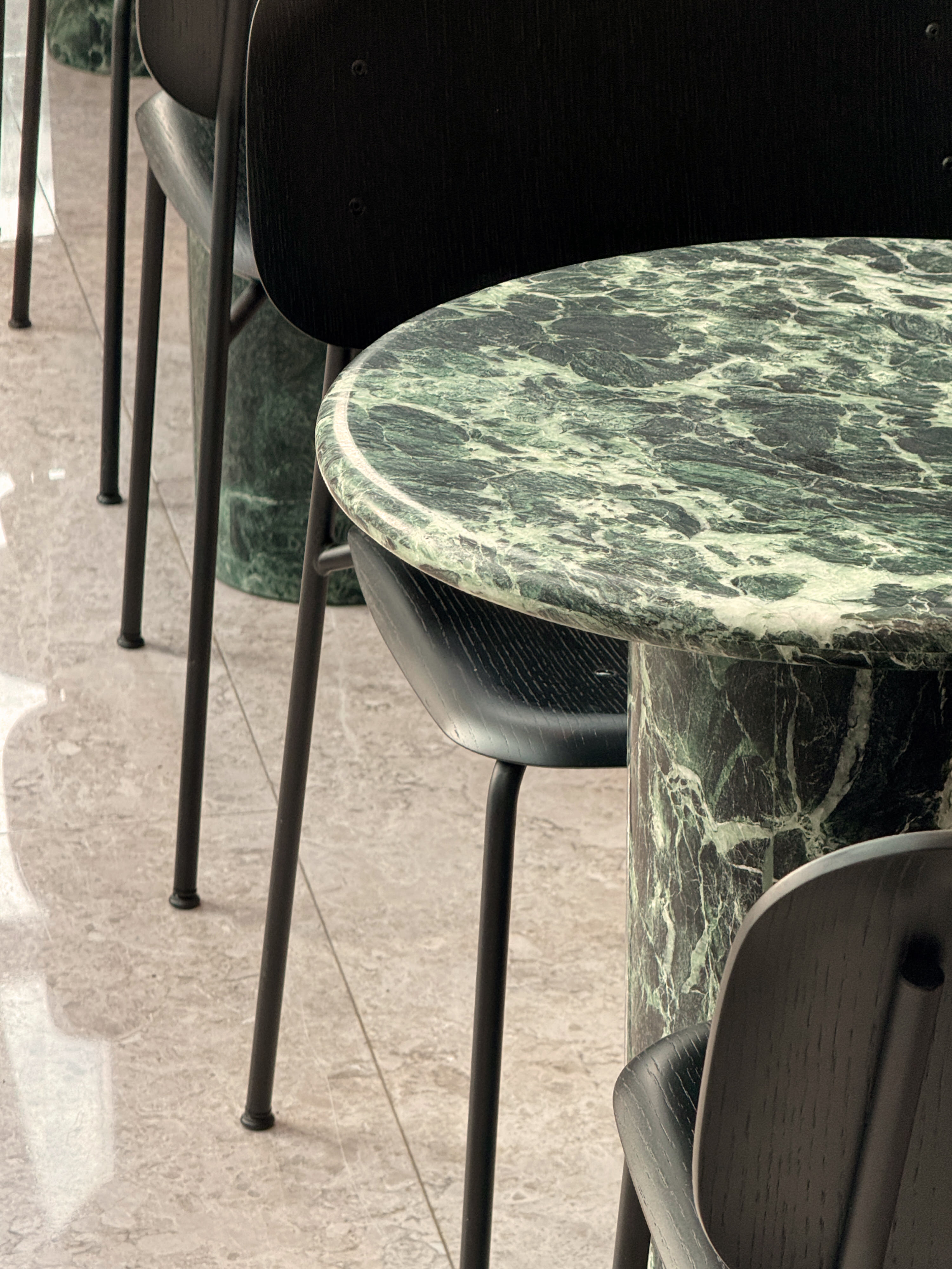 座位安排提供了多样化的选择,包括HAY品牌的座椅和由Office AIO为此项目定制的桌椅,可容纳不同形式的聚集。通过纹理丰富的绿色大理石(Persian Green Marble)和深绿色木饰面与吧台区的材料组合产生互动,尽管地板的材料不容许更改,也达到了统一品牌空间感的目的。