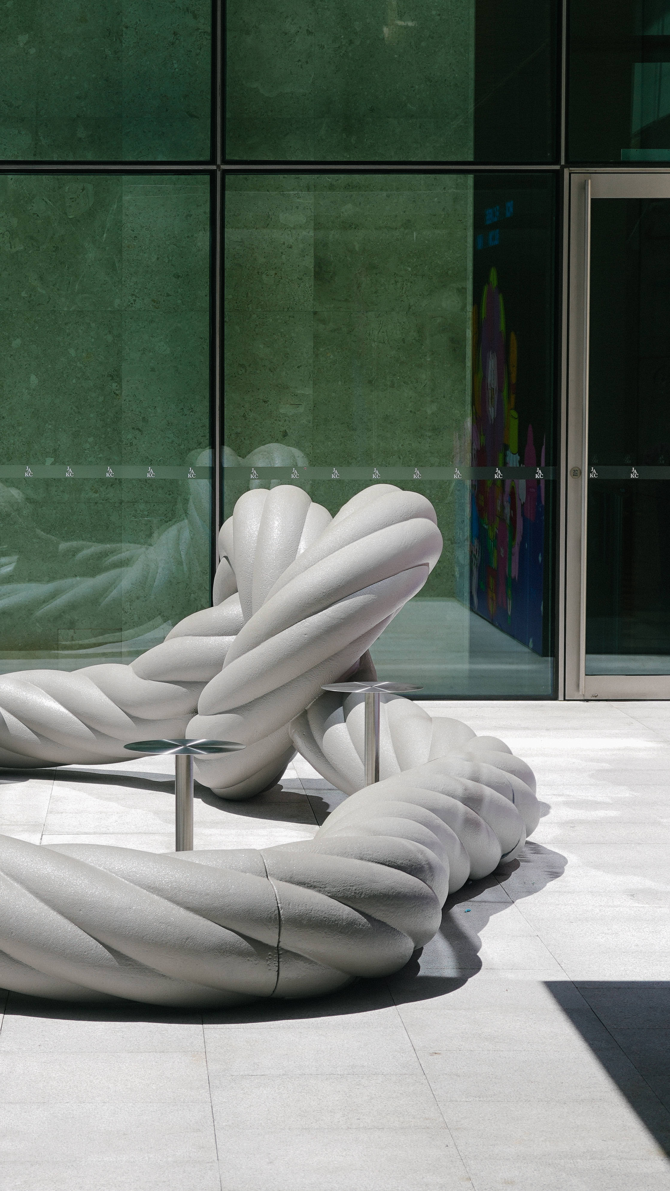 一个特别有创意的动作是商场入口处的超大尺寸结绳装置,兼作室外座位,以俏皮的方式回应Nodi的品牌含义。由Office AIO精心打造,使用真实的绳子捕捉结的自然形态,然后按照符合人体工学的尺寸进行放大调整。携手比利时品牌Sixinch - 以其独特弹力涂层技术的泡绵产品而知名 - 打造这一套室外座椅。这个结绳装置不仅在视觉上引人注目,而且耐用兼多功能,完美封装了Nodi的根源和其促进交流的承诺。