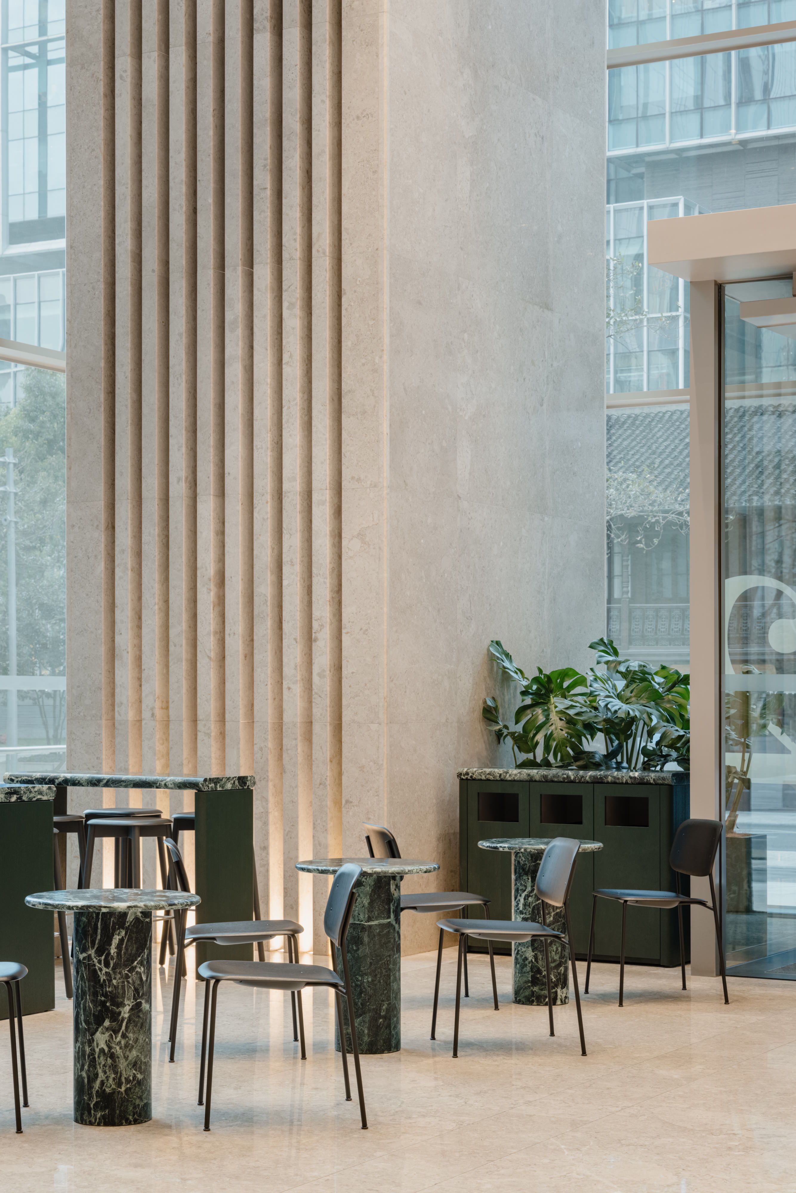 Nodi店铺占据嘉里中心办公楼12米高的大堂一角,并精心划分出三个区域:咖啡吧台、室内座位区和一个向南的室外庭院,这个户外座位区远离了繁忙的街道,也带领人们通往嘉里中心的商场入口。