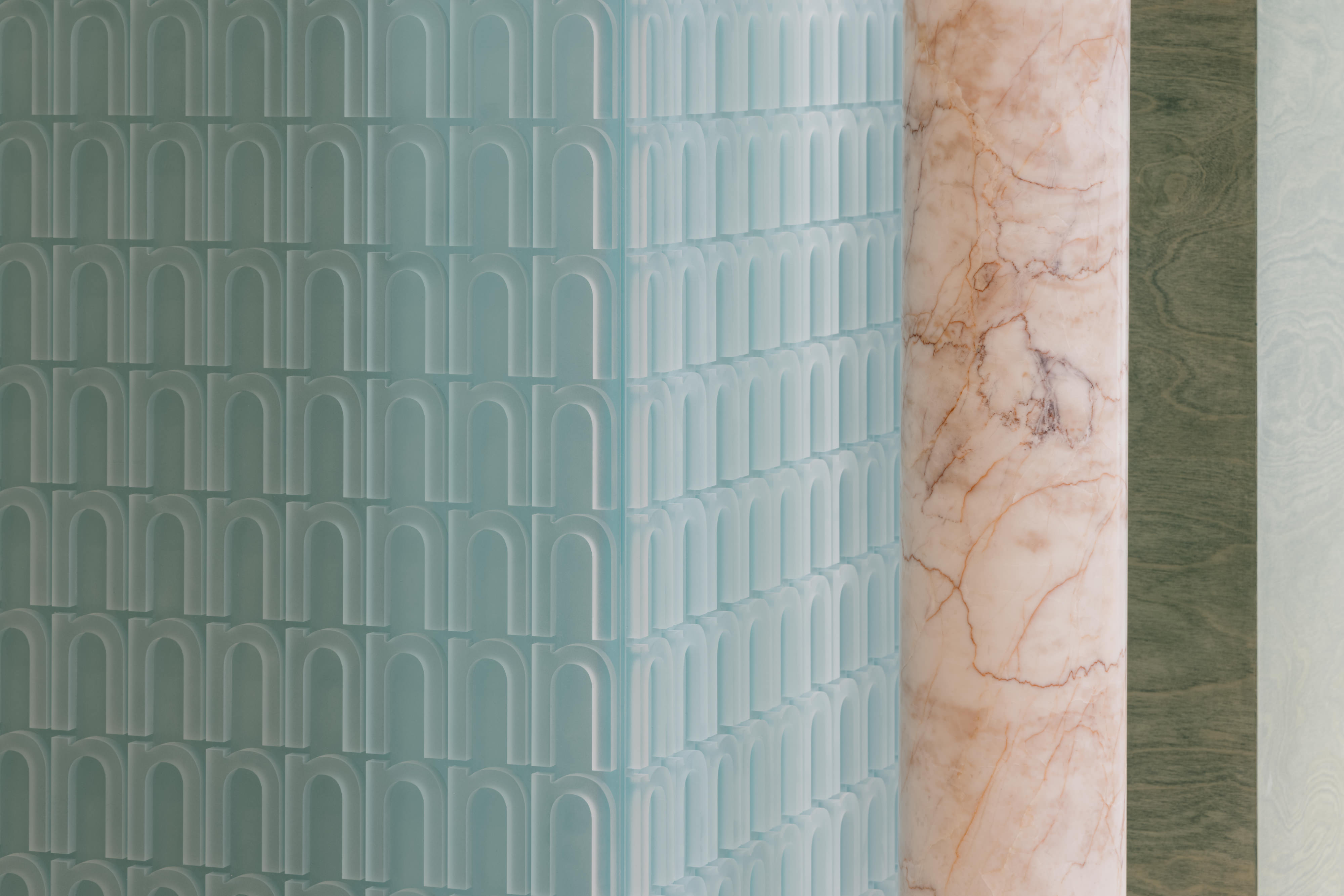 考虑到大堂咖啡吧日常的接待量,前吧台采用了经典的L形配置,同时期望为它注入独特的风格和体验:吧台内的每个功能都以独立的模块表现,每个模块有着自己的形状与细节,丰富了传统的单一造型吧台,展现出活力和趣味,强化了品牌的俏皮而精致的理念。
