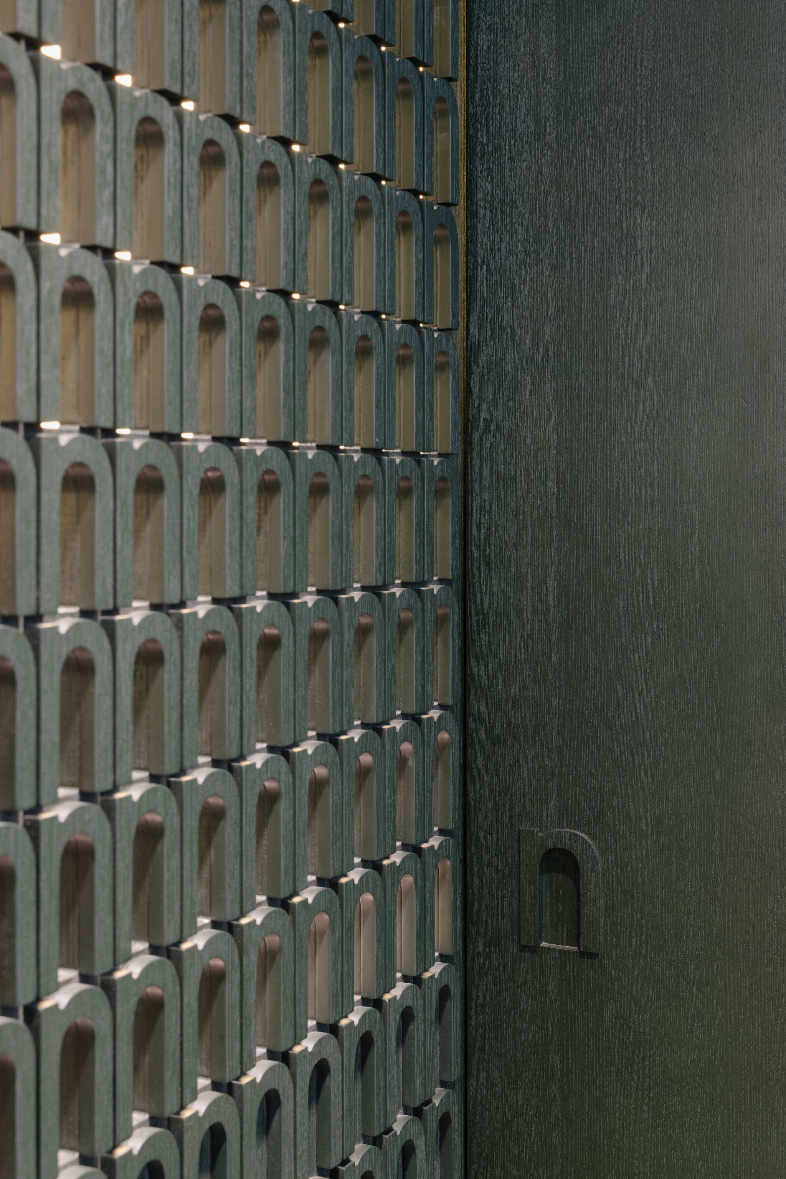 咖啡吧台被进一步划分为前场和后勤两个区块,旨在确保咖啡制作区域优雅且整洁的同时,实现专业的高效运作。在这两个部分之间,团队从传统中国屏风中汲取灵感,创造了一种既提供隐私又保持透明度的隔断。这个格子状的木制隔断乍看平凡,但近看可以发现由品牌字母“n”所构成的图案,增添了丰富性和微妙性。并在后勤区的背墙,安装了与屏风协作的灯箱元素,暖色调的灯光为咖啡师提供了柔和的照明,也映出了咖啡师忙碌的剪影。