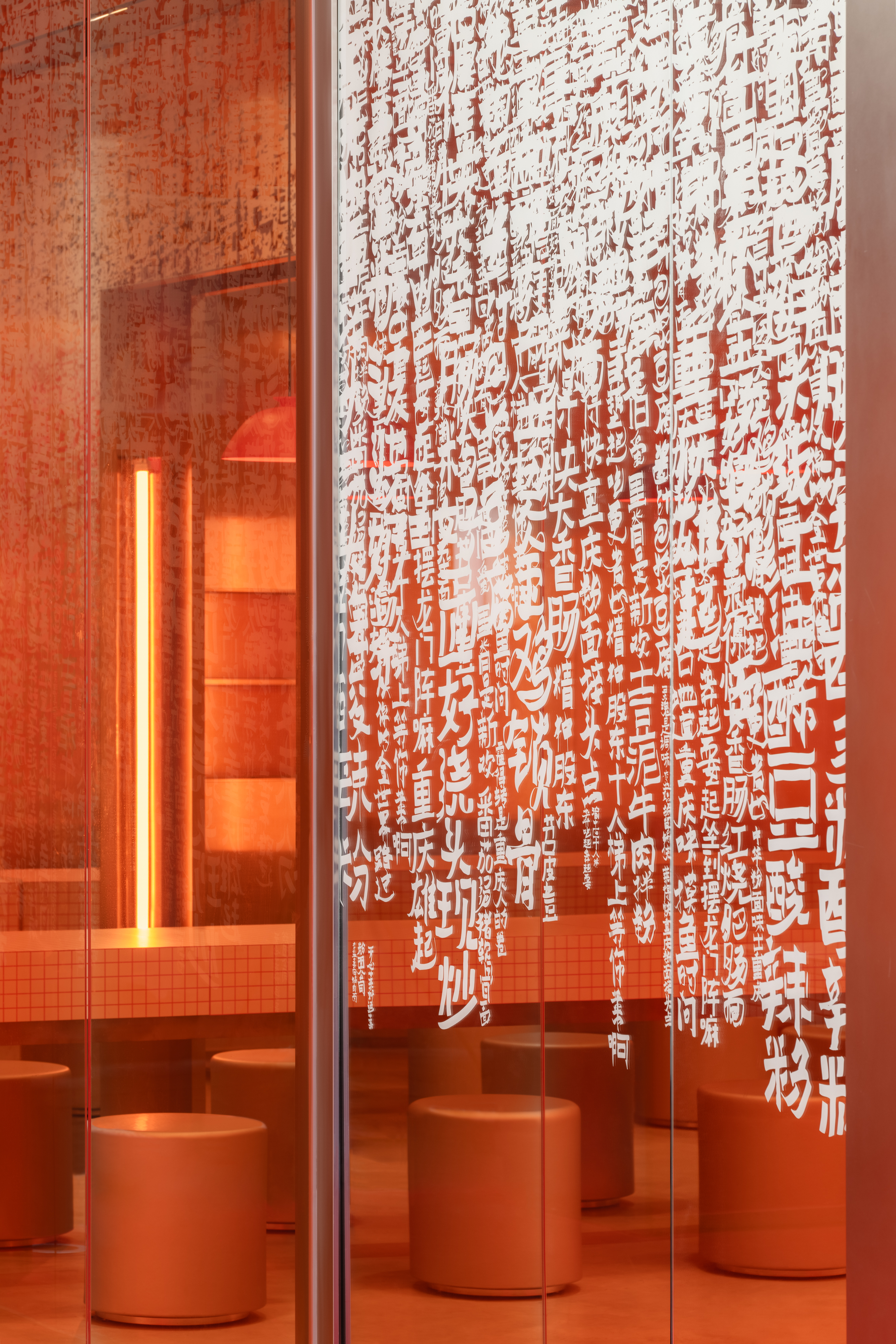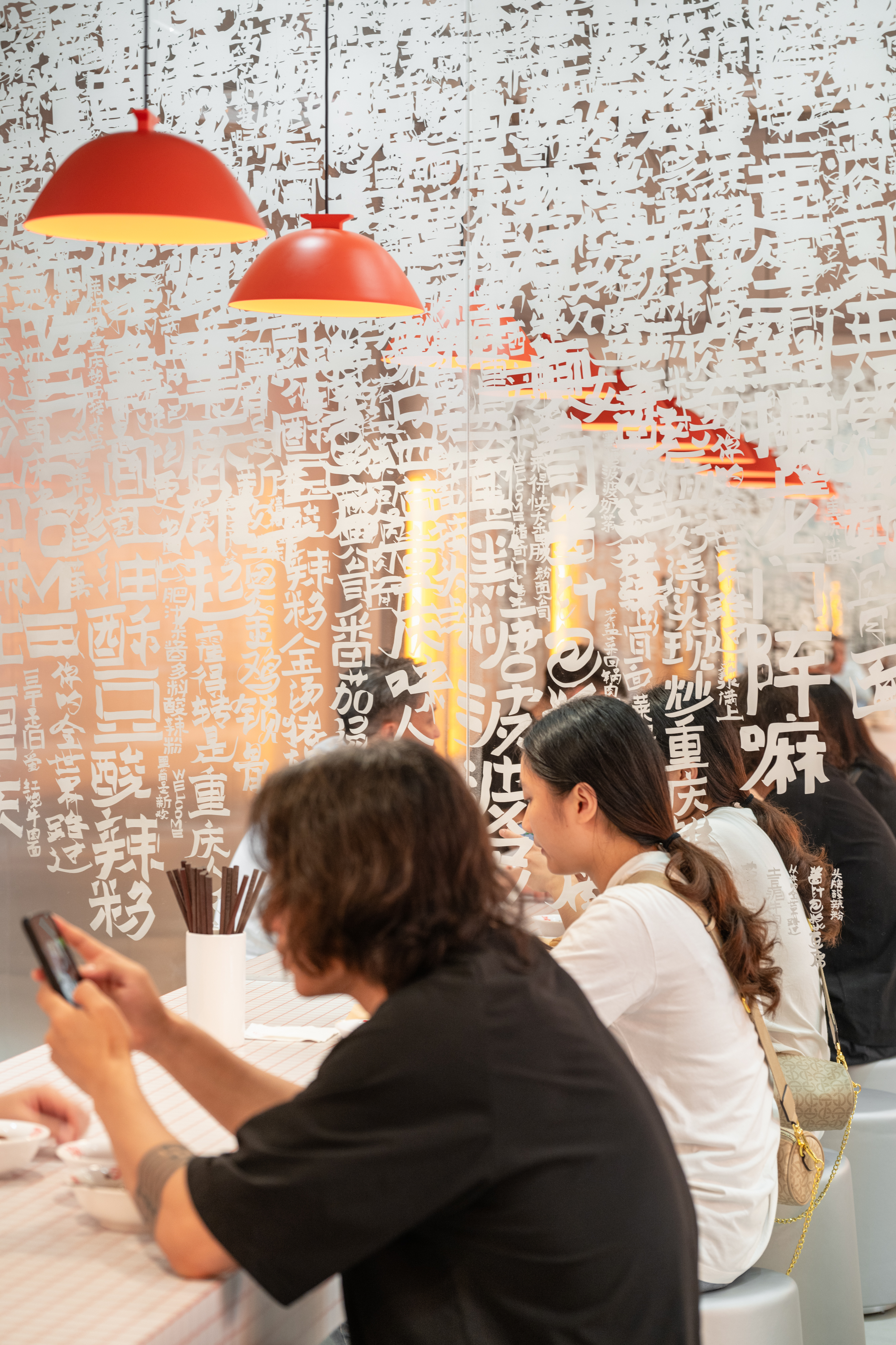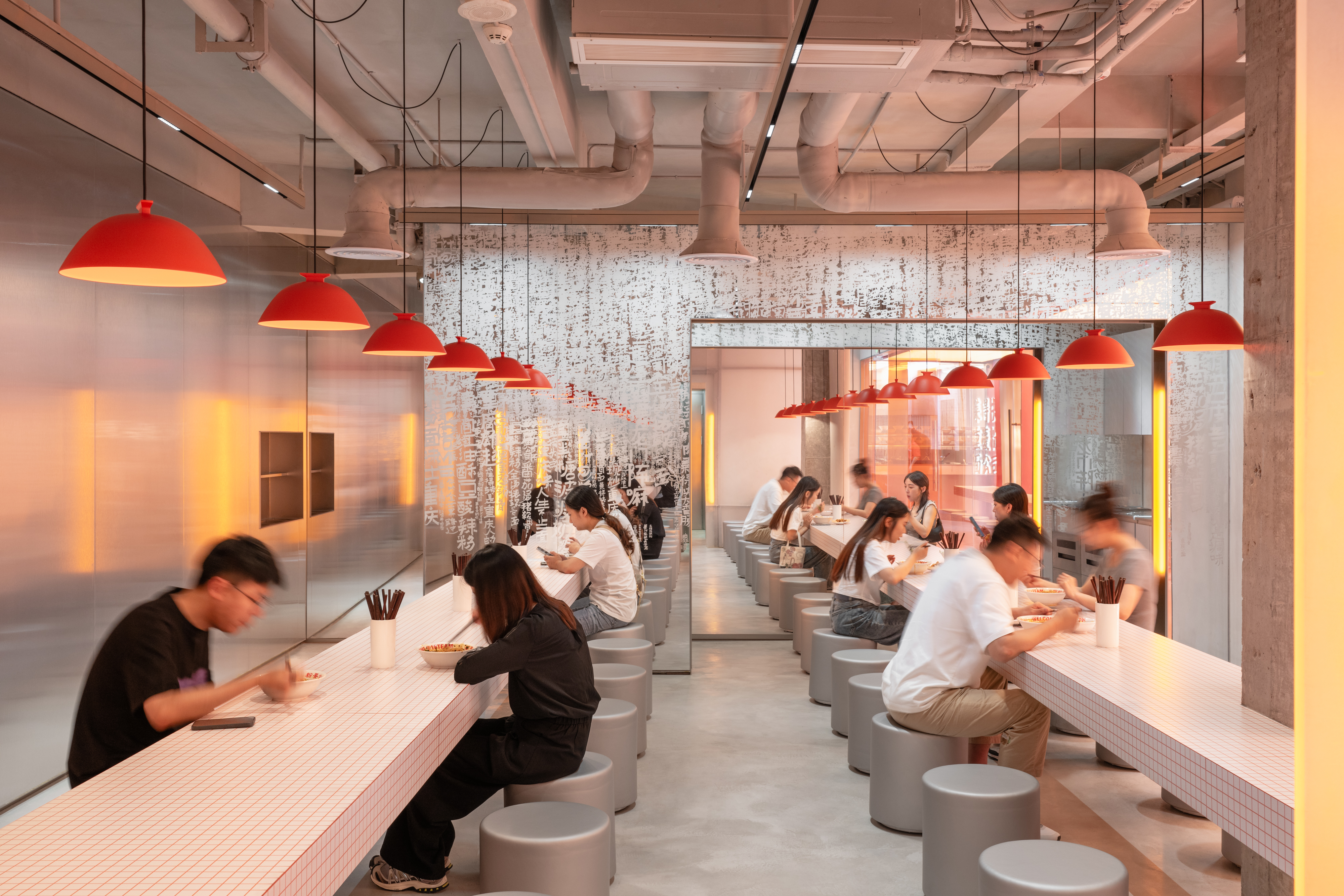 以重庆在90年代快速城市化过程中形成的“万能”精神和品质为灵感,餐厅内竖立了几面通高墙和两个抽象的长形公共餐桌。这些精心定位的墙体各有一个开口,形成餐桌延伸的通道,并通过镜面进一步夸大其线性效果。正如以超现实“桥穿高楼”场景闻名的李子坝轻轨站,这种夸张却又朴实的体验正是重庆独特之处。