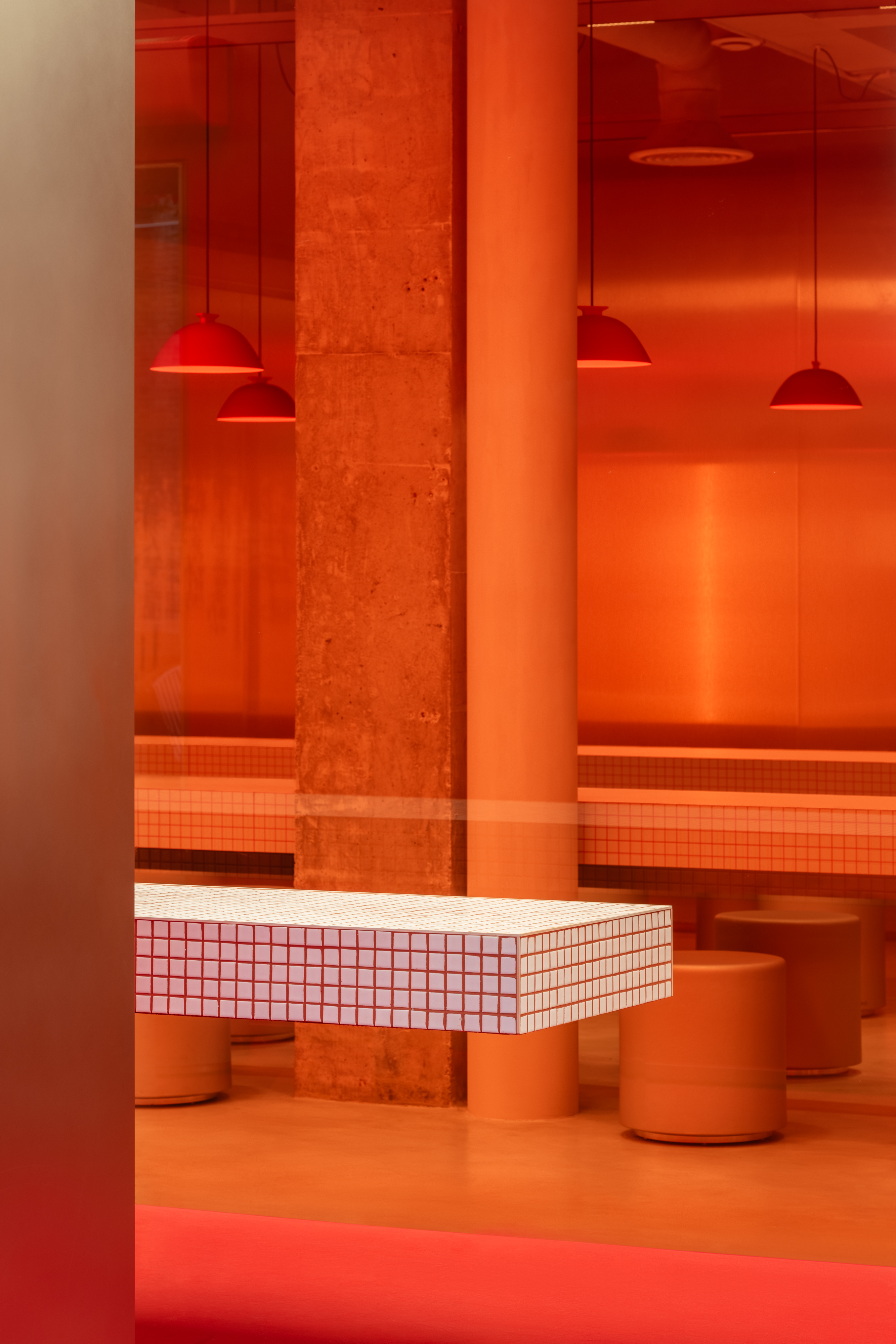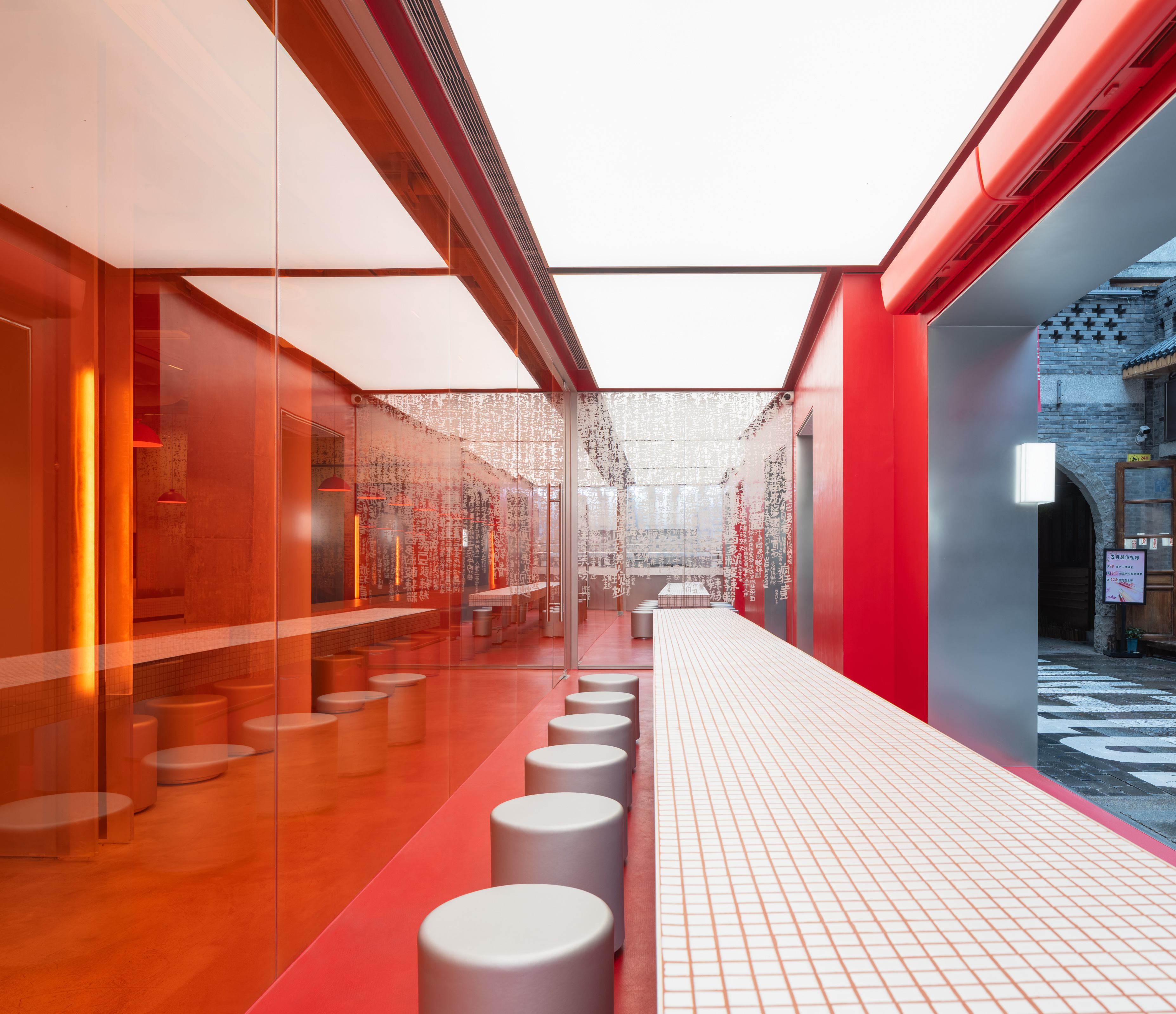由于必须保留外立面的造型,设计师将"立面"的概念推向建筑内部,通过后置“外立面”的设计,创造出一个半公共区域,并将其重新描绘成品牌标志性的暖红色。这个区域可用于小憩、外卖取餐或户外遮蔽式就餐。通过原有的分割式穿墙窗,这个缓冲区在砖立面上营造出独特的空间体量感。