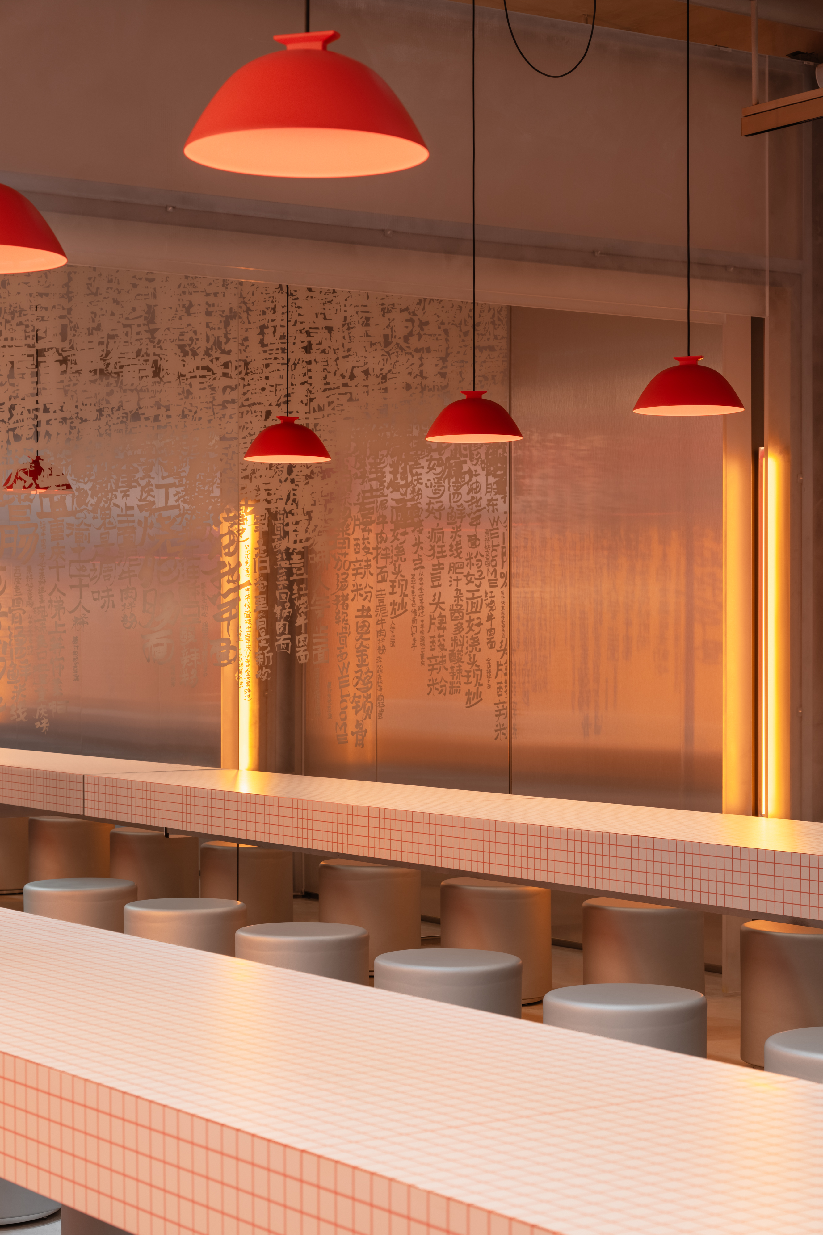 这些戏剧性的桌子长度分别为9米和12米,轻盈地悬浮在餐厅内。定制的白色方格加红色轮廓的富美佳层压板覆盖了这些穿过空间的台面。选用了Wastberg 'Sempe'吊灯,其造型类似中国各地常见的"大排档"风格红色吊灯,精心布置并悬挂在长桌上方,营造出典雅细腻的氛围。