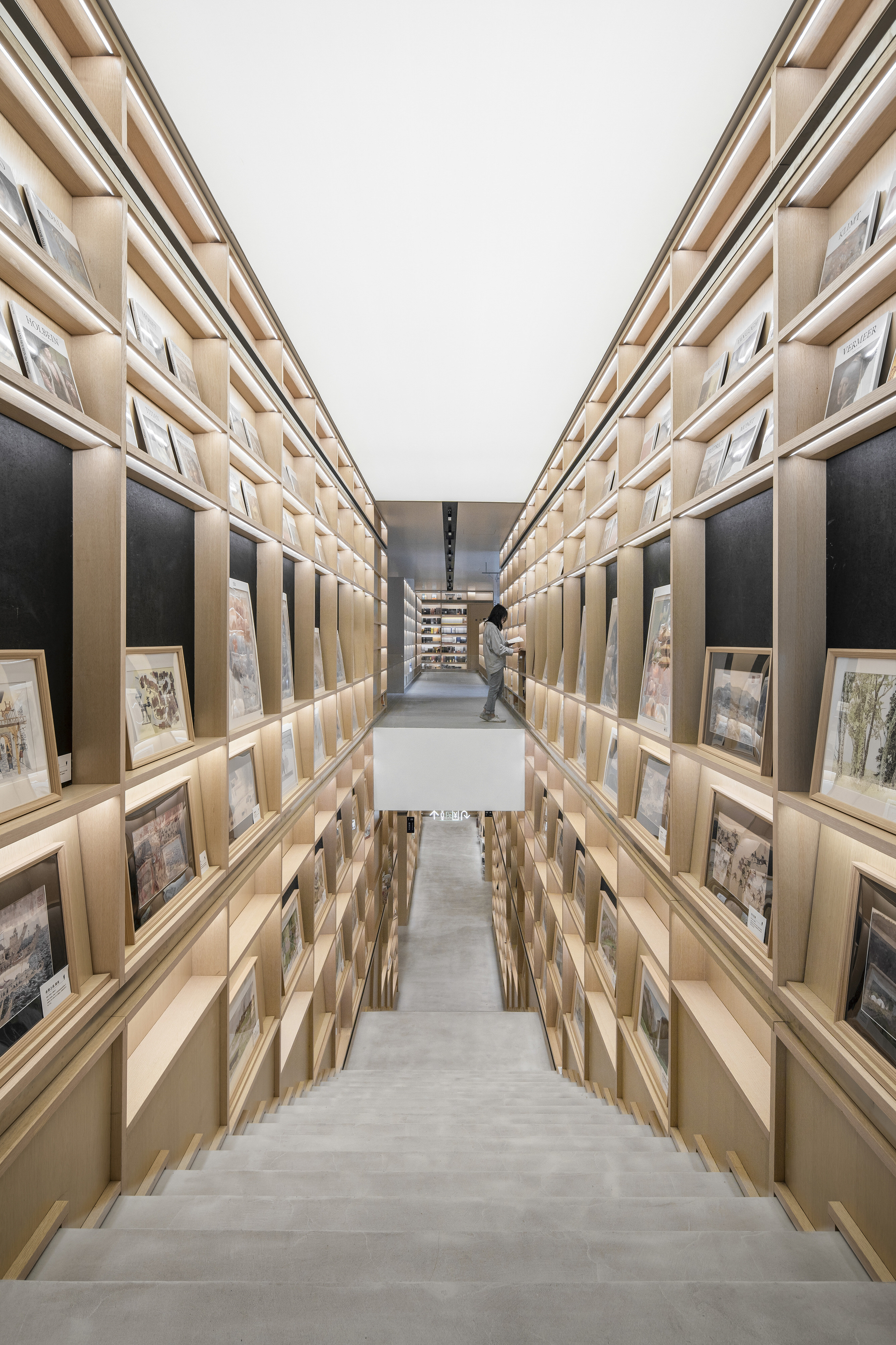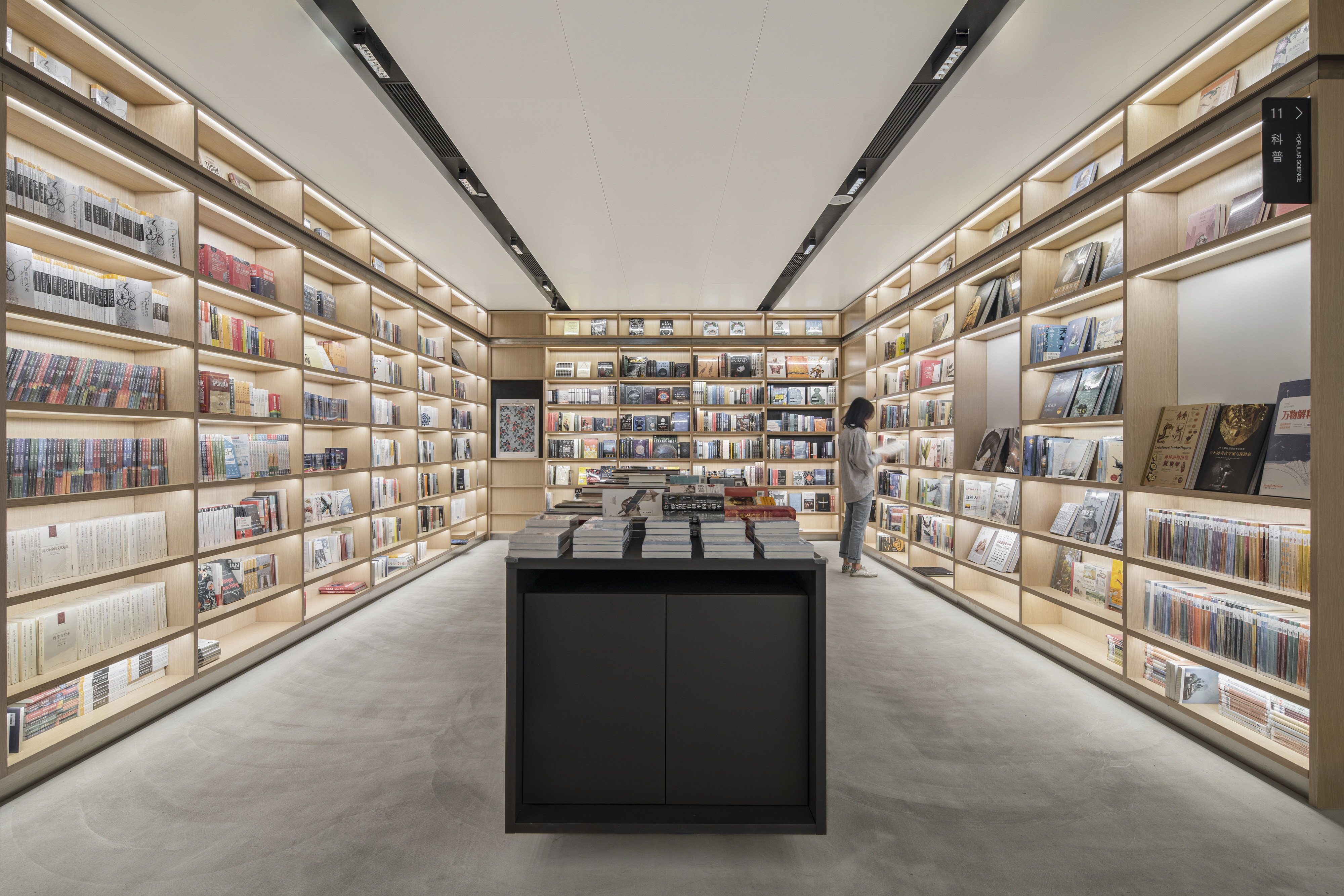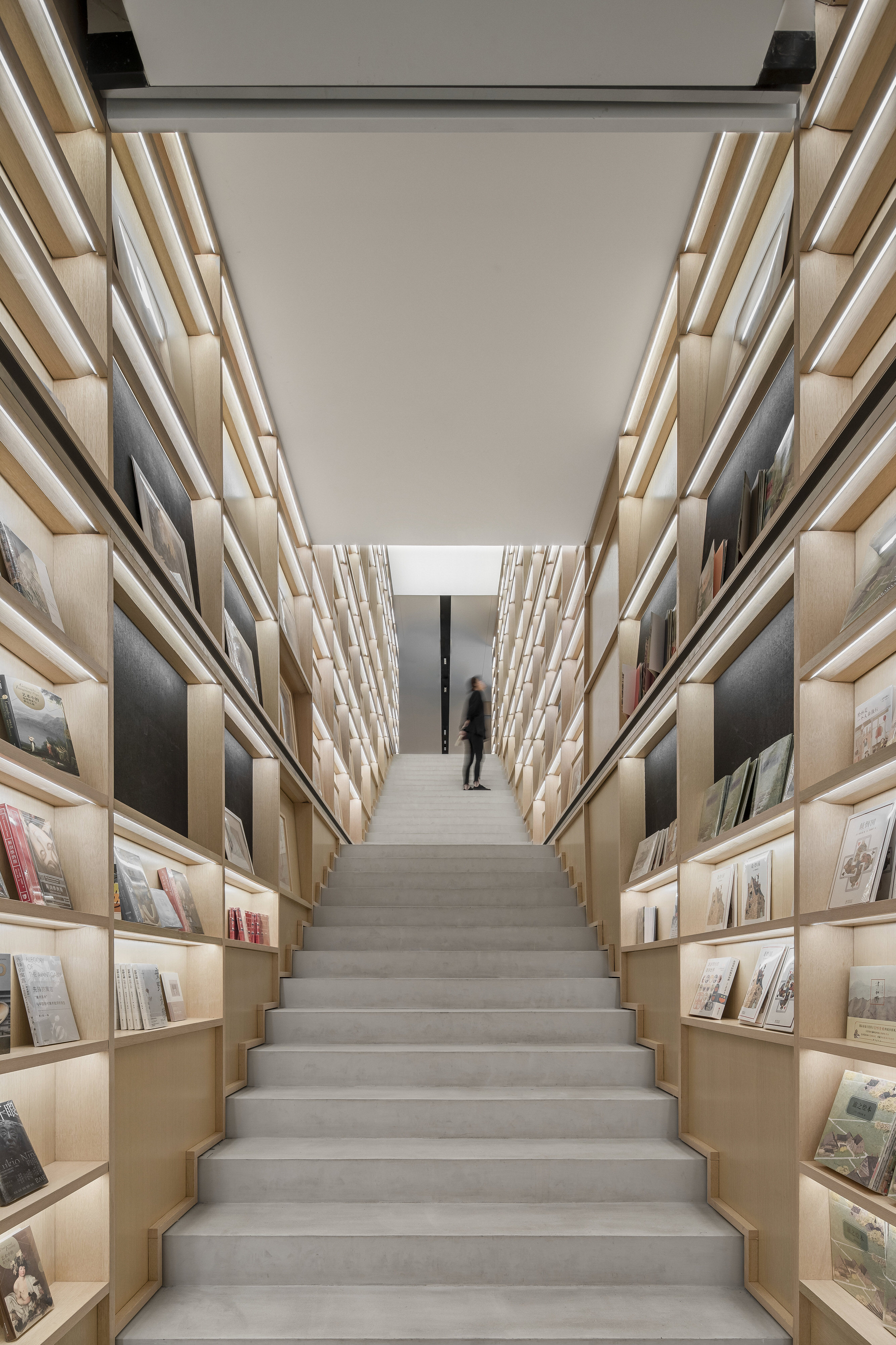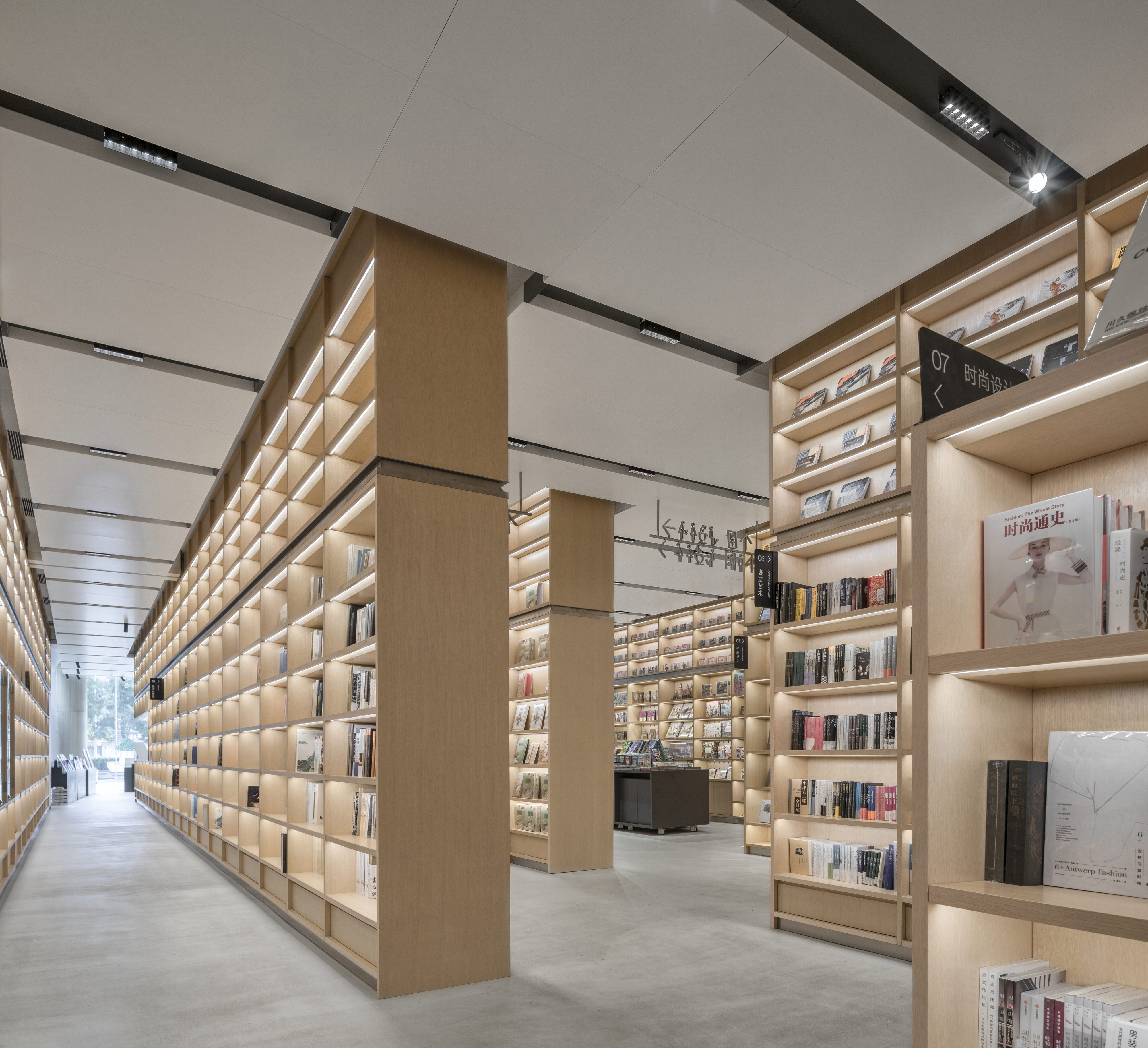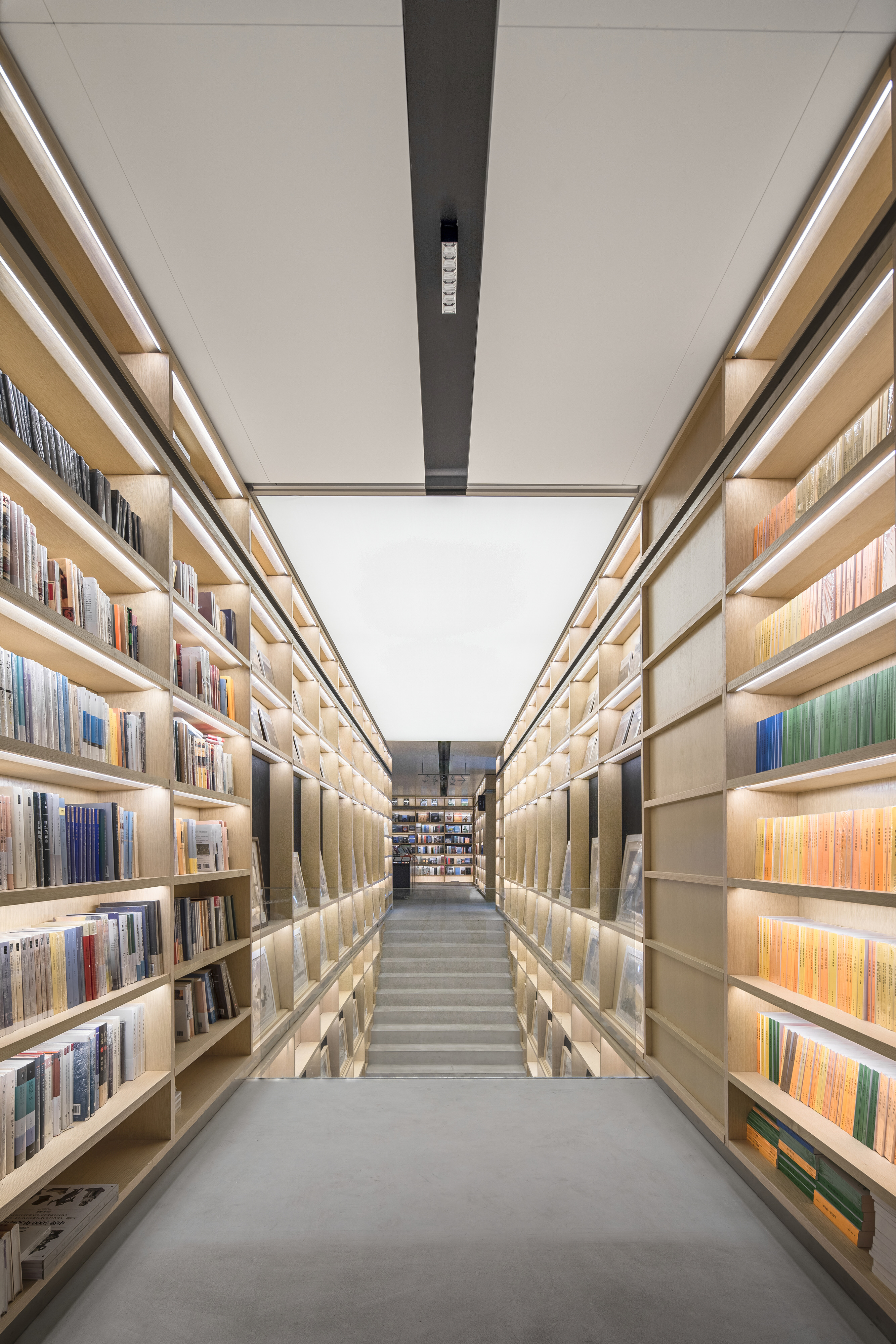 设计师令方案的室内布局与周围的环境产生了对话, 一行行的书架承载着不间断的书流,平行铺设,刻意避免了斜向交叉的流线,在书店浏览的过程就像一列火车穿梭在风景瞬息万变的陆地上,视线和思想同时被吸引进了接连不断书卷中,为在书籍迷宫中徘徊的人提供了更加清晰的思路。