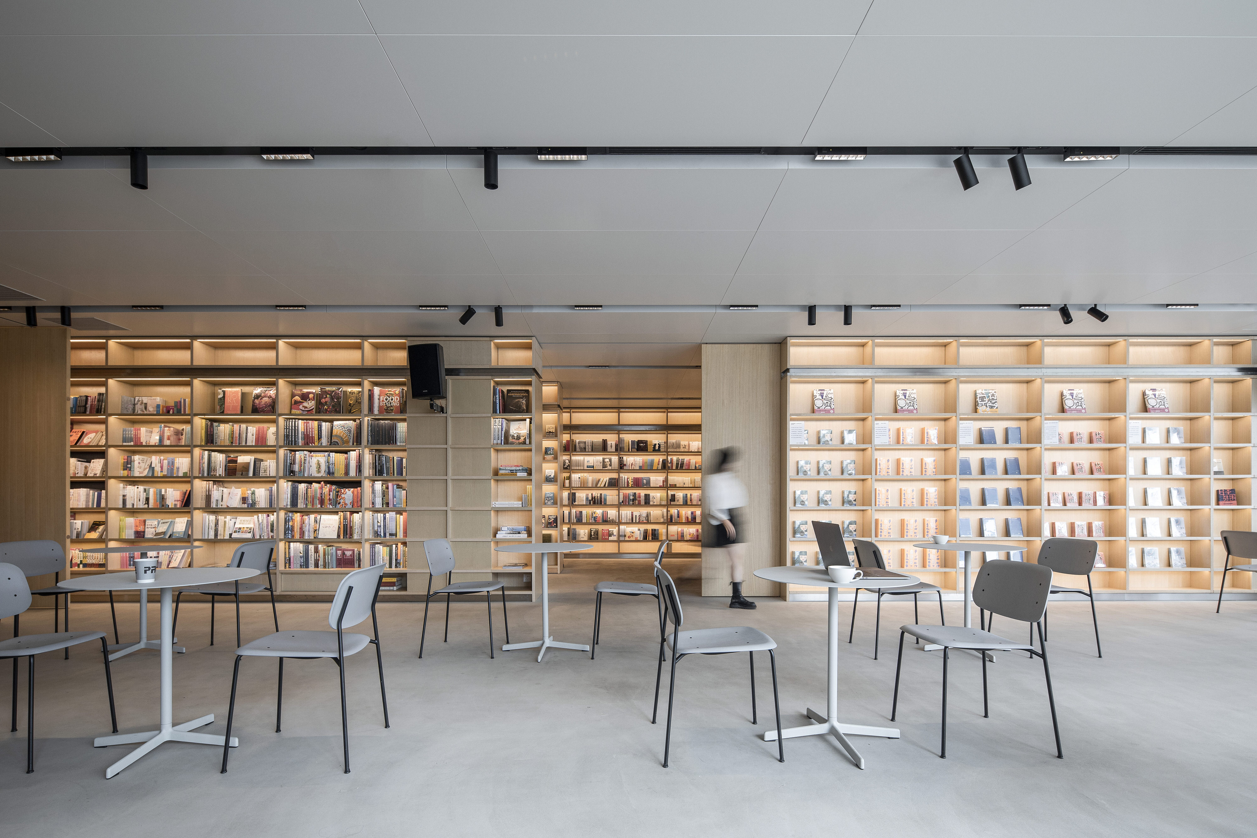 区别于南侧相对封闭的立面造型,临近主路的北侧作为书店主入口,书店里举办公共和社交活动的空间也相应的设置在了北侧的上下两层位置,更好地串联室内外的视觉互动。一层的咖啡吧台、收银台、和展台,均与通高书架形成线性对齐关系,布局简洁规整。入口一侧通透玻璃幕墙内的角落设置了活动阅读座位;对应的二层位置,则设置了带有灵活隔断的灵活空间,为书店各类的分享活动预备,利用室内空间与远处城市景观的连接,将客人汇聚其中。