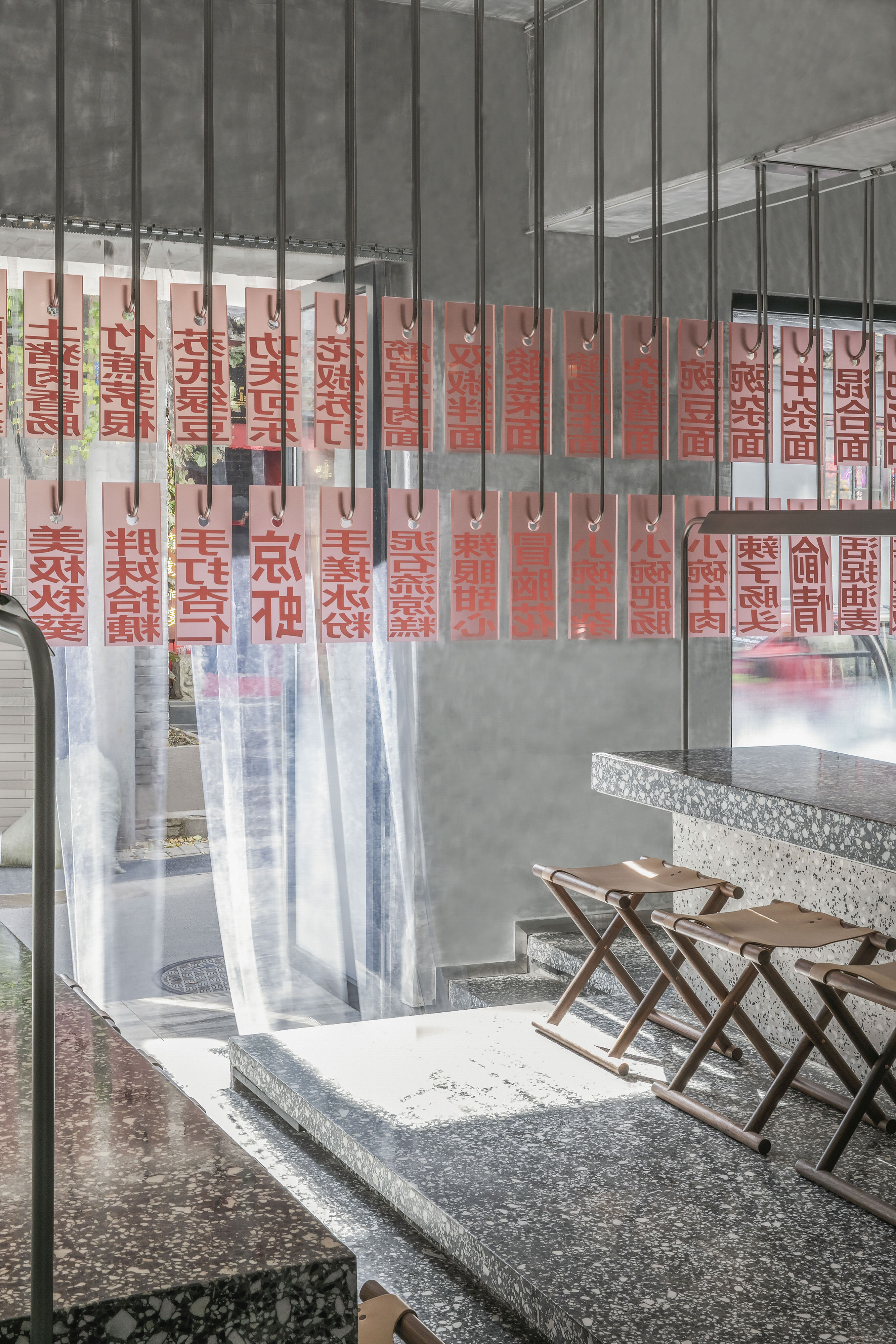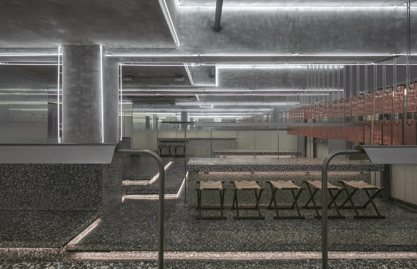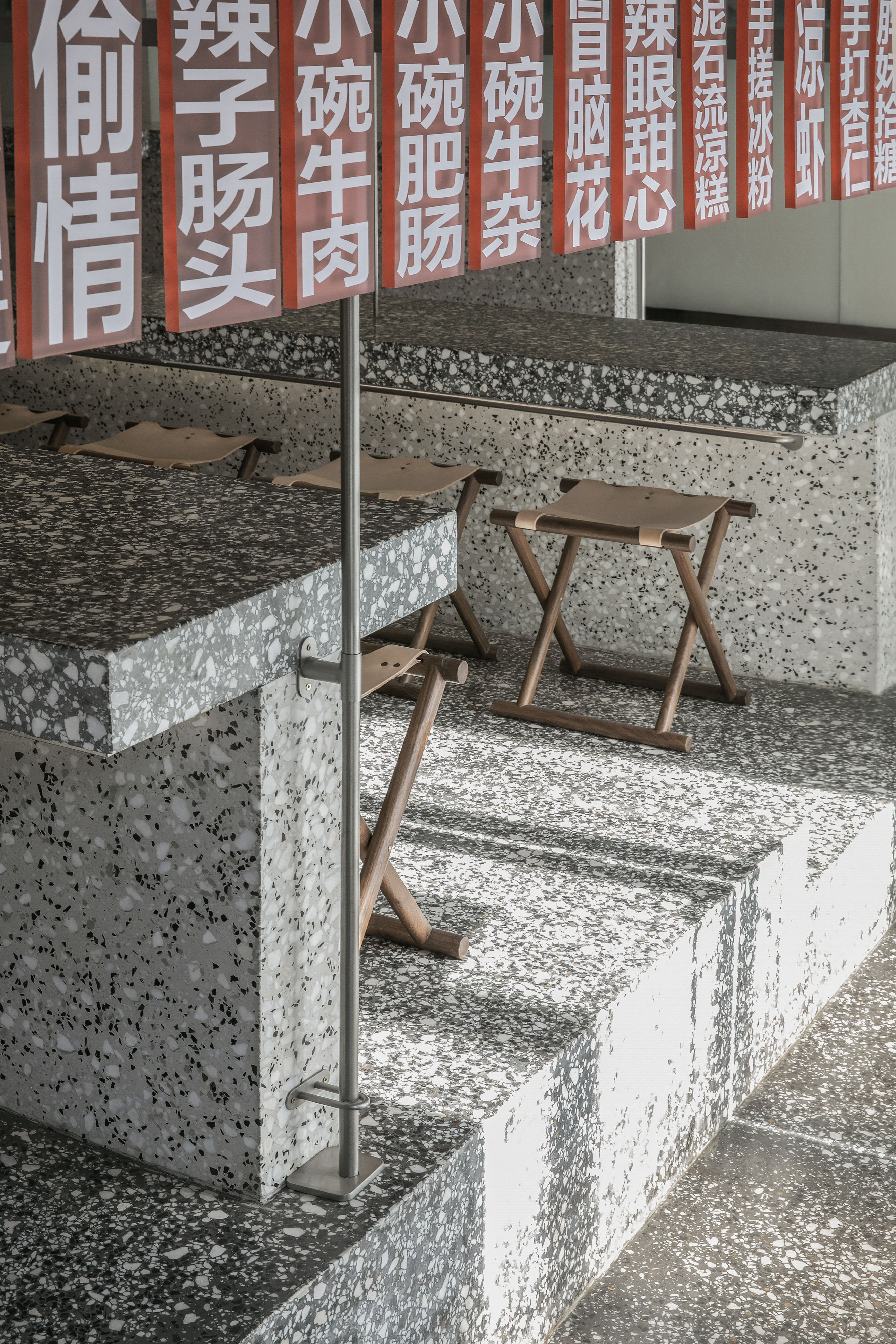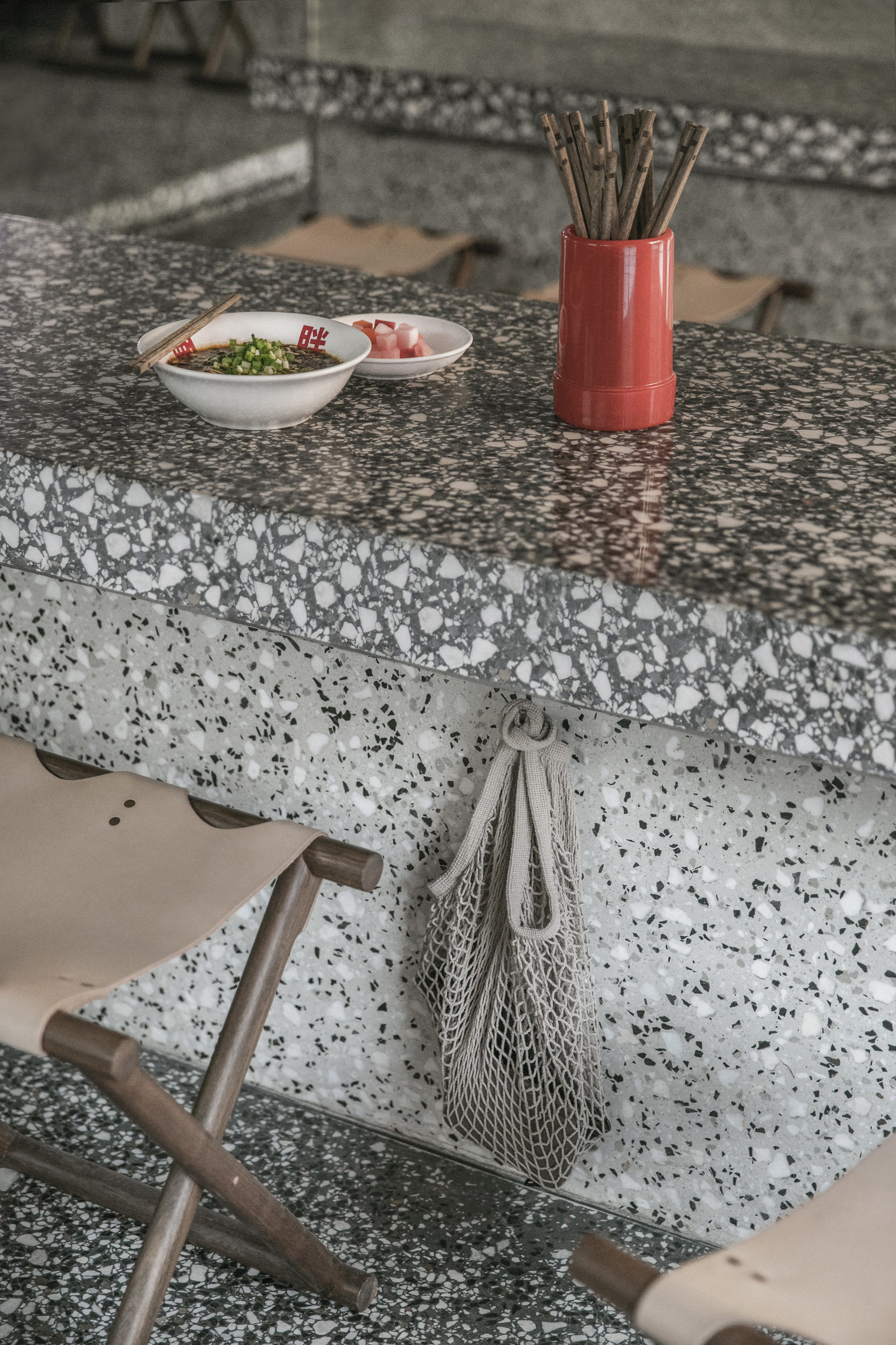 胖妹面庄内部设计由众多台阶叠搭形成,采用黑灰白的三色水磨石,为整个空间内注入起伏错落的层次感。固定的桌子也以同样的水磨石现场浇制完成。为了创造在坡地城市景观中的路边面摊就餐这一特色的重庆体验,设计中再不同的高低的平台上布置桌子,特意制作成长短不一的造型,并与桌子匹配了小吃摊常用的折叠马扎。
